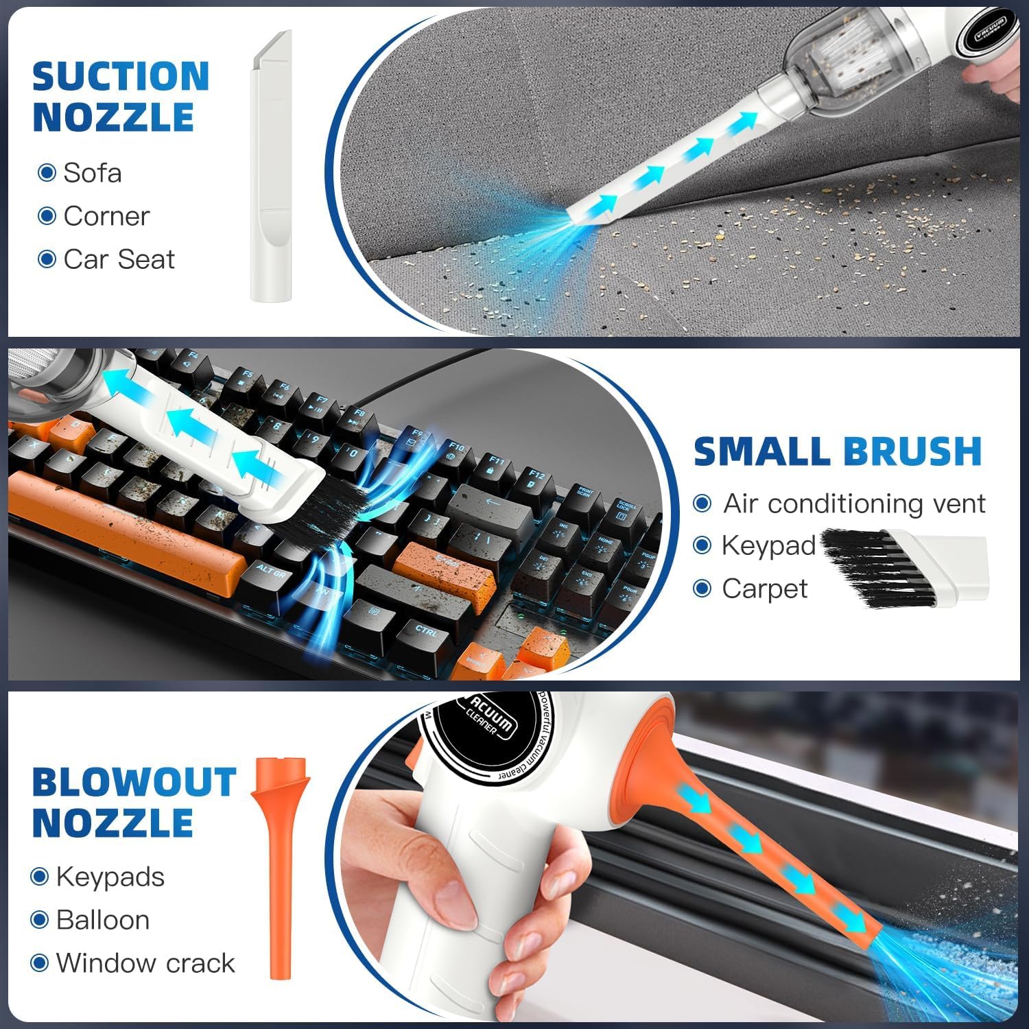 • 🌀【3 IN 1 DUST BUSTER & AIR BLOWER & HAND PUMP】The vacuum cleaner with integrated suction and blowing function is paired with different accessories to make your cleaning process twice as effective. The flat head nozzle is suitable for working on desktops, while the brush is suitable for working on keyboards, and the blowing nozzle not only deals with dust, but is also able to be used for blowing up balloons. So you only need to buy one car vacuum to enjoy 3 different effects at the same time