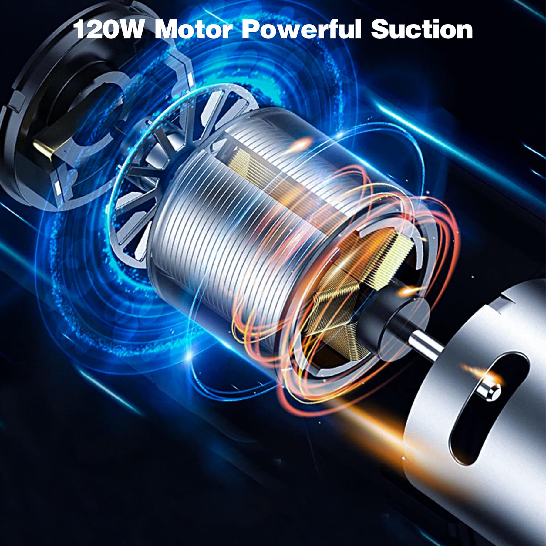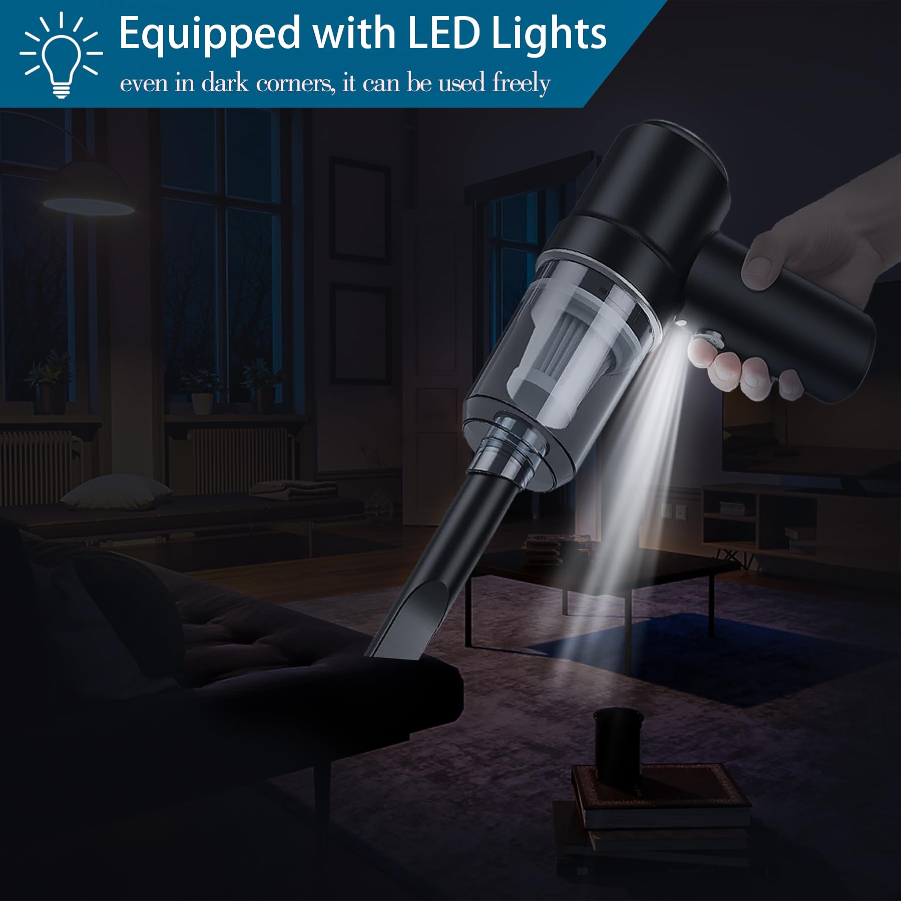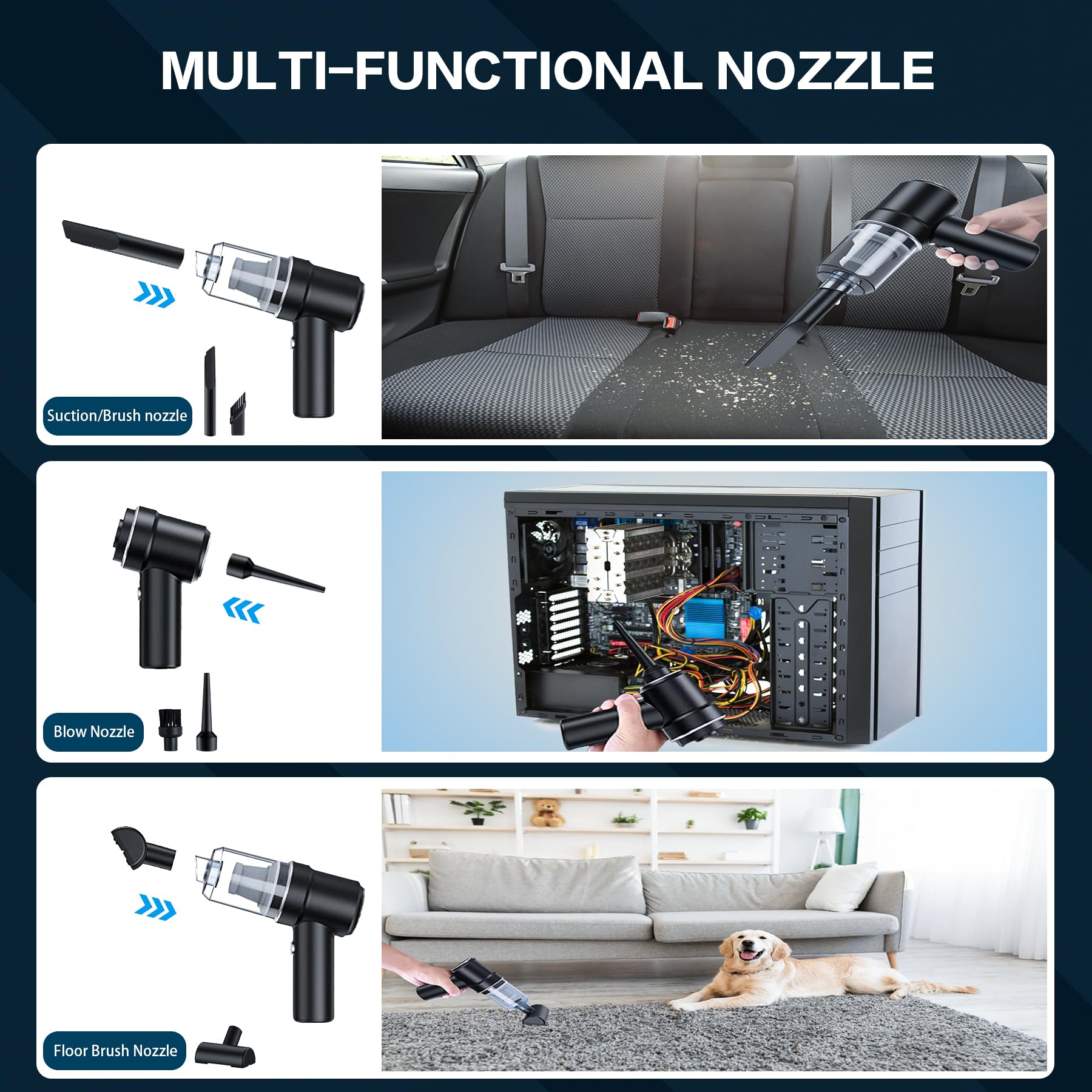 • Handheld Vacuum This mini handheld vacuum cleaner is not only a vacuum cleaner, but also an air duster. The suction power is 120W and the front end can vacuum while the rear end can blow dust, which gives you efficiently cleaning experience. It is very suitable for cleaning small gaps, such as sliding door rails, Windows, drawers, computer hosts, doors, sofas, keyboards, sewing machines, pianos, etc