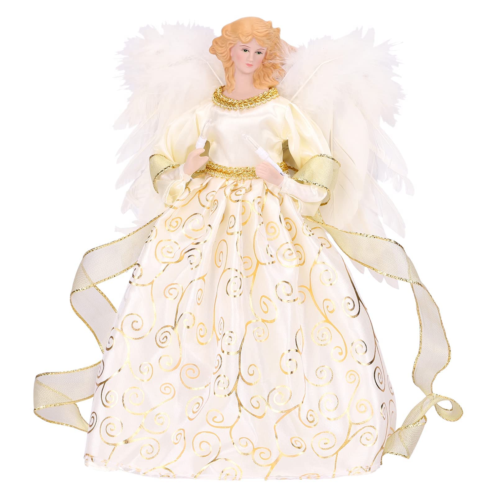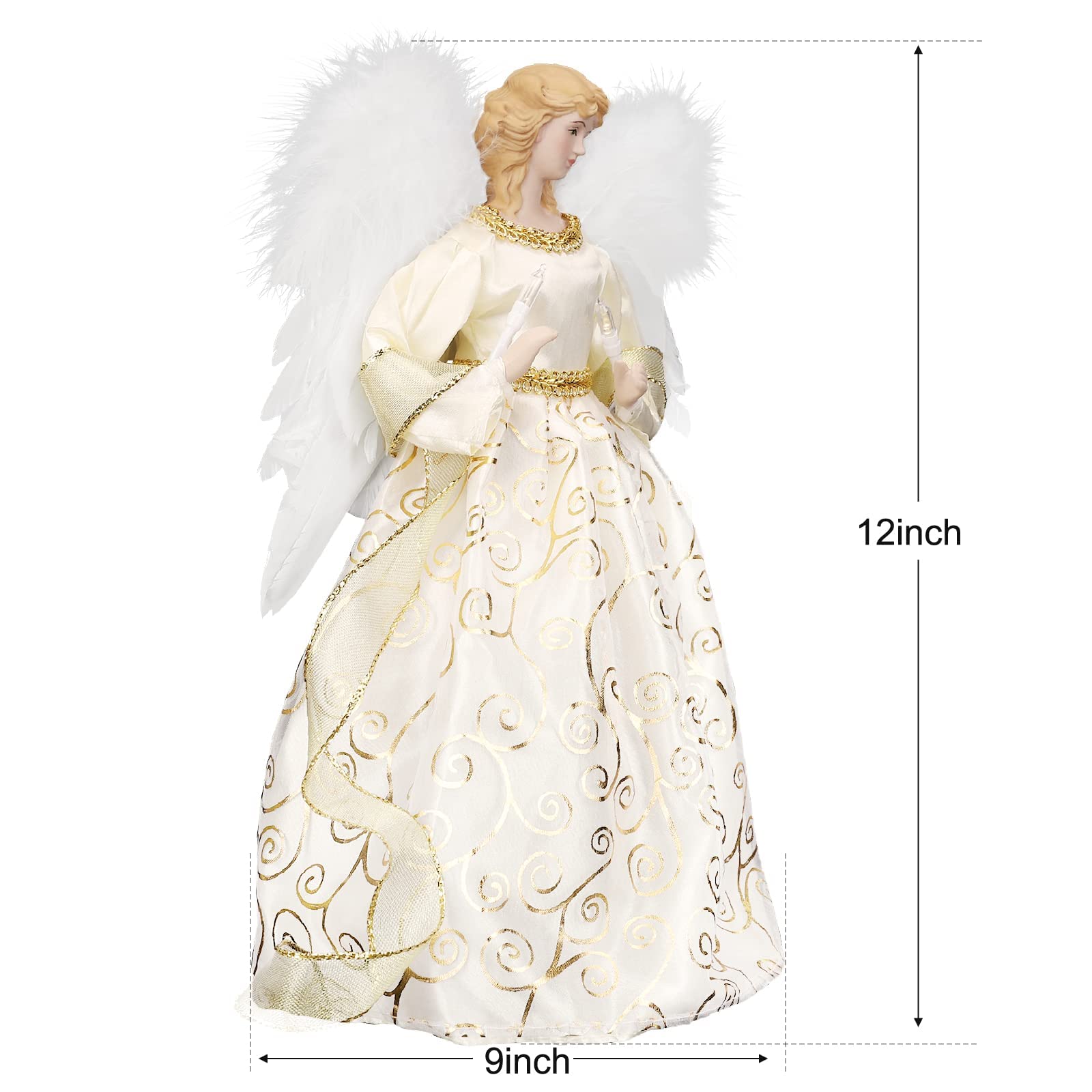 HOHOTIME 12'' Angel Tree Topper with White Feather Wings and Gold Skirt, Christmas Tree Topper with LED Light for Tree Toppers Holiday Ornament Decorations, Gold