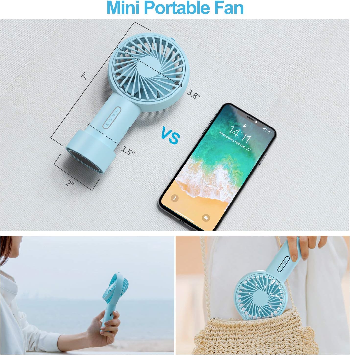 Ipow Mini Handheld Fan Personal Portable Fan 3 Speed Adjustable Angle Removable Base Lanyard Usb Recharging Battery Operated