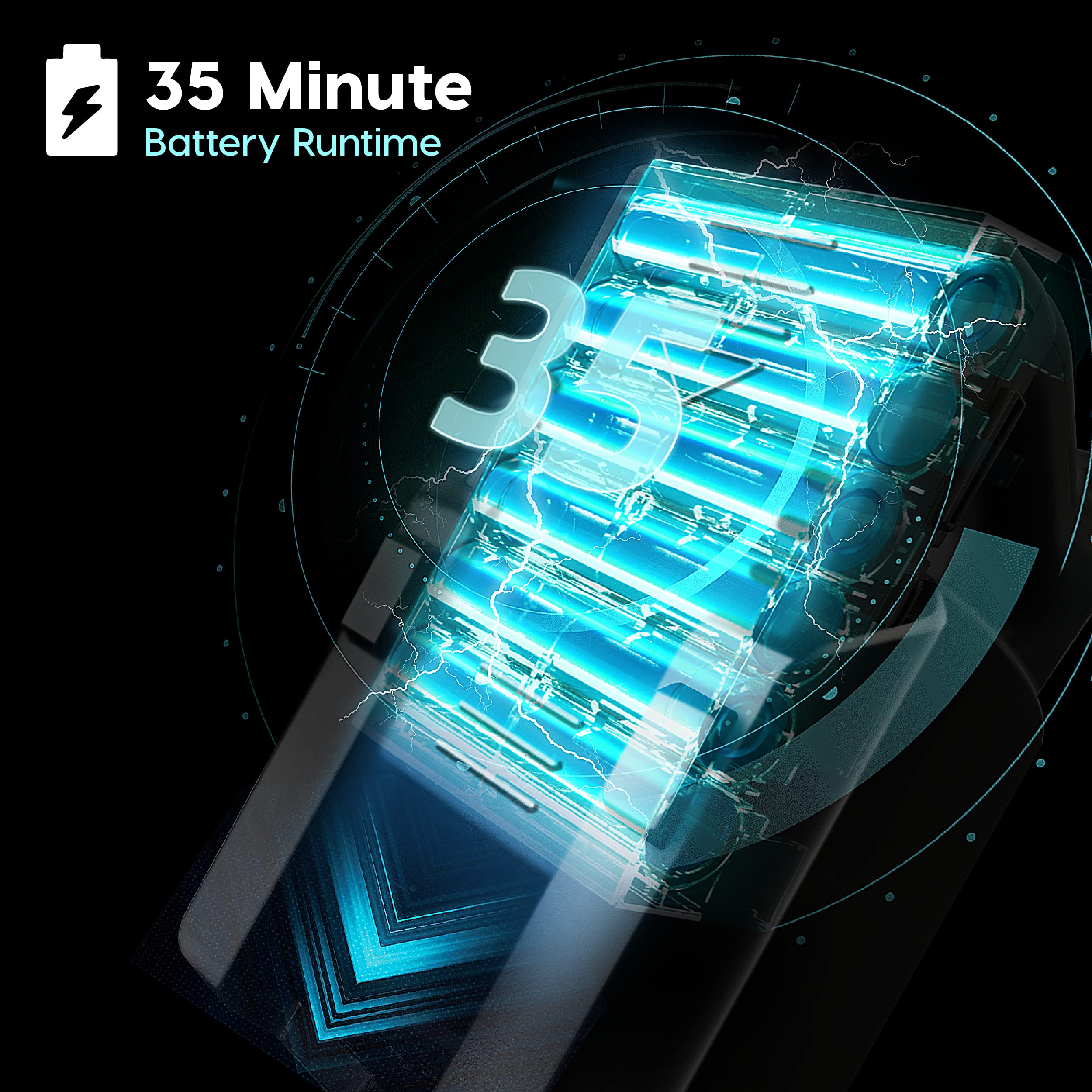 • FADE RUNTIME: The rechargeable battery runs 35 min on Low or 15 min on High on a full charge, with full suction power the whole time. The easytoread indicator on the control panel shows you how much battery is left, so you know how much clean time you have left. A full recharge of the battery takes 4 hours