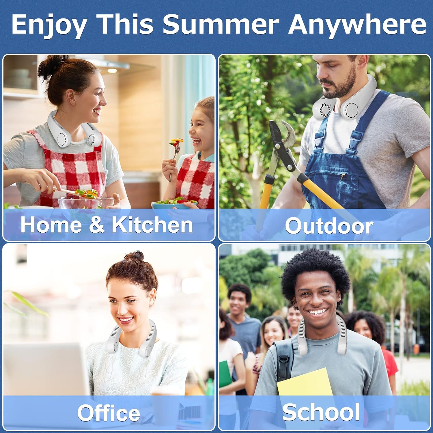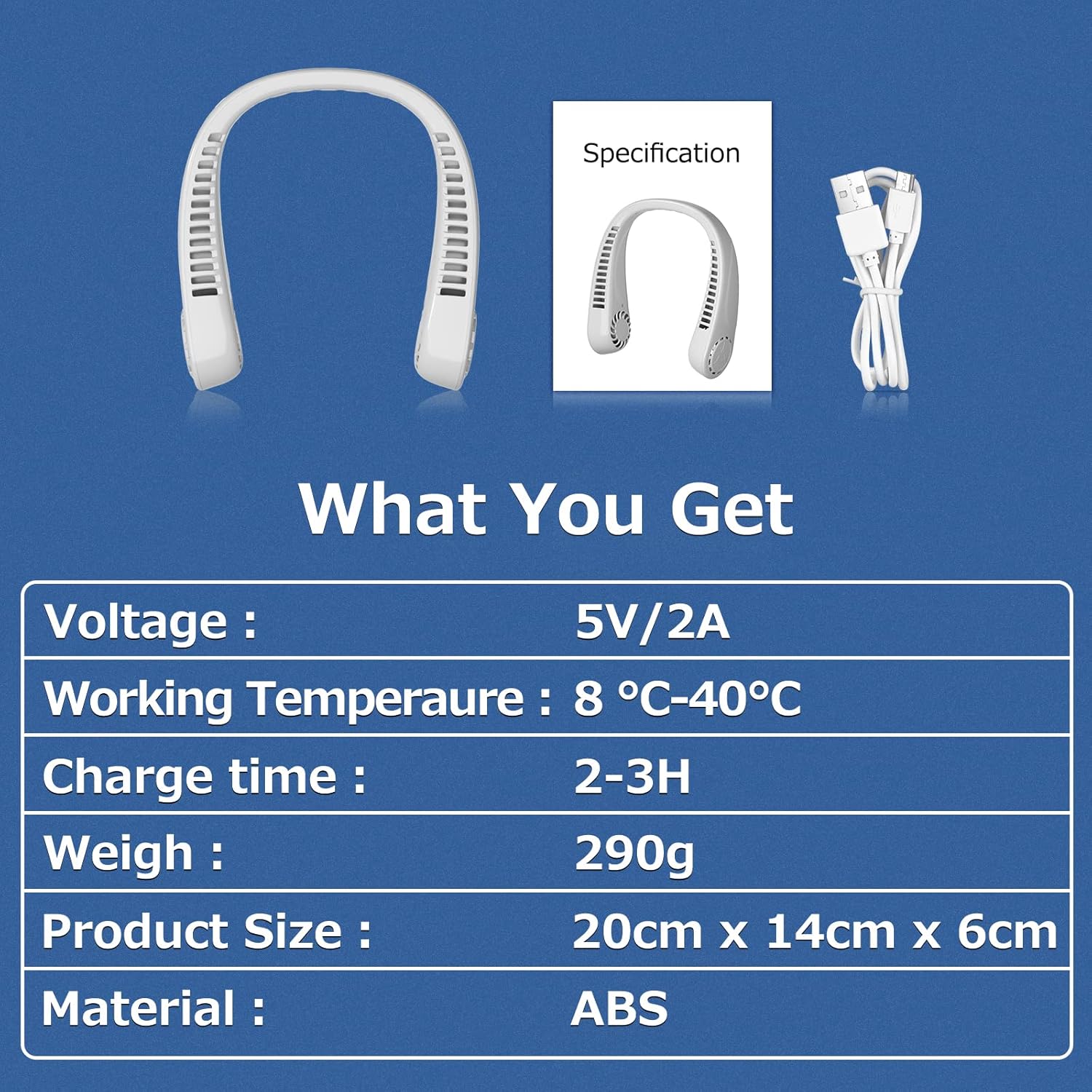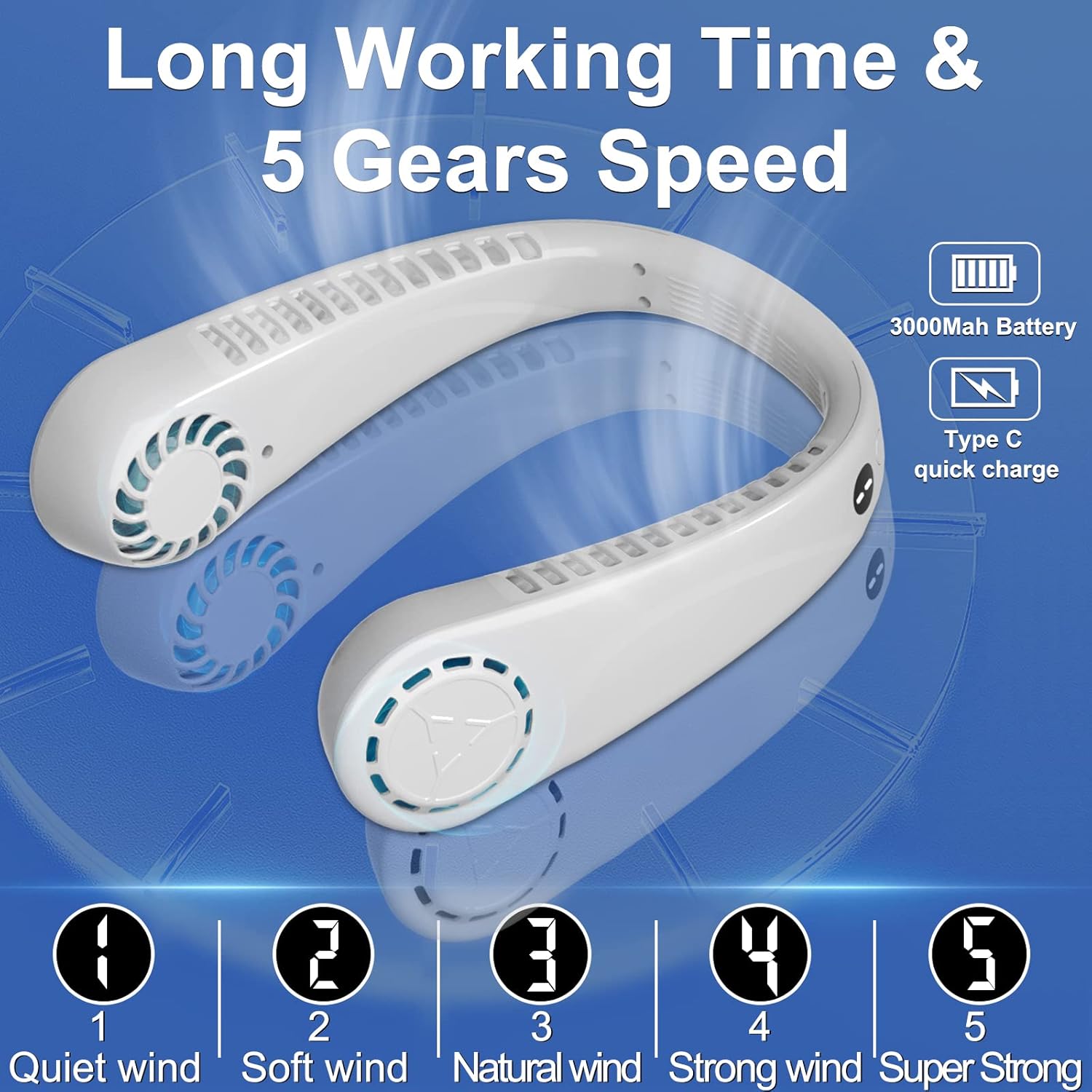 • 【 Upgraded Rechargeable Personal Fan】: Latest personal neck fan builtin rechargeable 3000mAh battery, the energyefficient battery capacity supports the neck fan to work for 28 hoursdepending on different speeds Our neck fan is matched with fast charging design that it only takes 2 hours to get fully charged for enjoy the strong airflow within a day.