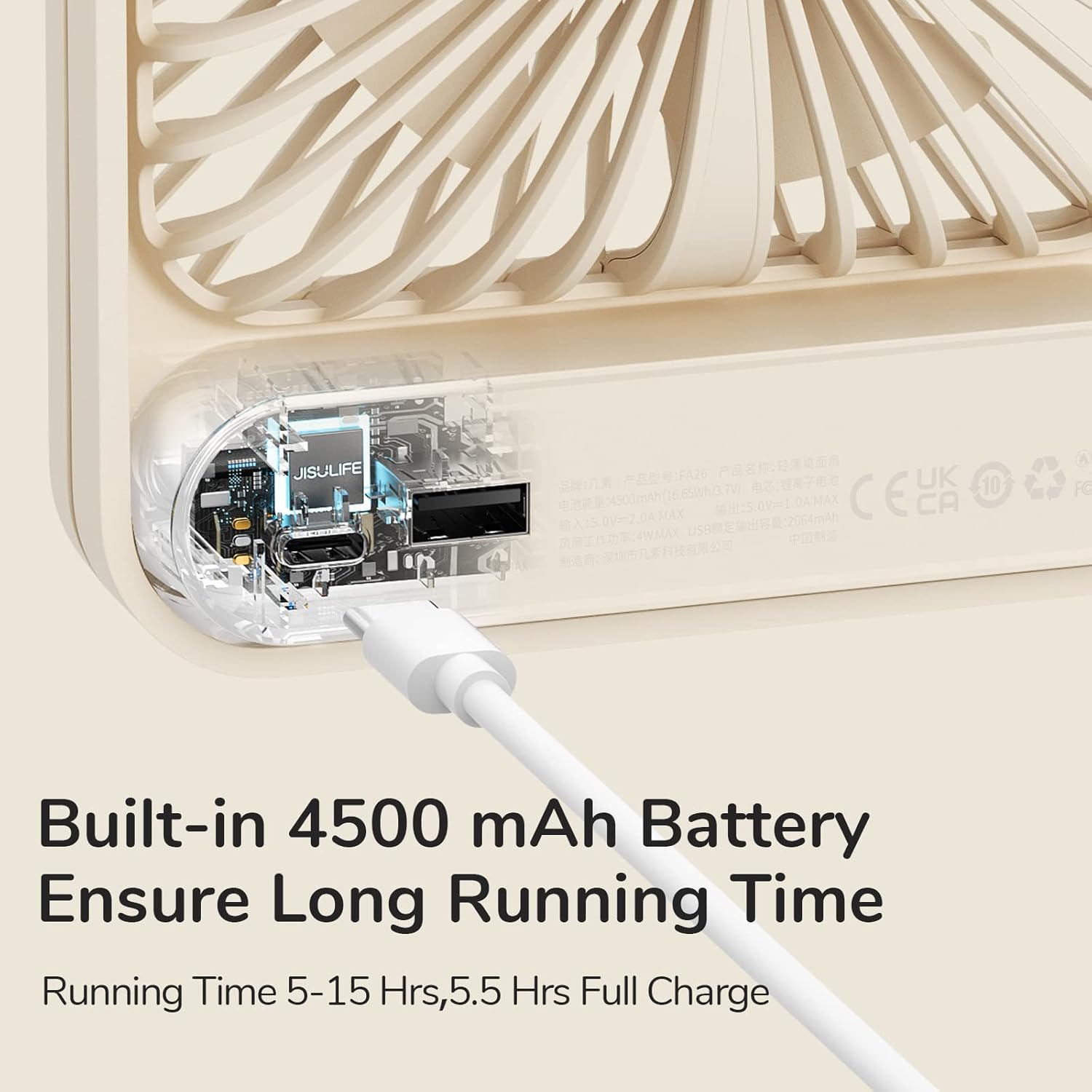 Jisulife Desk Fan Battery Rechargable Fan,4500Mah 180°Foldable Portable Personal Fan, 4 Speeds Adjustable Long BatteryLife