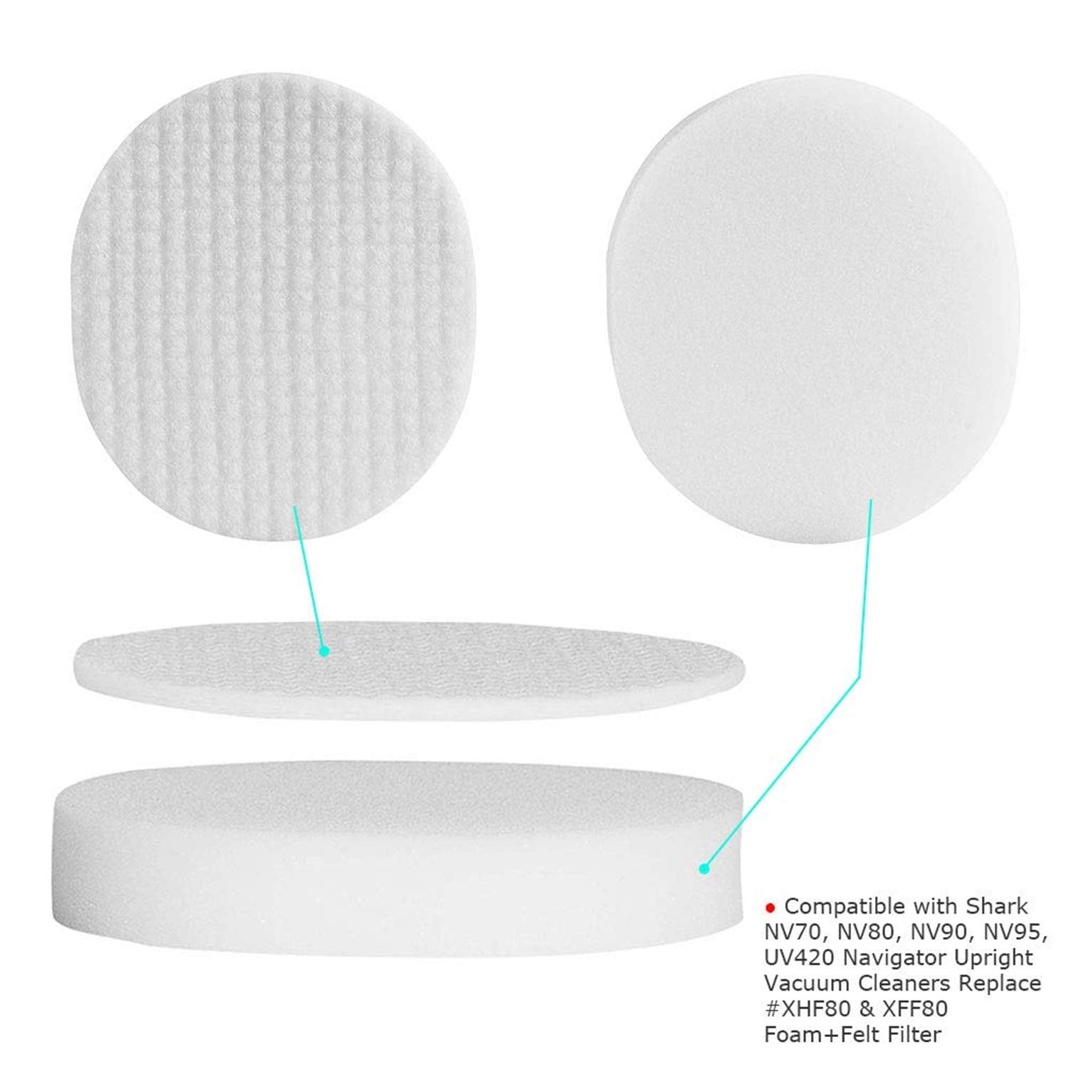 : 2 PACK Hepa & Foam & Felt Filters for Shark Navigator Professional NV70, NV71, NV80, NVC80C, NV90, NV95, UV420 Vacuums. Compare to Part XFF80 & XHF80. Compatible with: Shark Navigator Professional Upright Vacuum NV70 Shark Navigator DLX Upright Vacuum NV71 Shark Navigator Professional NV80 Shark Rotator Professional XL Upright Vacuum NV90 Shark Rotator Professional XL Upright Vacuum NV95 Shark Navigator Professional Upright Vacuum NVC80C Shark Navigator Professional UV420 Compare Part XHF80 & XFF80. Package include: 2pcs hepa filter 2pcs foam filter 2pcs felt filter Packaging may vary. If you are not satisfied with your purchase, please by email directly on . We will provide you EXCLUSIVE 6 MONTH . Highly Performance: 60 PPI Density and Ultrathick Felt Filters with a Textured Surface and Post Filters,Effectively Improves the Cleaning Performance and the Powerful Suction of Your Vacuum.