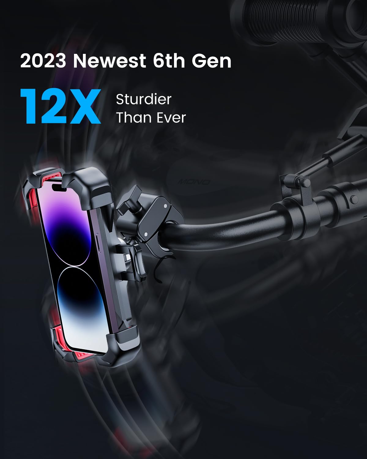 1 Click, Auto Lock- 2022 latest motorcycle phone mount features with a upgraded auto lock button. 4 arms will auto lock your phone with a click, and unlock by pressing both side. Real one hand operation. Thanks to the solid structured inner mechanism, the lock button won't get stuck (tested to stand with 3000+ times press) Hold Your Phone Like A Vise- Both the clamp and mount are cushioned for protection of the phone and handlebar. Has a high-speed lock switch, you can double lock your phone when you ride at bumpy road. No worry your phone will vibrate loose when you hit 100mps Solid Reinforced Ball-Joint- The bicycle phone mount is equipped with a upgraded robust ball part, which is made of military-grade A+ material with high tenacity, effectively solve the problem of snapping off. Good choice for long-term use 360° Adjustable- Thanks to the universal ball design, the bike cell phone holder is all-round adjustable, you can pivot the phone enough to any angle. A silicone pad is also filled into the thread, which can secure the angle from loosing up while you're riding Wide Compatibility- The bike phone holder is compatible with handlebar from 0.7” to 1.34”, you can use it on your ATV, scooter, stroller, peloton, etc. Cellphone from 4.7” to 7”, thickness (with case)≤0.71”, support iPhone,Samsung, LG, Google Pixel,Motorola,One Plus, etc. (Note: Iphone 13 pro max with otterbox case is not compatible)