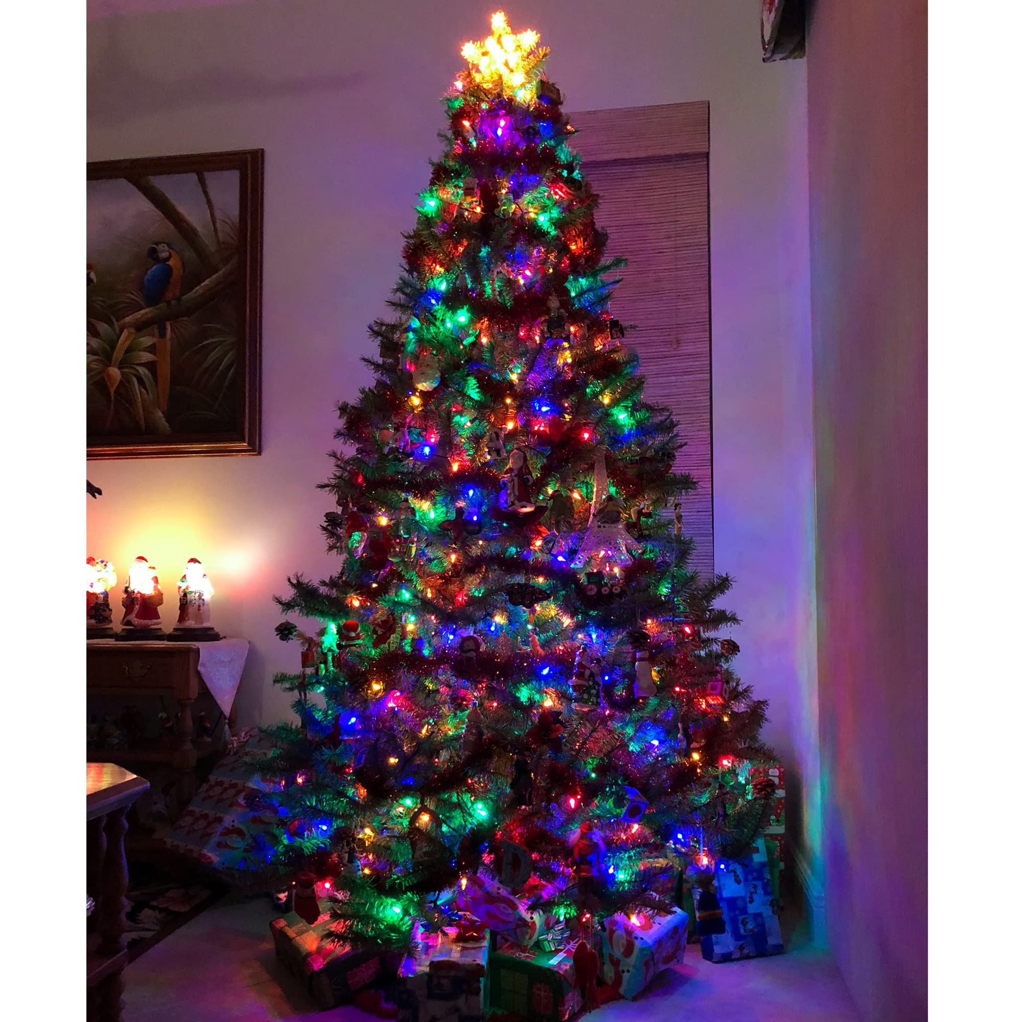 Green Artificial Christmas Tree with Lights (NOT Pre-strung): This 6 ft artificial tree equipped with 850 branch tips, and come with extra 300 LED warm white & multicolor color changing string lights with remote for you to decor, will add elegance to any space. Perfect for Christmas party, wedding, bedroom, garden, balcony, shopping malls, covered front porch staircase and many other decorations Quick & Easy Assemble: Simple to set up, tree comes in three, slot-together sections and a metal stand is included. With wire branches, please bend the tips slightly upwards or downwards to mimic a natural tree for a great display. Then winding the lights around and through all the branches of a tree Remote Control & 11 Lighting Modes Lights: With a 19 Keys wireless remote, just press to change the color and lighting mode according to the different requirements. Warm White and Multicolor(Red, Green, Yellow, Blue) in one String, choose from one of the 11 different functions for your Xmas lights for a more personalized look. The remote effective range can reach to 10ft at the longest distance, please aim the remote control at the adapter Quality & Safe to Use: The green leaves of Christmas tree are made from good PVC material, which not only makes the tree looks full and realistic, but also adds the anti-crush capacity to the tree. Its charming good looks and premium quality makes it a treasured keepsake for years to come. With low voltage adapter, the lights can keep at a low temperature state after plug in and lighting up for hours, ensure and maximize the safety Solid Metal Stand: The stand is made of heavy duty iron, which with scratch-resistant soft leather case to protect floor and legs. Notes- Please insert tree body into the iron stand, then screw the 3 bolts on and fix it properly.