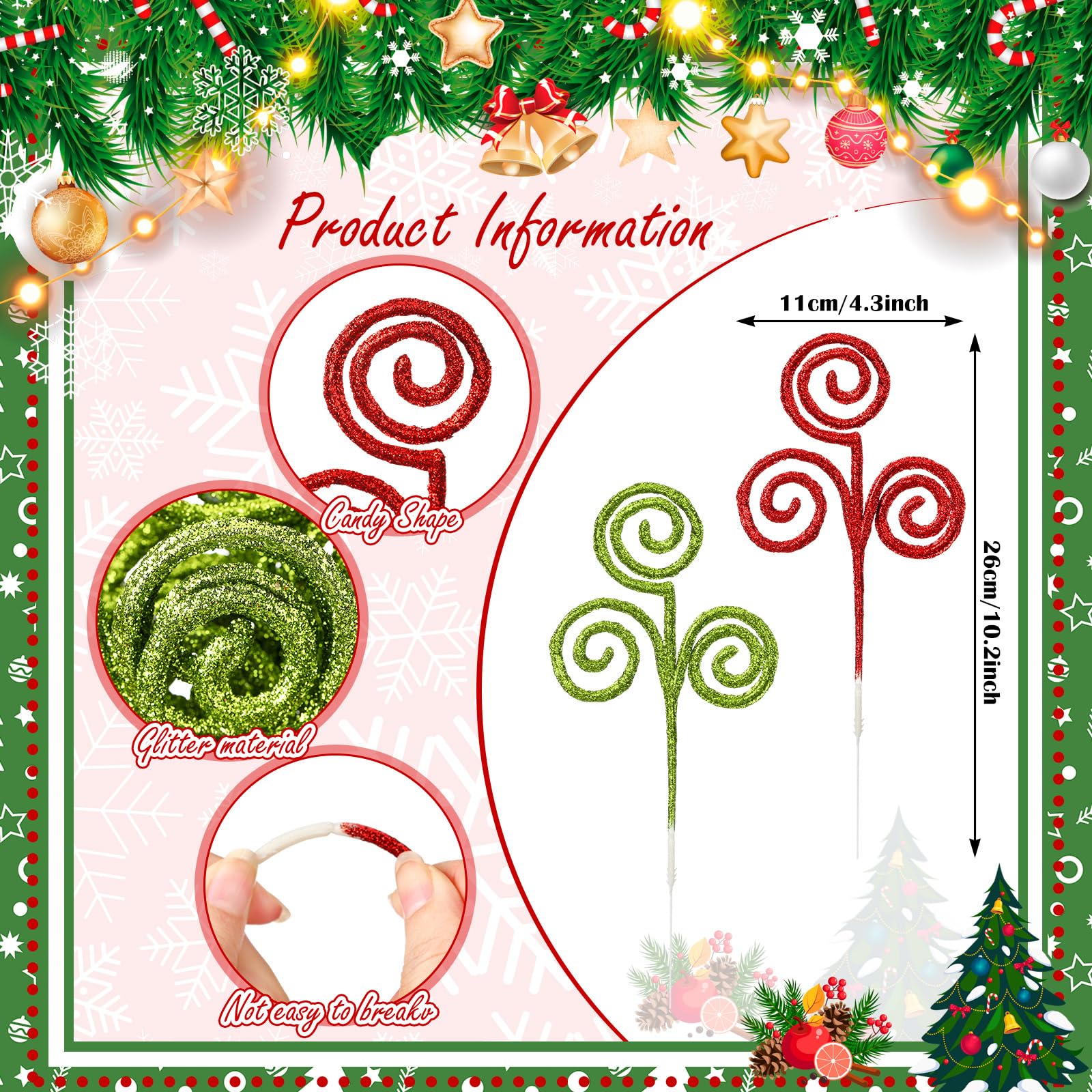 Christmas Fake Candy Picks Decorative: you will receive 50 pieces Christmas tree sticks decor, 25 red and 25 green, they can enhance the beauty of your Christmas tree This ample quantity ensures that there are enough Christmas tree picks decoration to cover any area The length of each Christmas picks is 12 inches, the ideal size for decorating your Christmas tree, wreaths, vases, and more Candy Shape Glitter Design: these Christmas tree topper picks are curled into candy shapes, full of delicate and sweet atmosphere Each red green Christmas pick is coated with glitter metallic powder on the surface, shiny and eye catching, adding a festive touch to most Christmas settings If there is some glitter dropping during transportation, you can shake it off gently in an open place