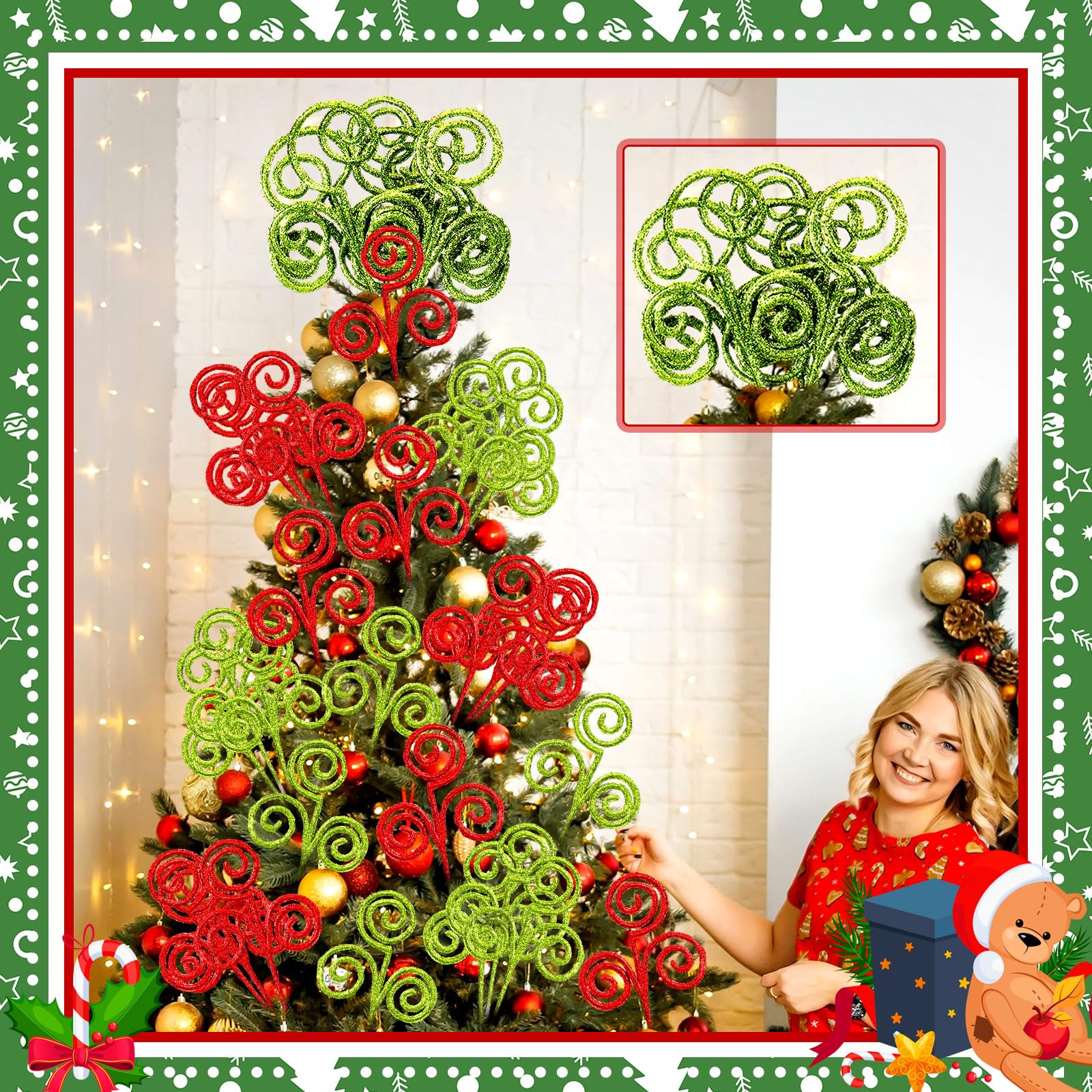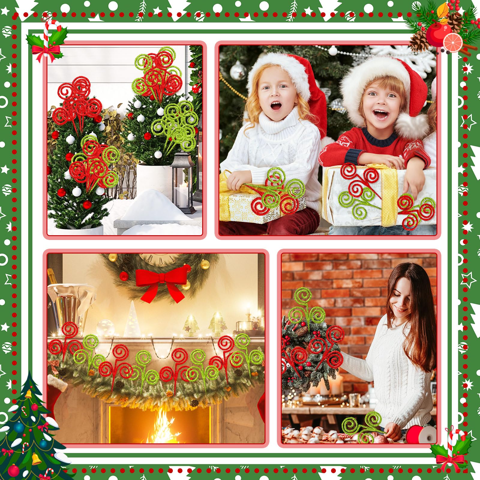 β’ Multiple Uses: these Christmas spiral picks are ideal DIY props, with classic Christmas red and green color, you can use your imagination to insert them into wreaths, Christmas trees, vases to create beautiful Christmas decorations, nice to blend in with your surroundings You can also use them as decorations on your Christmas clothing and boxes, which looks more romantic and exquisite