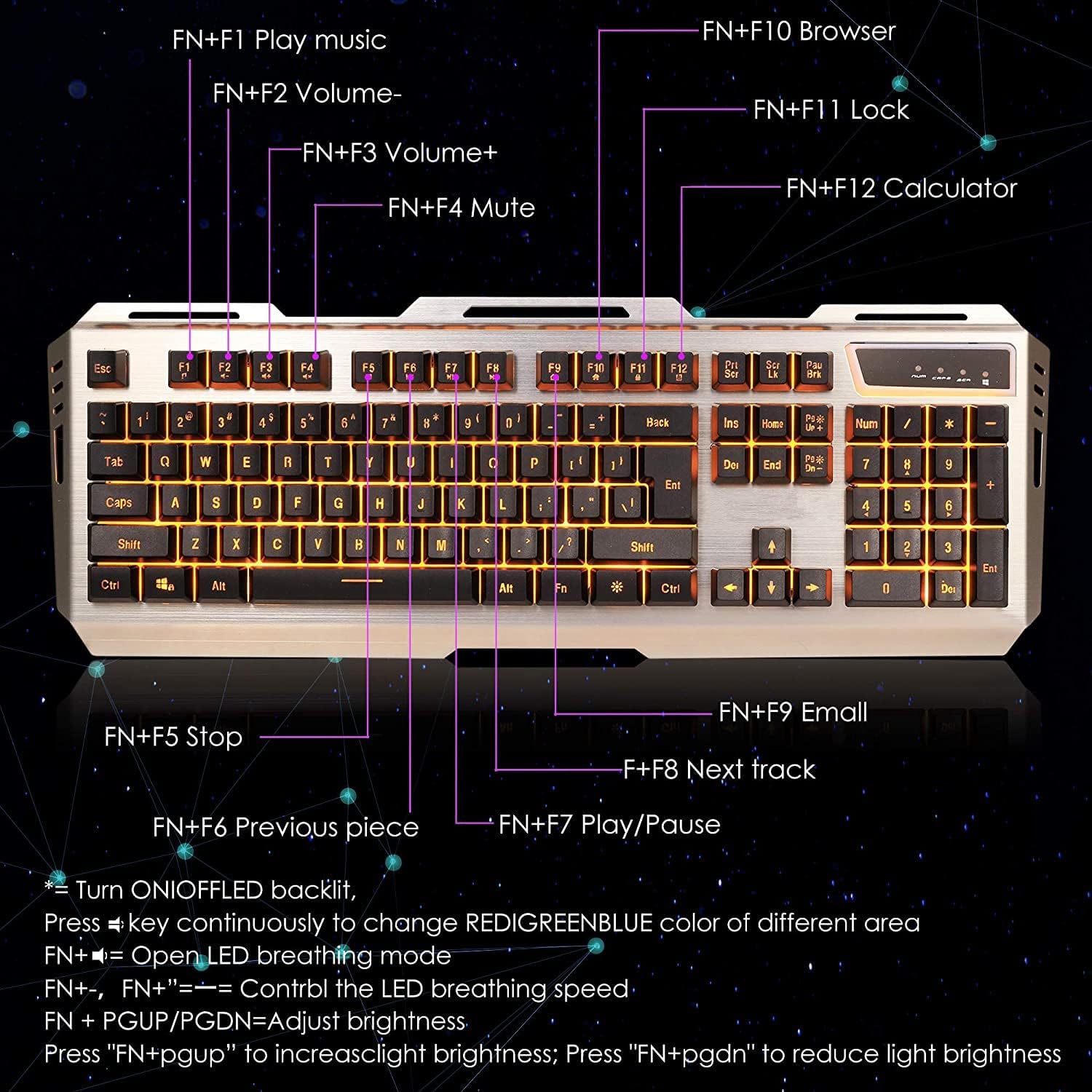 • ▶Orange Keyboard Full of Science Fiction:Unlike some plastic USB keyboards on the market,the frame of this upmarket white keyboard and mouse combo is dominated by silverblack metallic solidity,made in a cool shape to symbol the look into the future.Warrior worn metal armor may have made the gamers feel safer,it's also very attractive for science fiction and fantasy fans.the bright lights would take players into rainbow world where gamers feel most futuristic