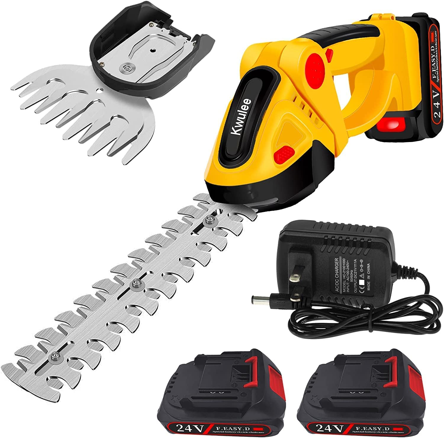 KwuLee 24V Cordless Hedge Trimmer & Grass Shear, 2 in 1 Handheld Shrubbery Trimmer Electric Grass Trimmer, Lightweight & Safe Grass Cutter/Hedge Shear with 2 Pcs Rechargeable Batterys and Charger