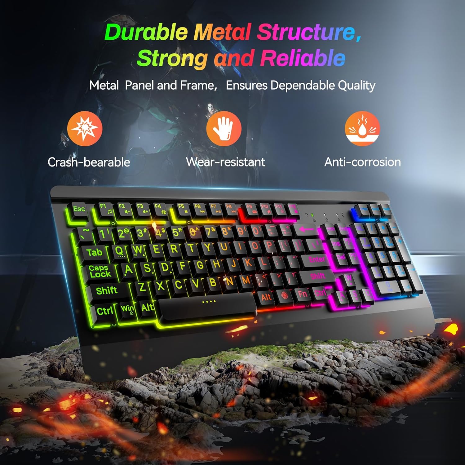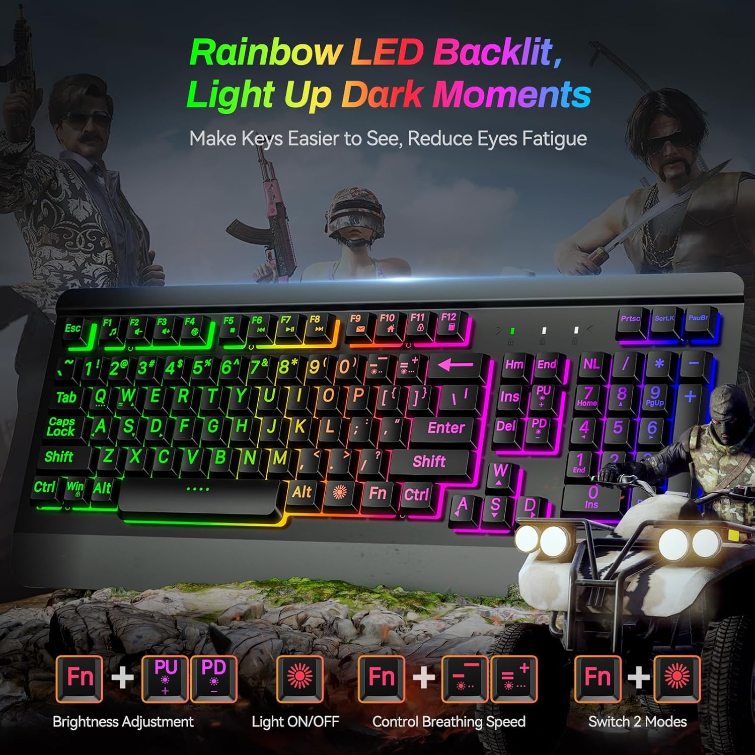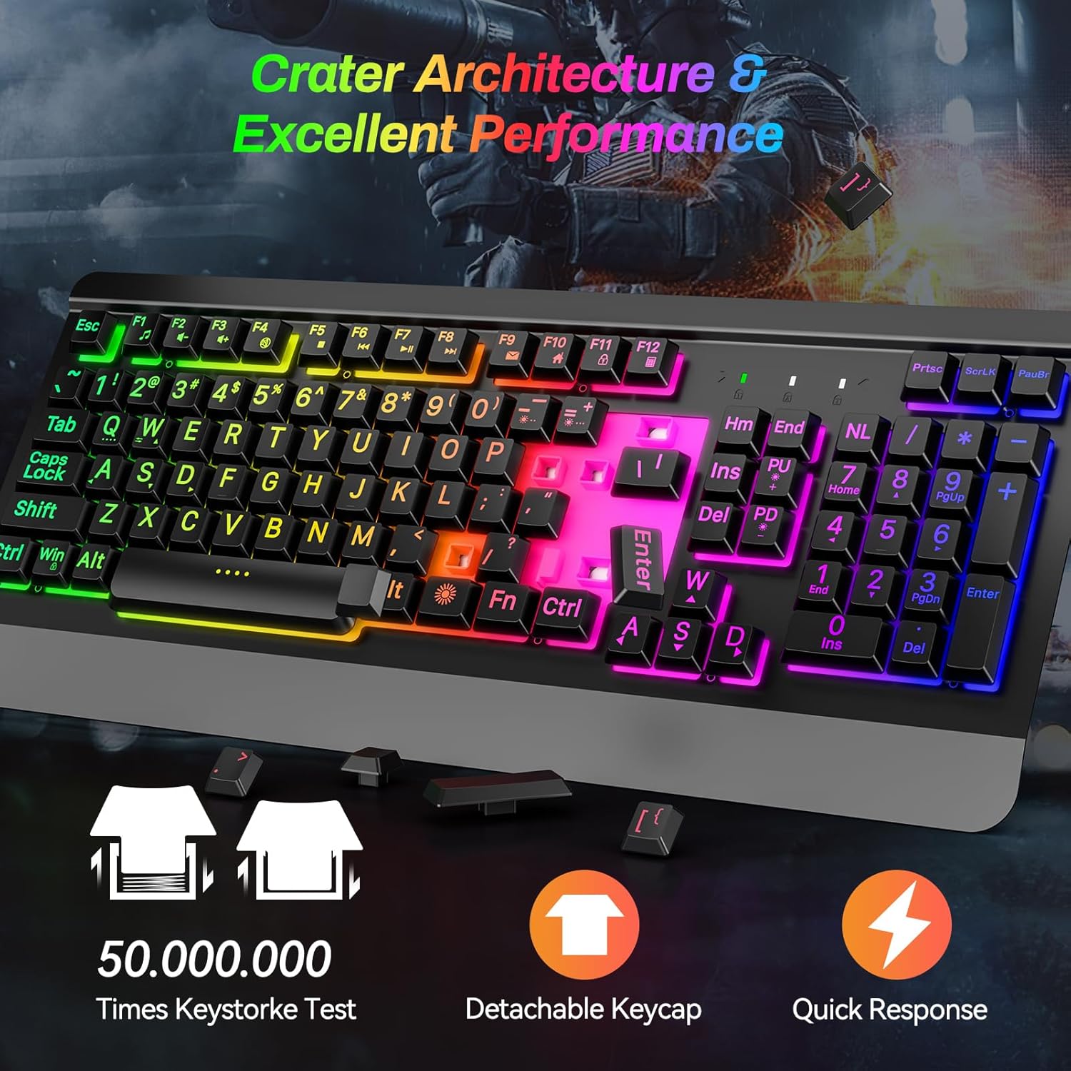 Large Print Rainbow Backlit Gaming Keyboard, Wired USB Light Up Computer Keyboard with Big Letters Keys,12 Multimedia Keys, Wrist Rest, All-Metal Panel,Full Size Keyboard, for PC,Laptop