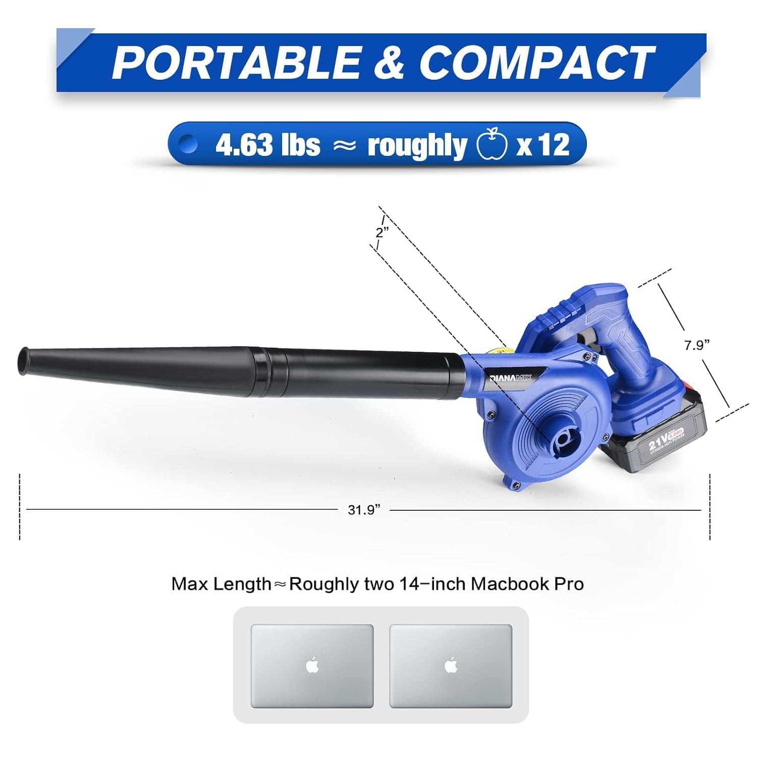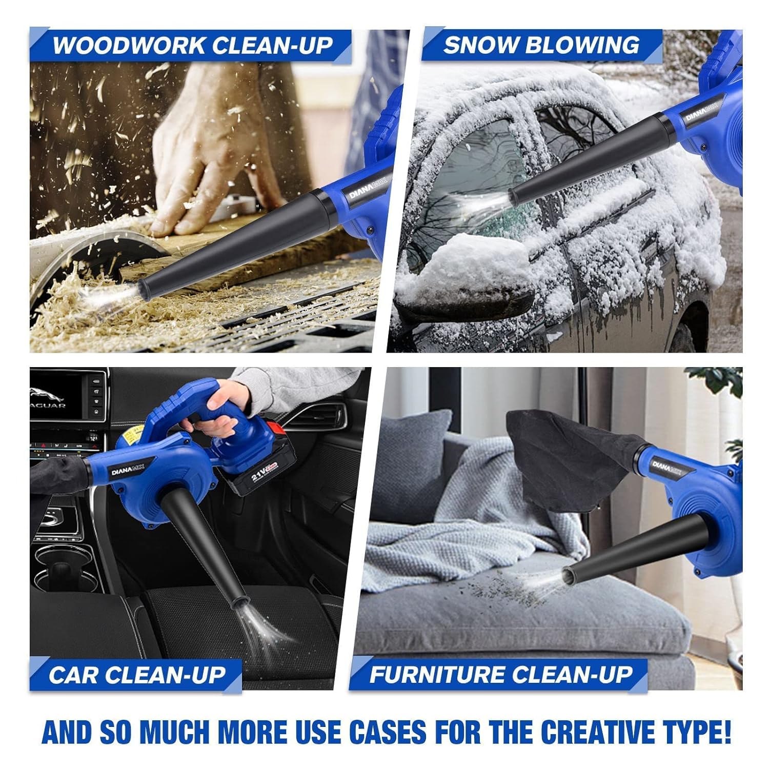 Powerful 2-in-1 Battery operated leaf blower and Vacuum KitYou may enjoy extensive application with this tool: lawn care, leaf/snow/dust removal, industrial applications such as for on-site construction and sweeping off saw dust for carpentry and so much more.Dianamix cordless leaf blower kit includes everything you will needed, so that you immediately can start your work in less than one minute of receiving it. No extra purchase on accessories is needed like other brands.Dianamix electric leaf blower is your choice - our cordless blower conveniently has a vacuum function built in, with dust bag included to collect debris.Dianamix: A registered brand of a leading manufacturer in professional electric tools with over 18 years of experience.Stay tuned to see some more creative uses in our customer reviews and upcoming videos!