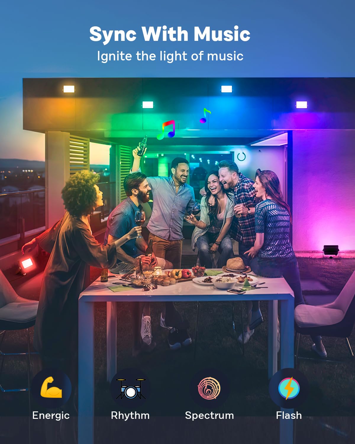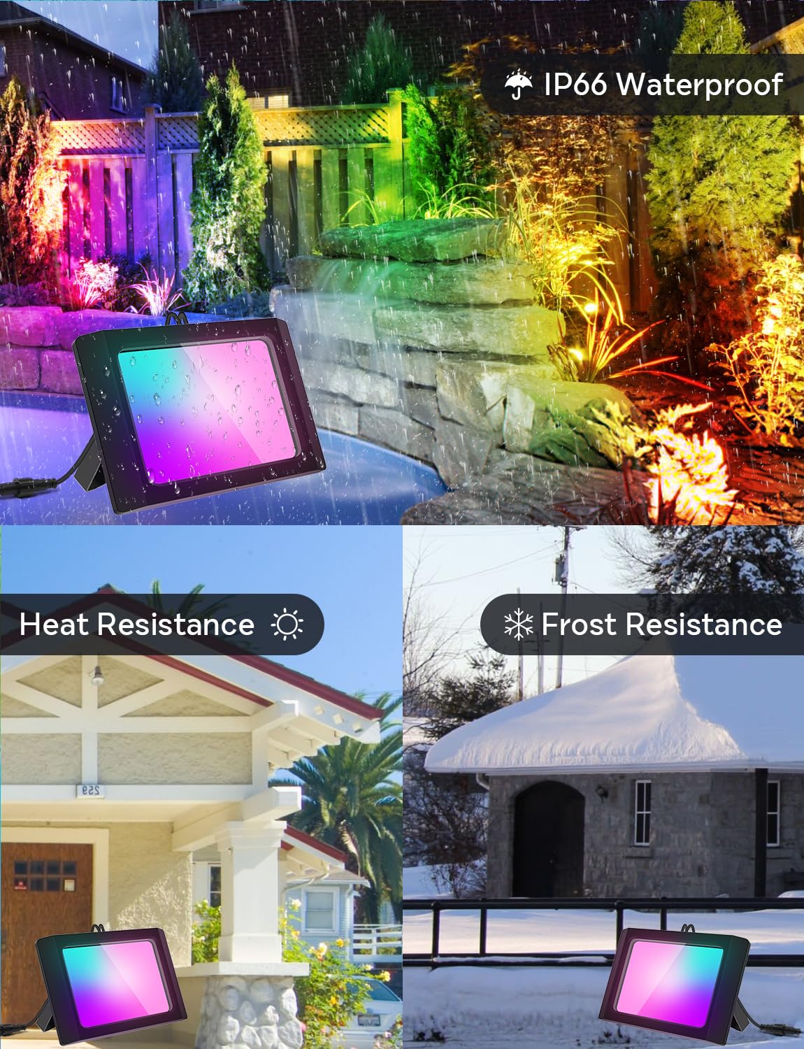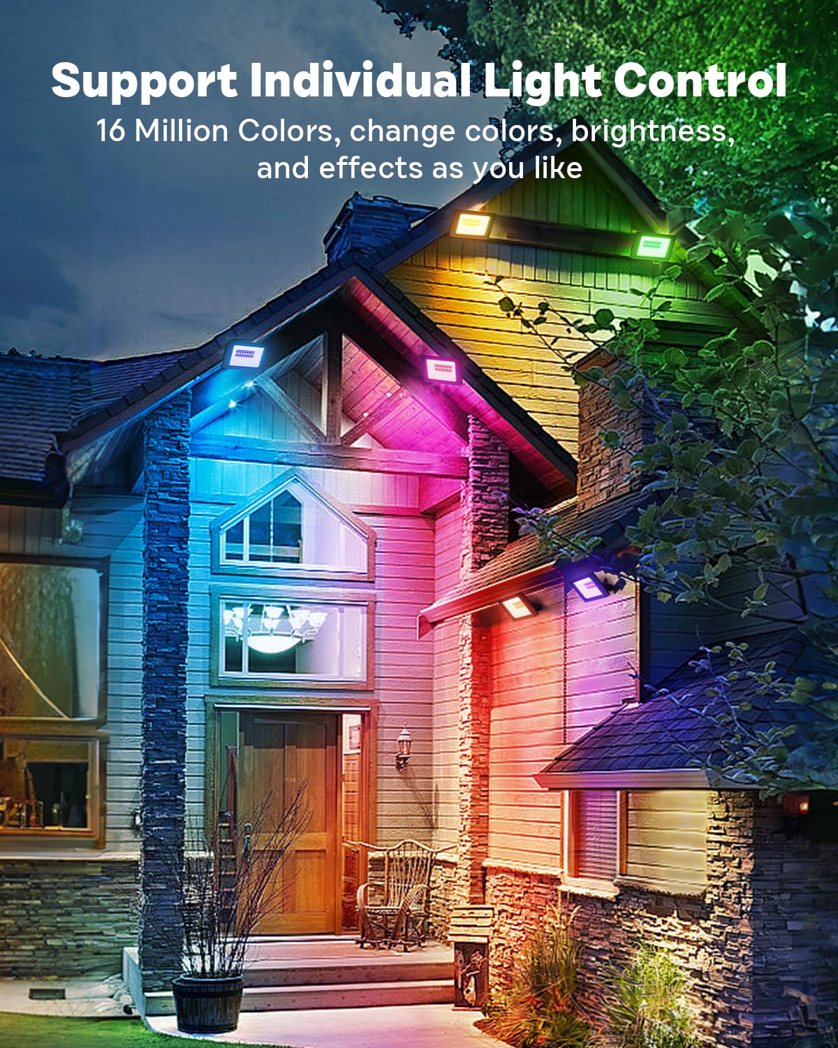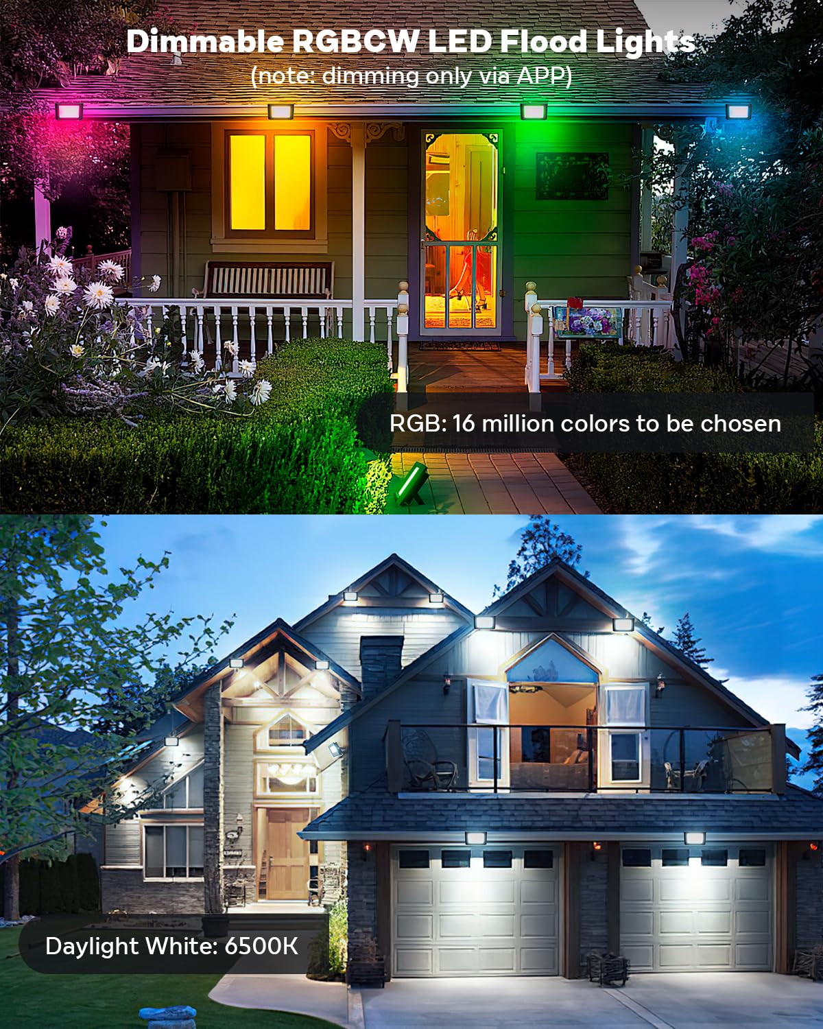 • 【DIY Scenes Meet Your Various Needs】With its Scenes function, you can choose from many pre-set lighting scenes or you can set the color or mode for each RGB floodlight individually to create the perfect ambiance, then match it to your favorite scenes (such as party, BBQ, garden, garage, tree lights, up lighting for wedding, Halloween decorations lights, Christmas lights, Valentine's Day decoration, etc), save it and activate it with one click at any time. Our LED flood lights outdoor is a great atmosphere creator.