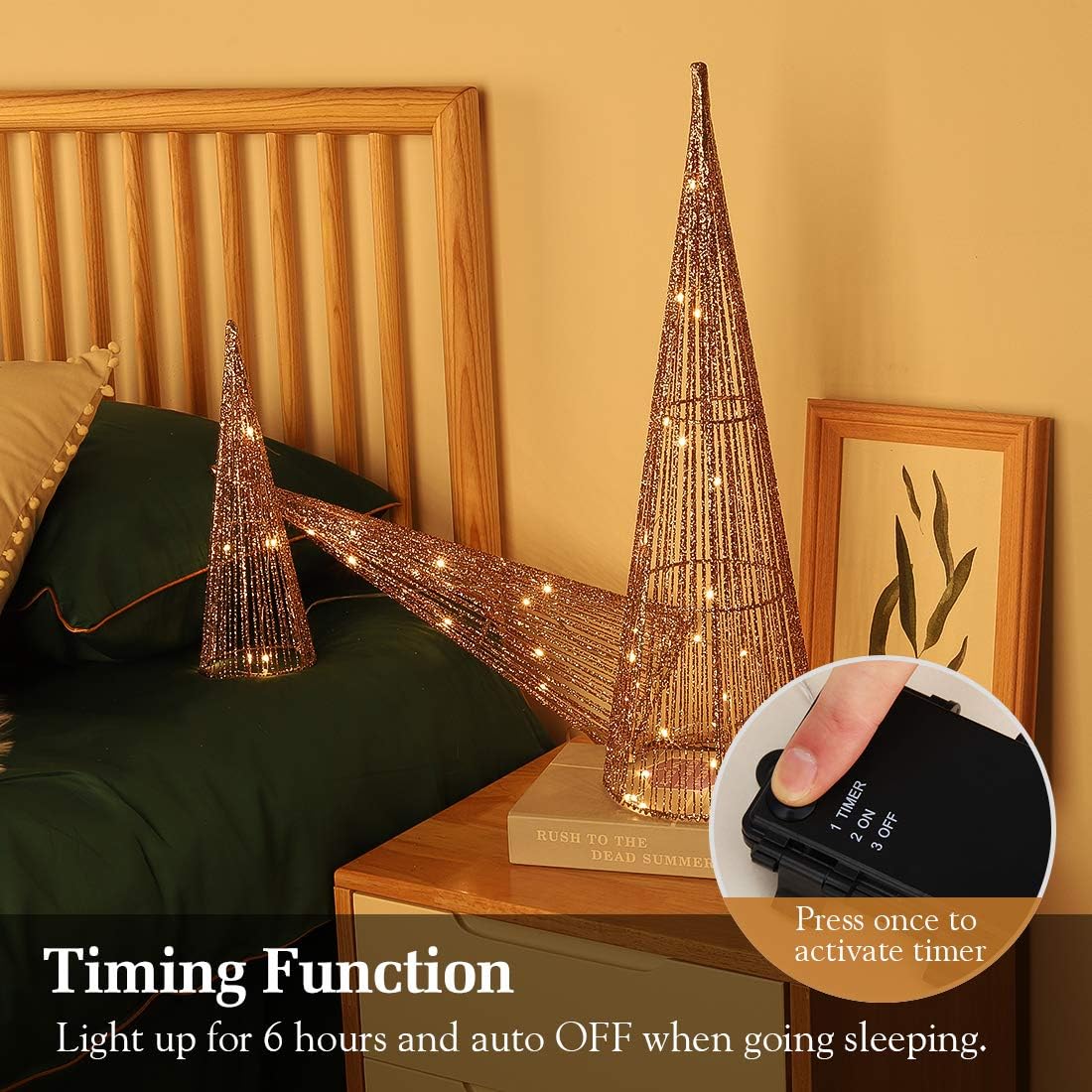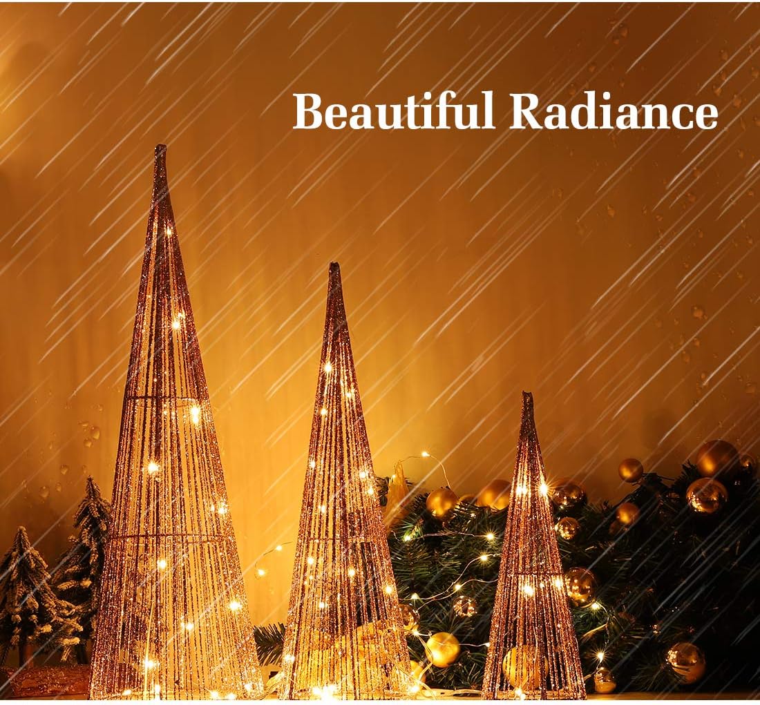 Lewondr Christmas Cone Trees, Set of 3 Christmas Tree with Lights and Glitters(24"/18"/12"), Battery Powered Decorative Straightened Thread Christmas Tree for Home Holiday Xmas Décor, Champagne Gold