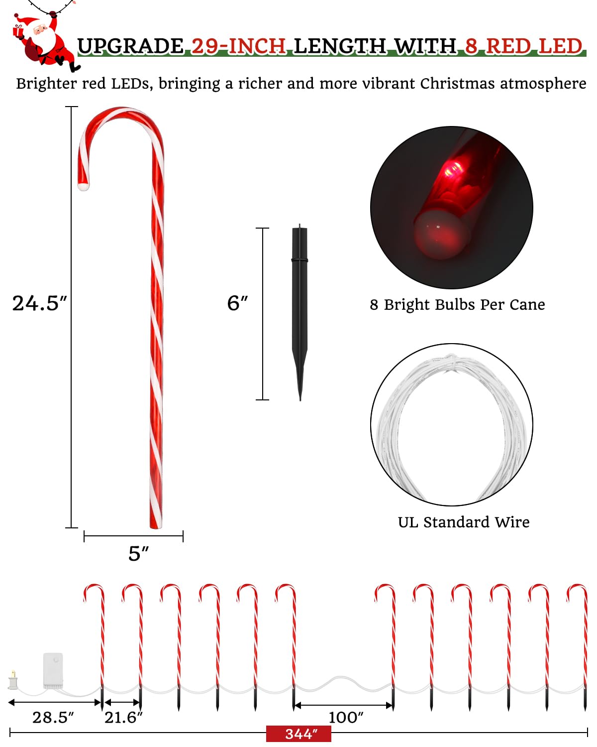 AMAZING CHRISTMAS DECORATIONS: Each Christmas pathway lights outdoor package contains 12 stakes and with 8 red LED for each stake, total 96 LED. Each light up candy cane is 24.5 inches in height, total is 29inch with stake. 8 LIGHTING MODES: More options, more enjoyment. Our Christmas lights can be lit in 8 different modes of your choice, including steady on, twinkle, slow fade, chase, slo glo, sequential, in wave, combination. This will bring a varied and unique festive atmosphere to your Christmas decoration.