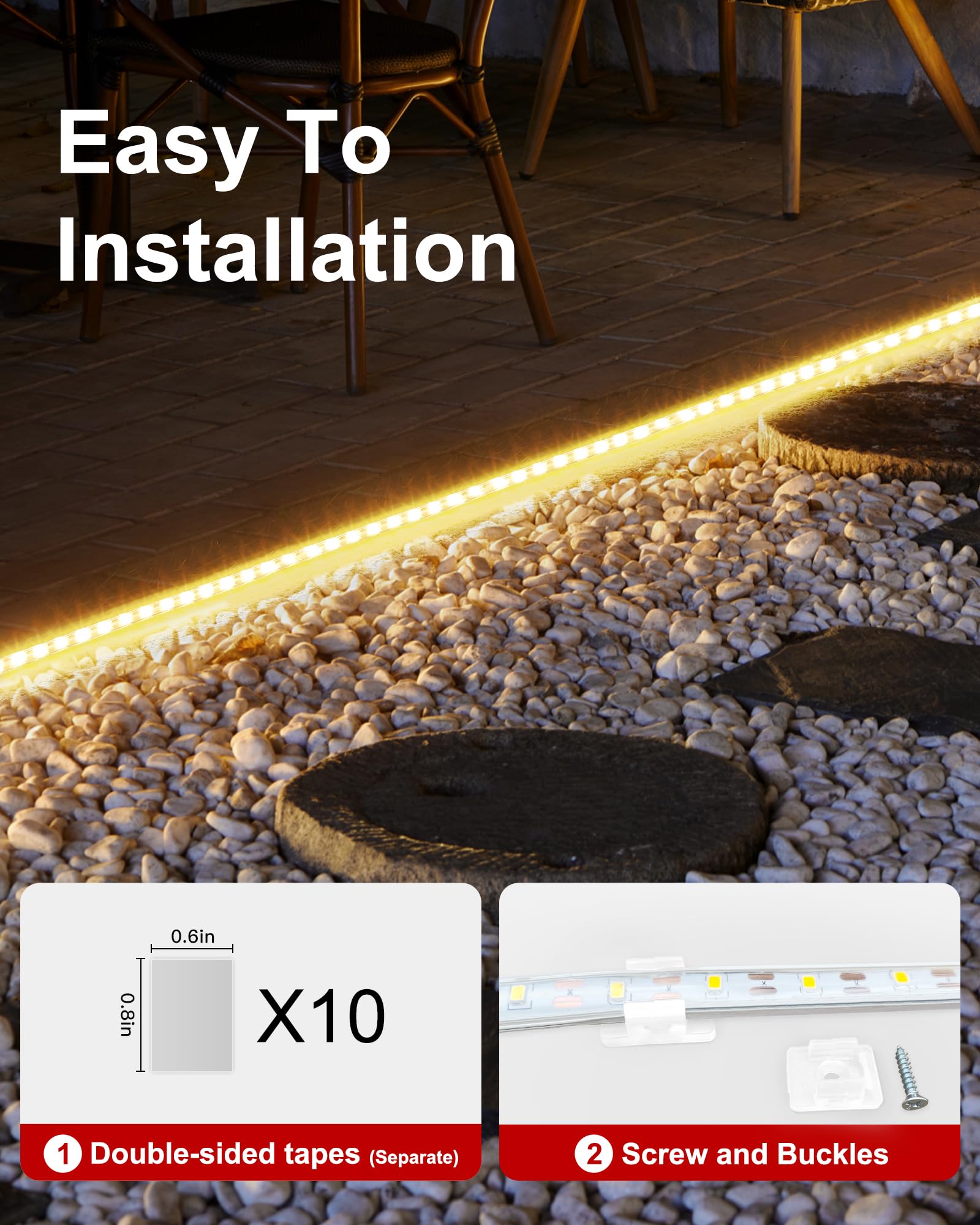 • 【IP65 Waterproof 】:Our solar strip lights outdoor waterproof are fully covered with strong PVC material,they are suitable for both indoor and outdoor decoration, great for your patio,backyard,deck,railing,walkway,trampoline,pergola,lawn,camping tent,shed,porch,chicken coop decor lighting.