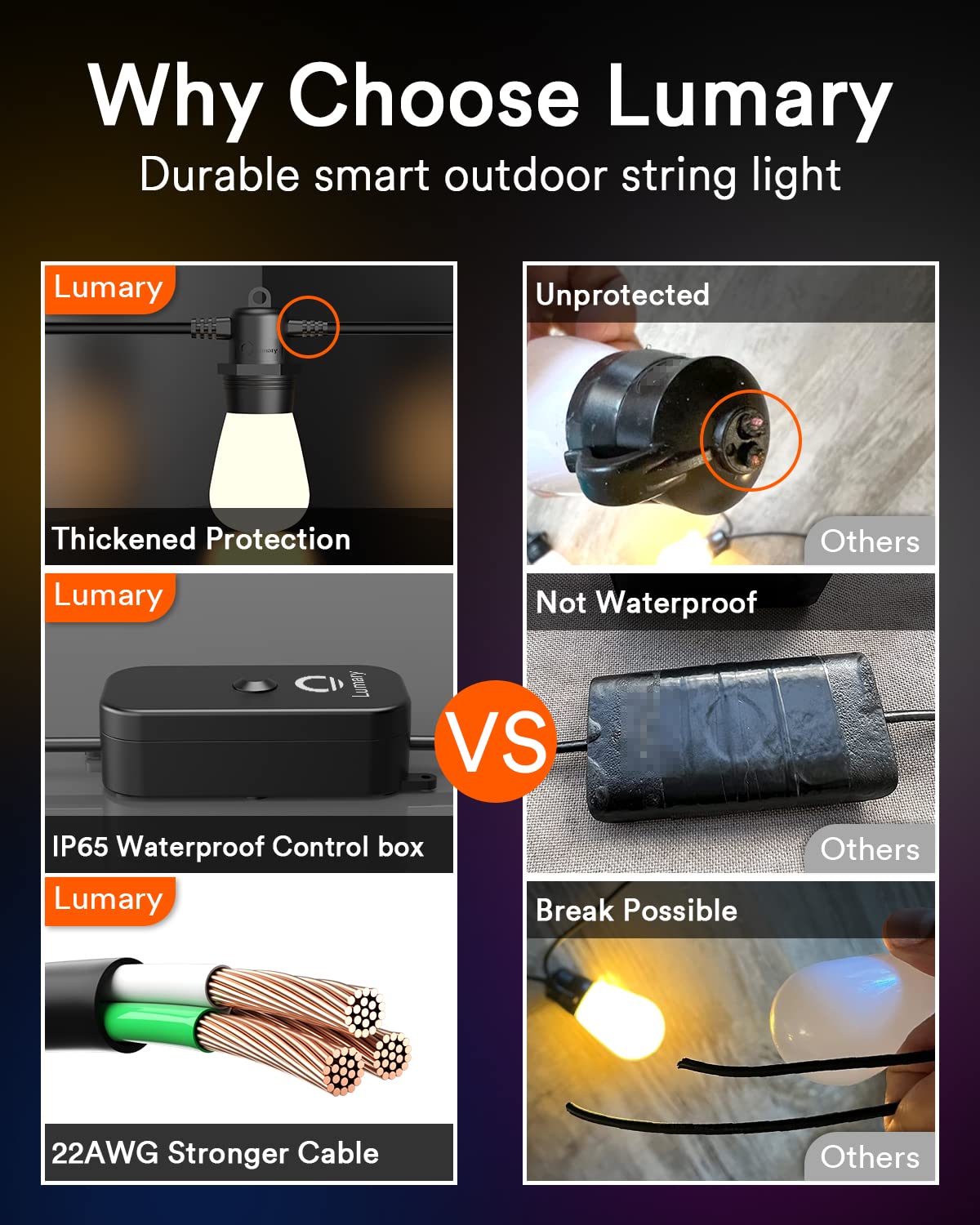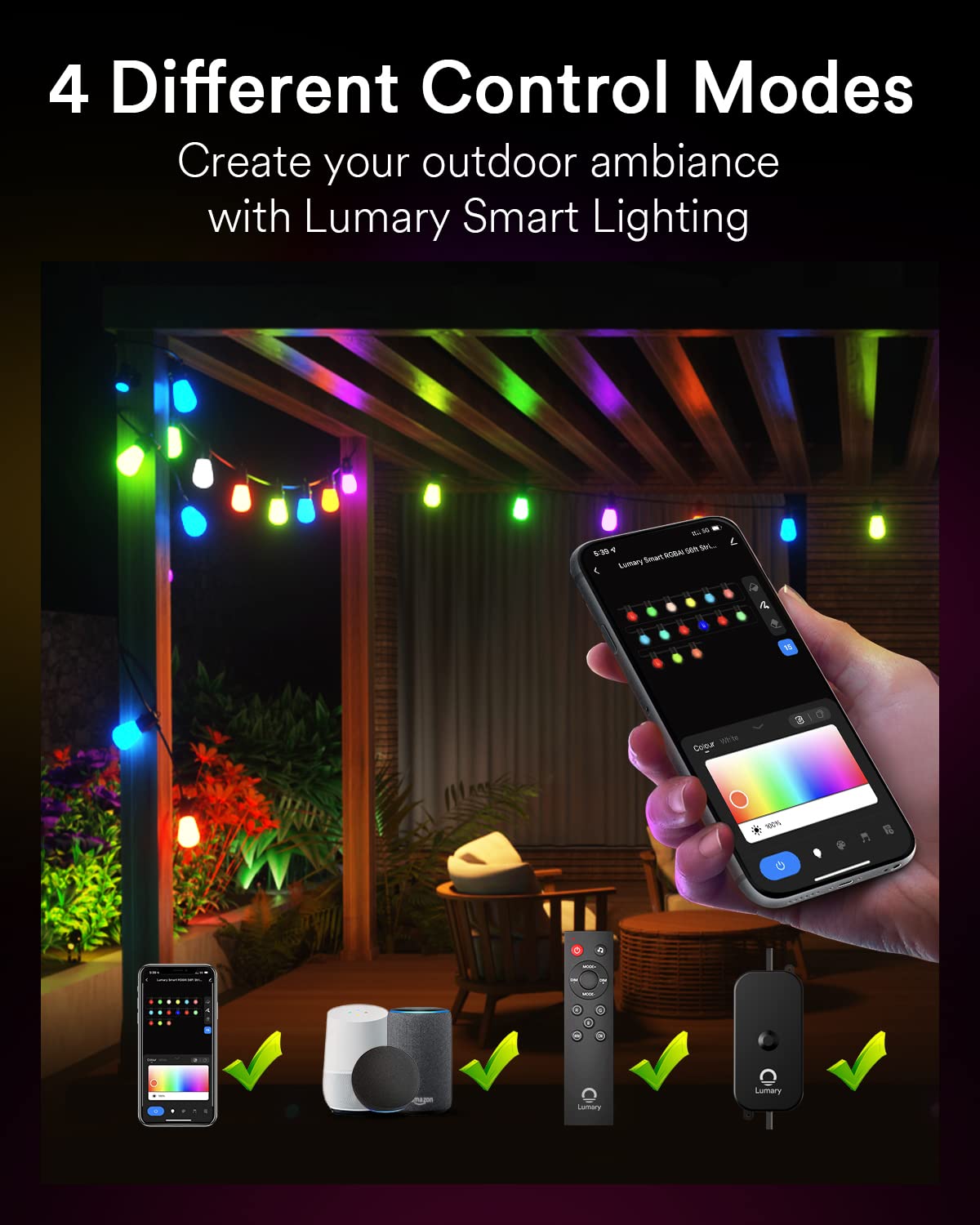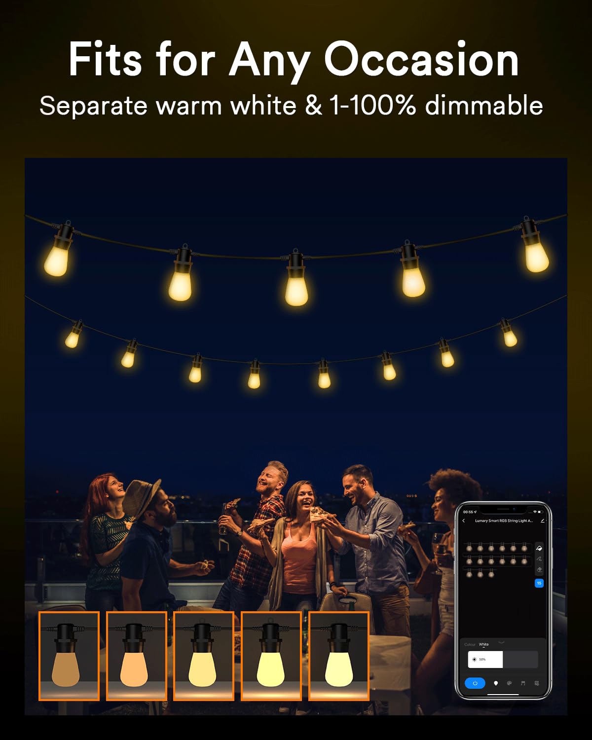 Lumary 100FT Smart Outdoor String Lights with APP/Remote/Voice Control, RGBAI Color Changing Patio Lights with Warm White 30+2 LED Bulbs, IP65 Waterproof Permanent Outdoor Lights Work with Alexa