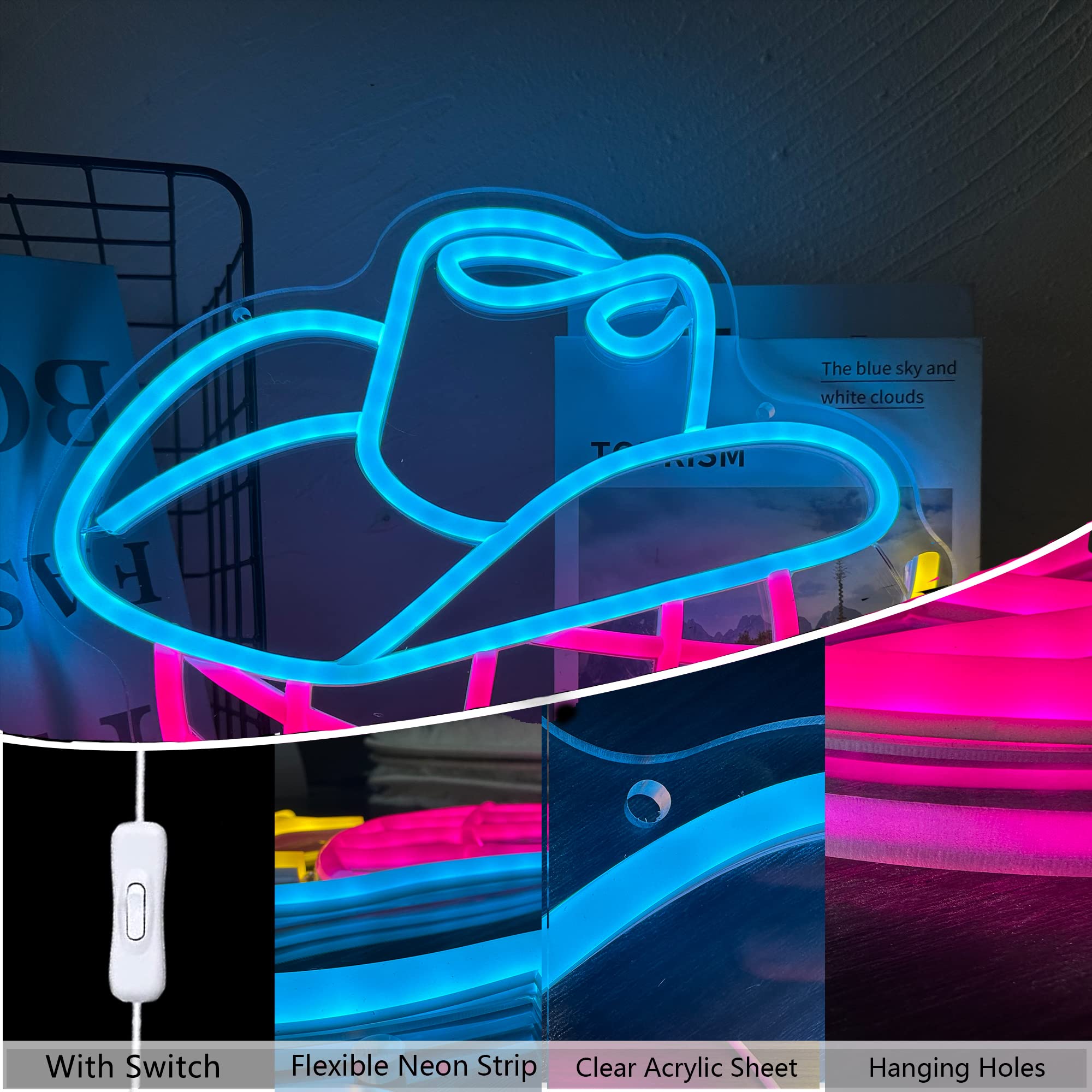 • Energy Saving and Convenience: The size of the USB-powered cowboy hat disco ball neon sign is 13.311in, and 2 pre-drilled holes for easy hanging (hooks are not included), you can hang the cowboy neon sign where you need it, with bright colors and bright lights that are not dazzling.