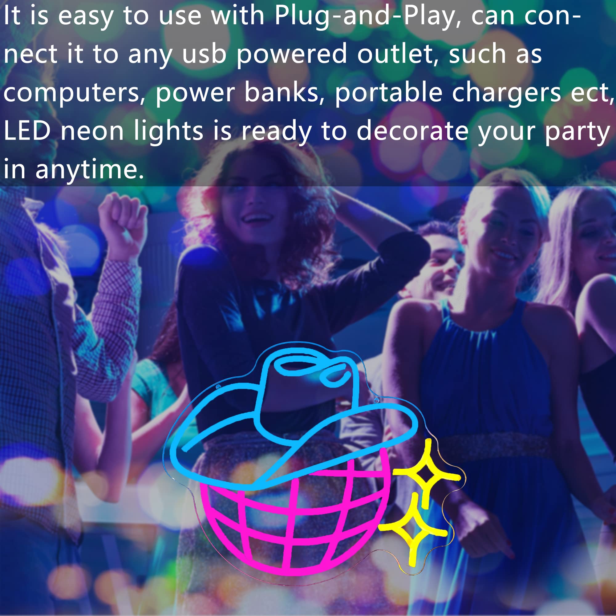 Cowboy Disco Ball Neon Sign: This led neon sign consists of a cowboy hat and a disco ball. Unique retro style design, eye-catching shape and bright lights, create a good atmosphere. This is a great decoration for your party or to decorate your bedroom, wedding, game room. High Quality and Durable: The neon sign is made of high-quality back panel and soft silicone tube, compared with traditional glass neon lights, it is bright and not dazzling, and has a long service life. Energy saving and durable, no noise, no heat. Easy to use and can be installed anywhere you want.