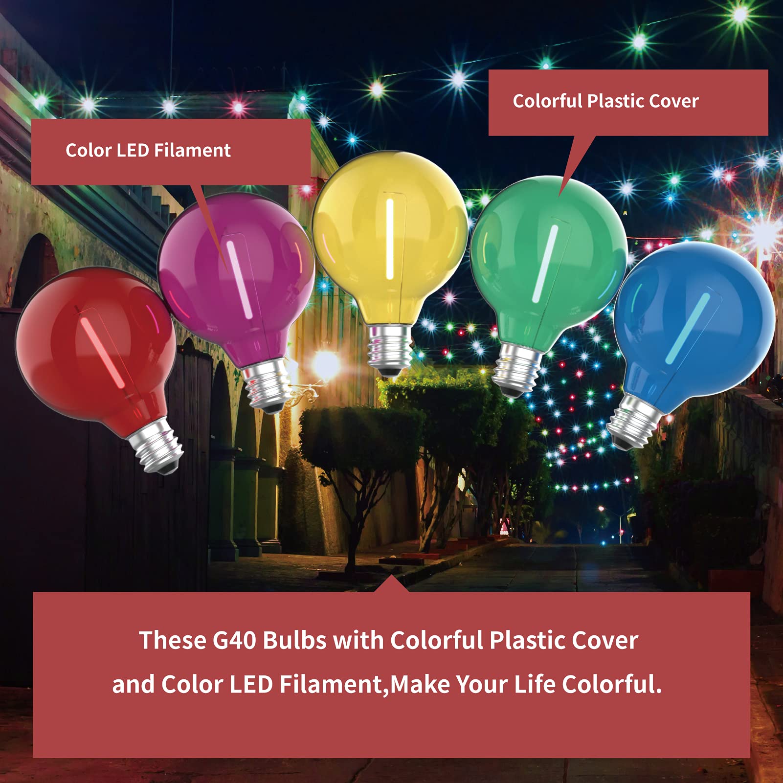 Meconard 25 Pack G40 Colored LED String Light Bulbs, E12/C7 Candelabra Base Shatterproof LED 1 Watt Globe Replacement Bulbs, Multi-Color: Red/Green/Blue/Orange/Purple