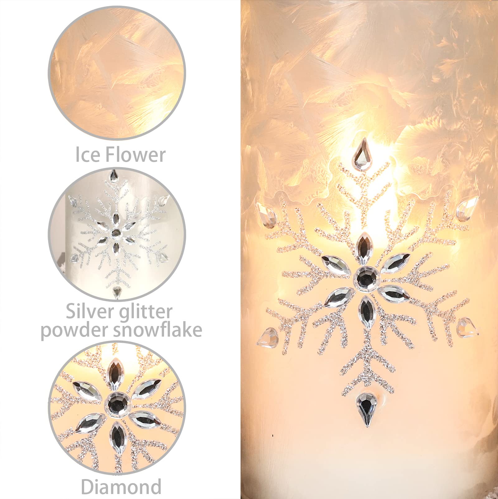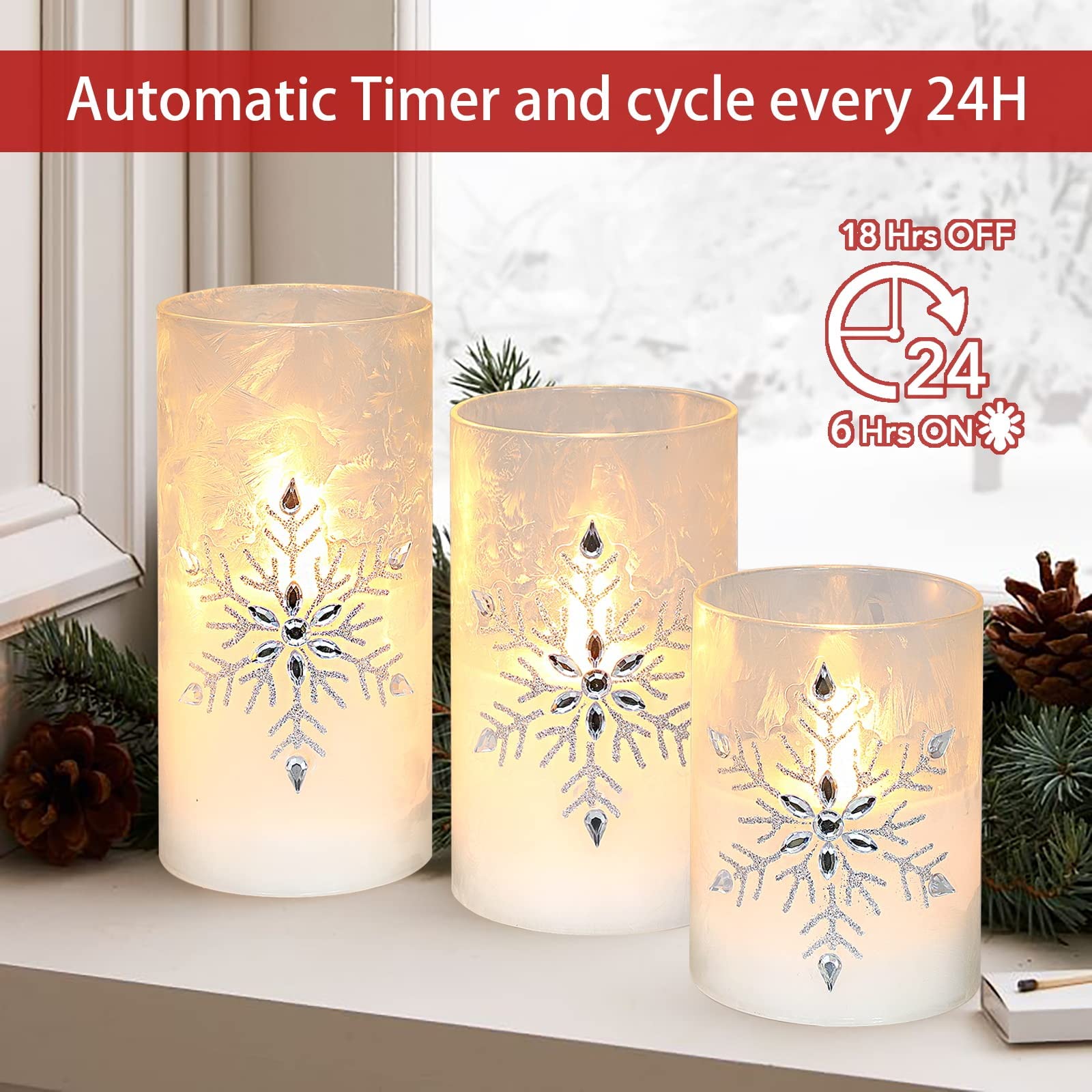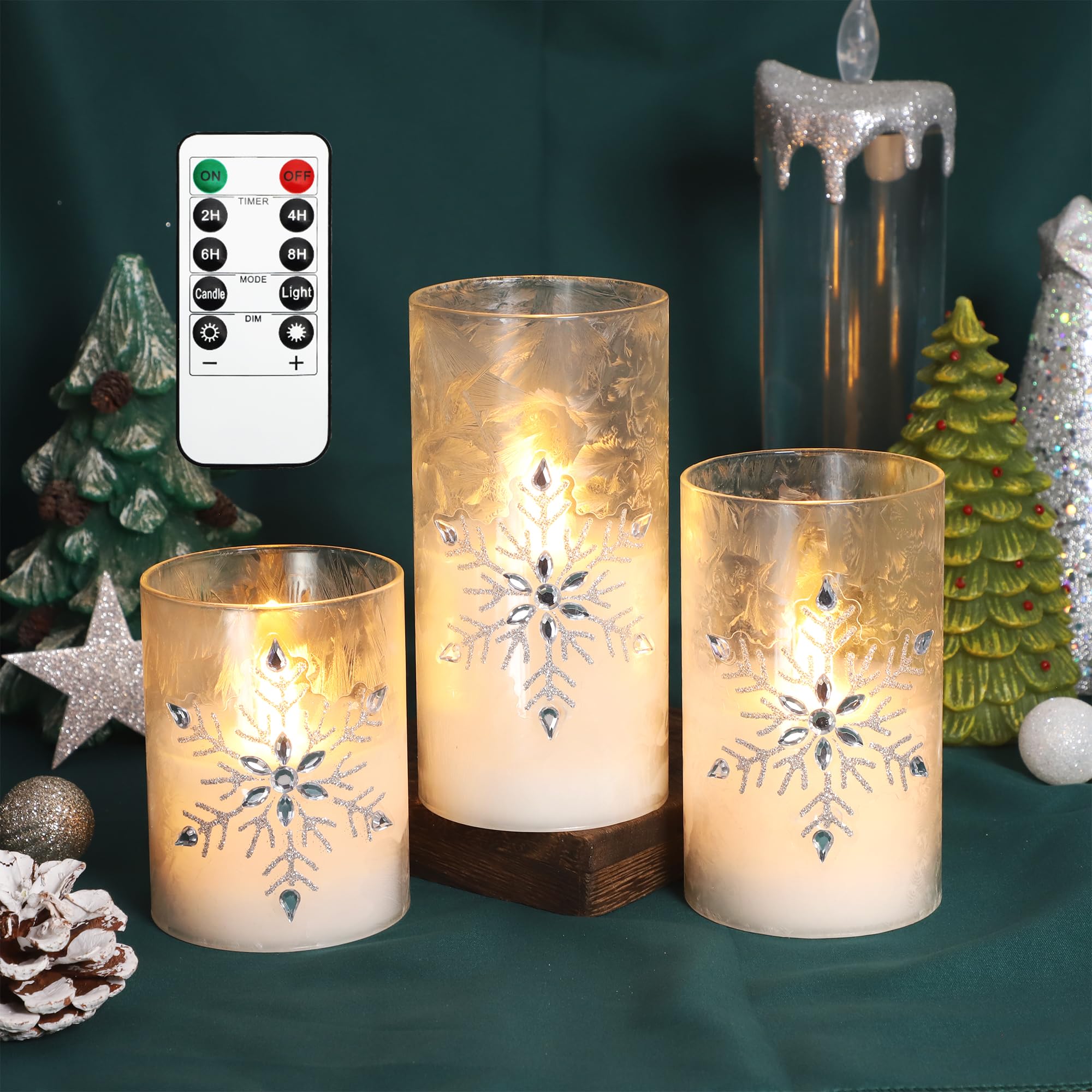 MELTONE Christmas Snowflake LED Candles Real Wax Flickering Glass Flameless Candles with Remote - Home Bedroom Party Holiday Decorations - Set of 3
