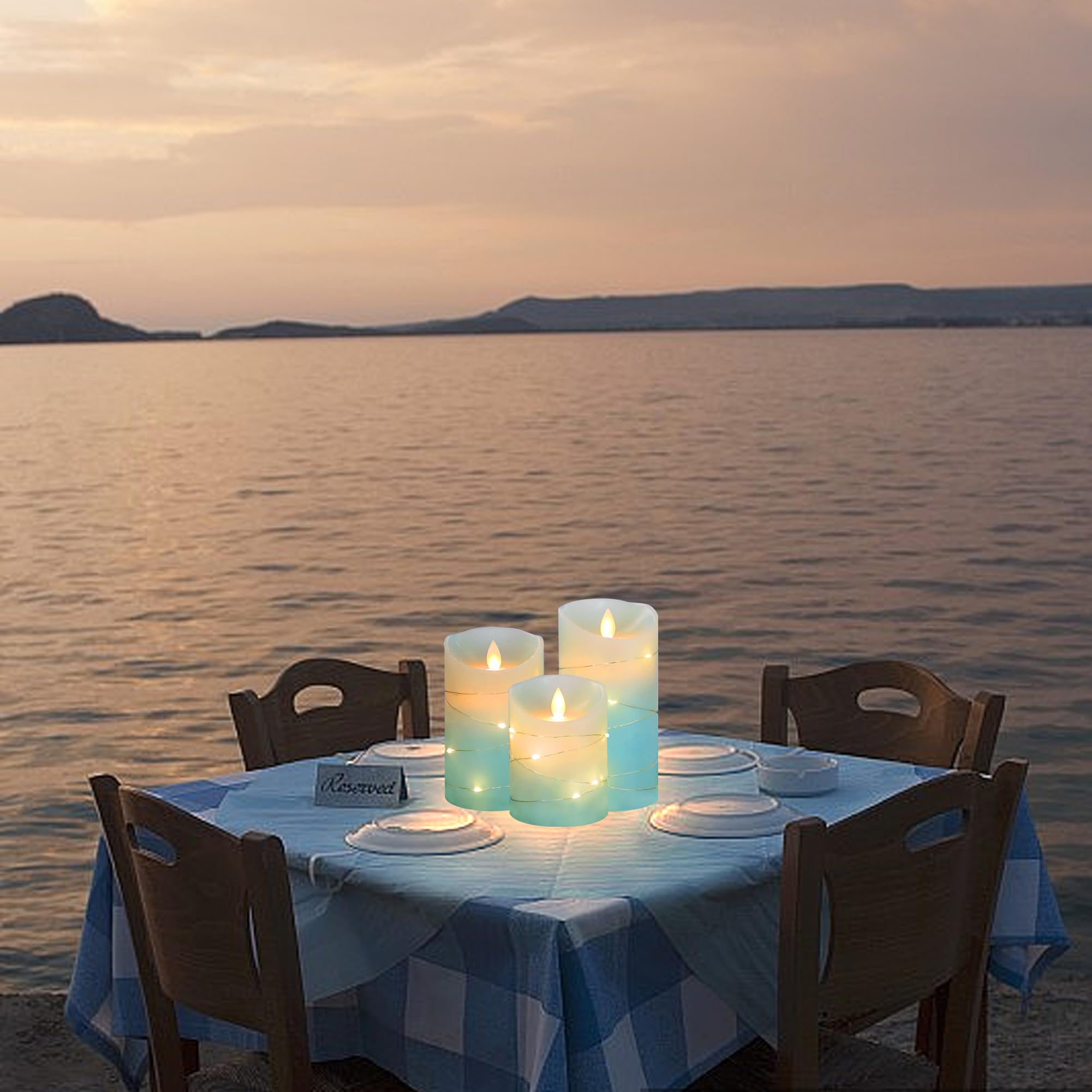 MELTONE Flameless Candles with String Lights Moving Wick Real Wax Ocean Blue Battery Operated Candles with Remote Control & Timer - Home Holiday Farmhouse Christmas Decor - Set of 3