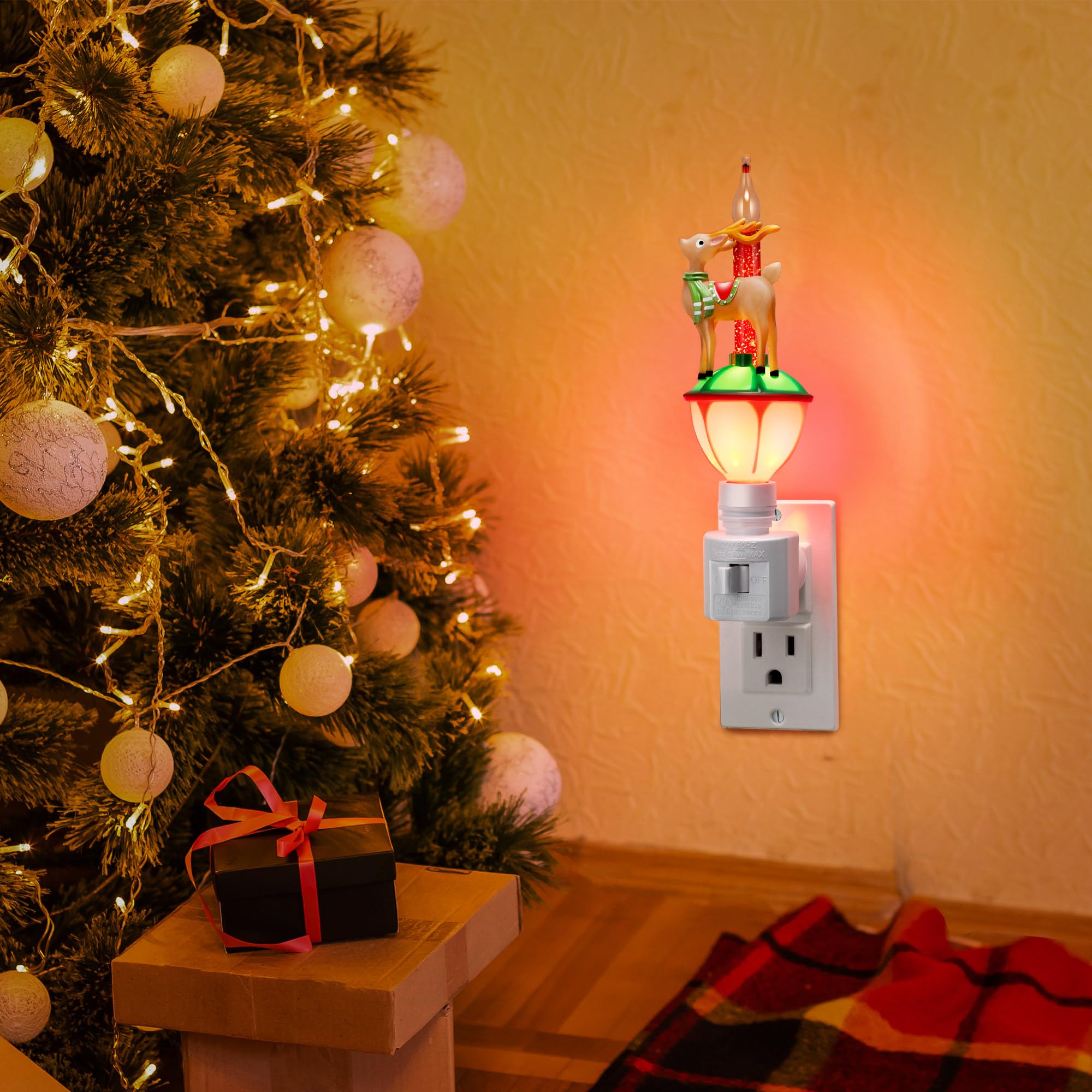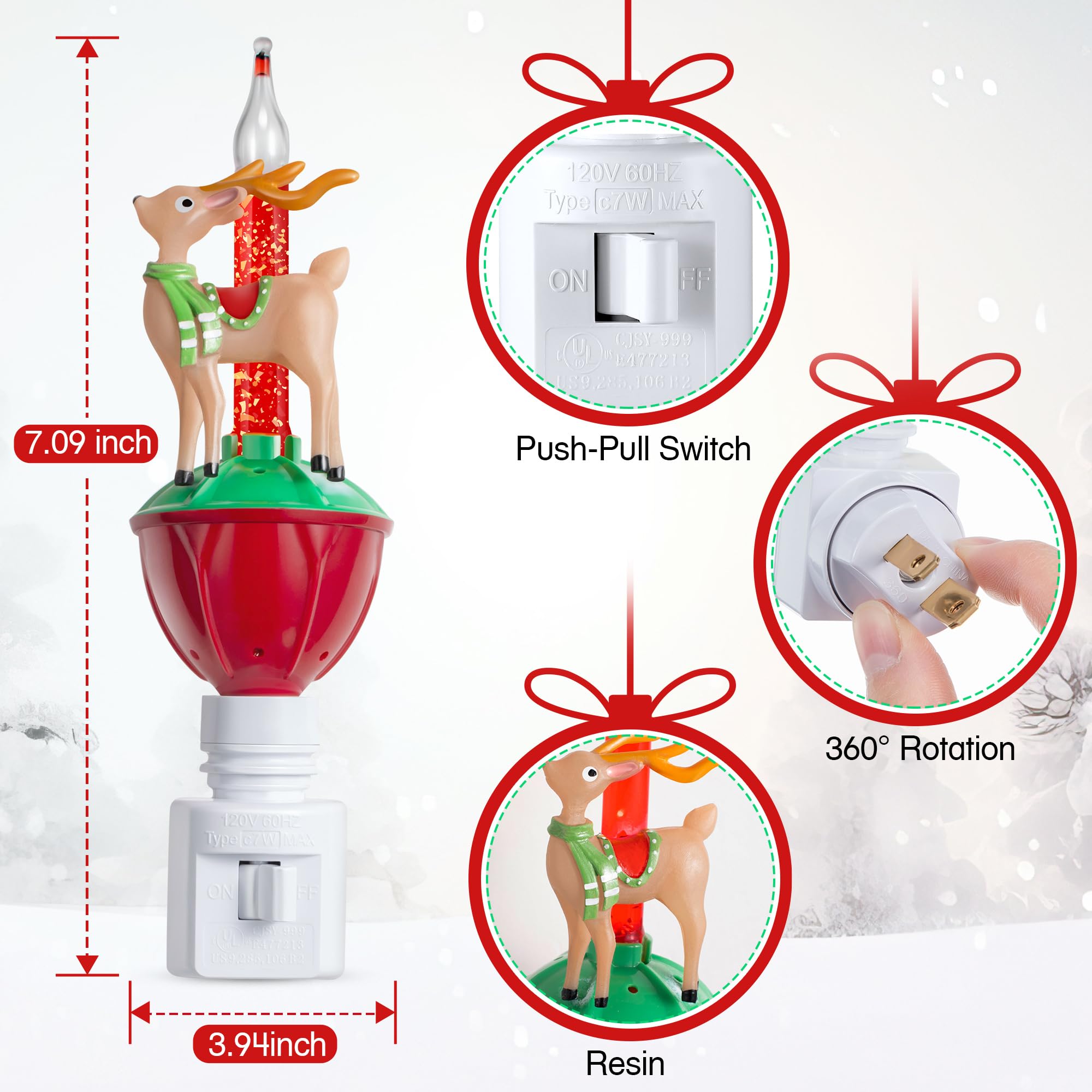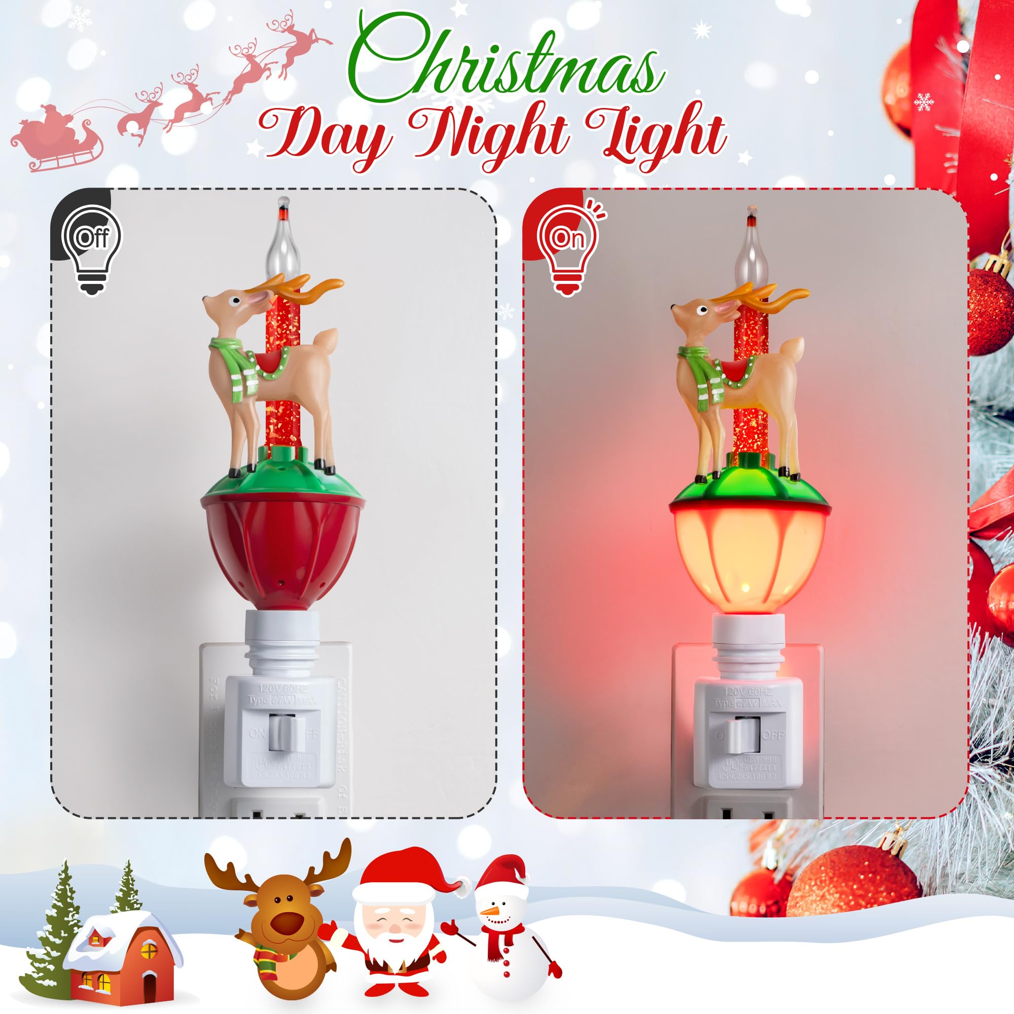 Specification of Bubble Night Light: Christmas bubble night lights plug into is made of glass, resin, water, plastic base, and tungsten filament bulb. Reindeer bubble night light plug in will show a vibrant warm white light, when plugs into a normal household 120V outlet and turn on the light, which can provide a warm and gentle light to brighten up your home Safe and Convenient: Christmas bubble light night lights have UL certification, also with a 360 degree swivel plug with on/off switch for use in both horizontal and vertical outlets for convenience. The material and design of Christmas plug in night lights is sturdy for reliability and long lasting, portable for travel and camp. Turn on lights, take a while for the red liquid to start bubbling, at the same time the small streamers in it also float, creating a romantic and charming feeling