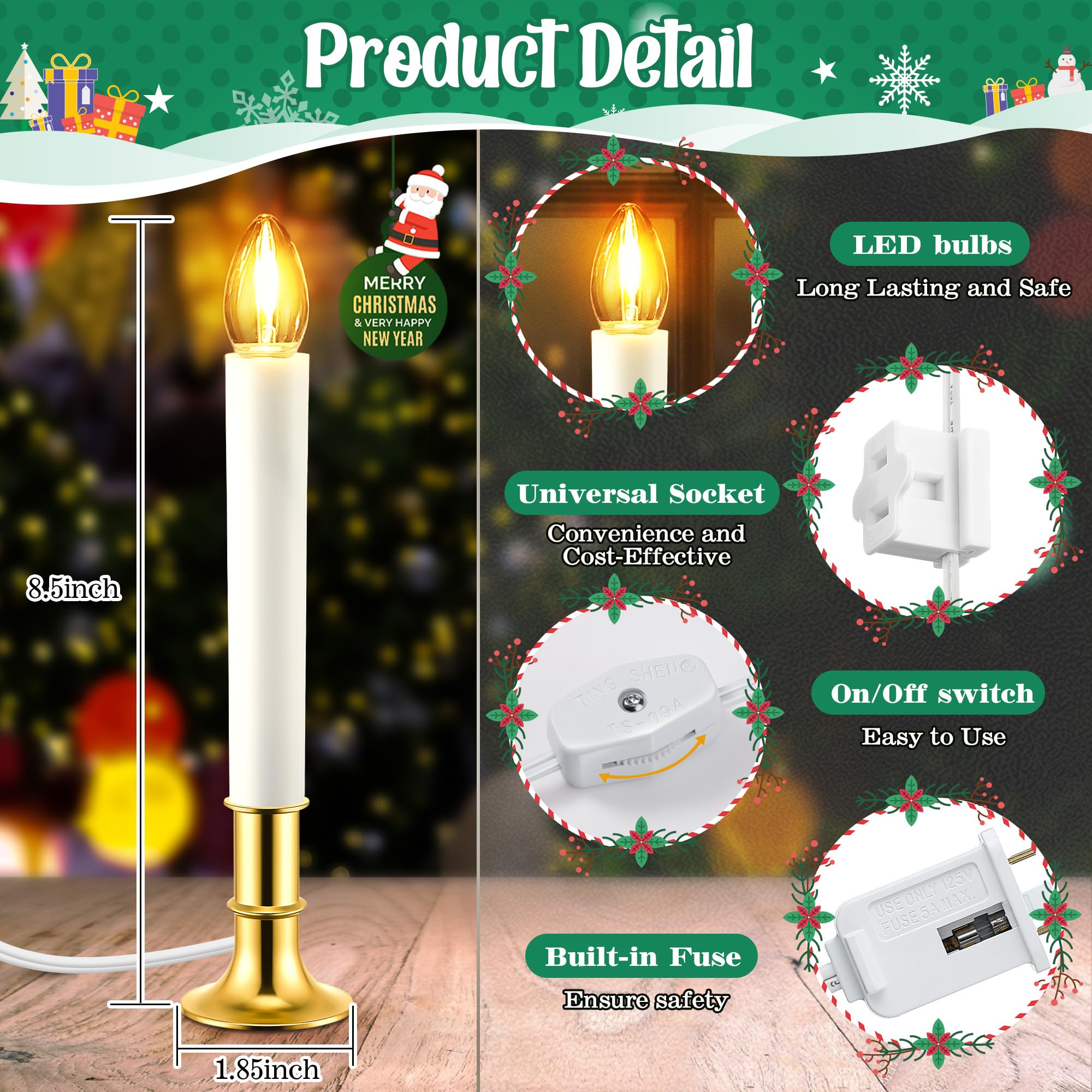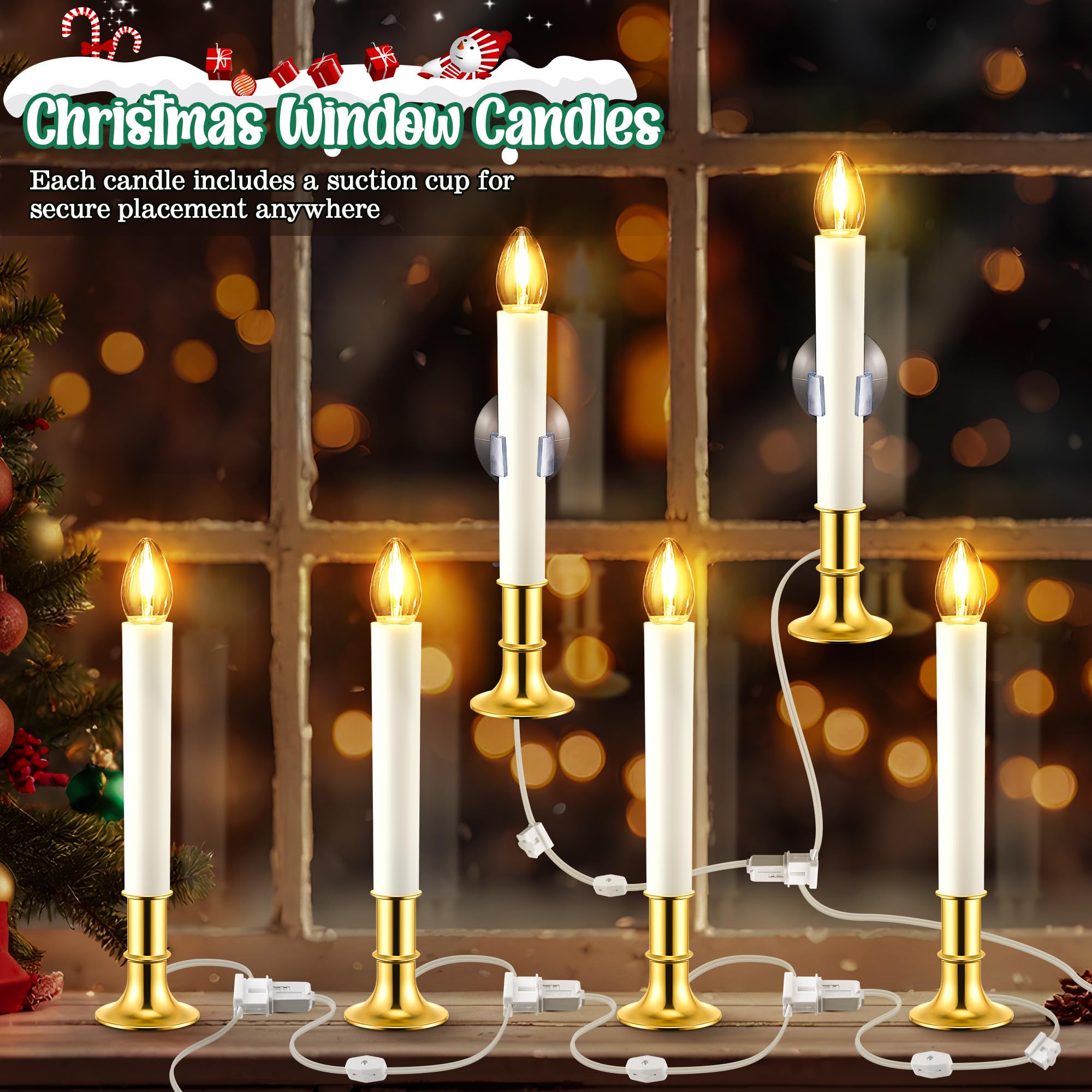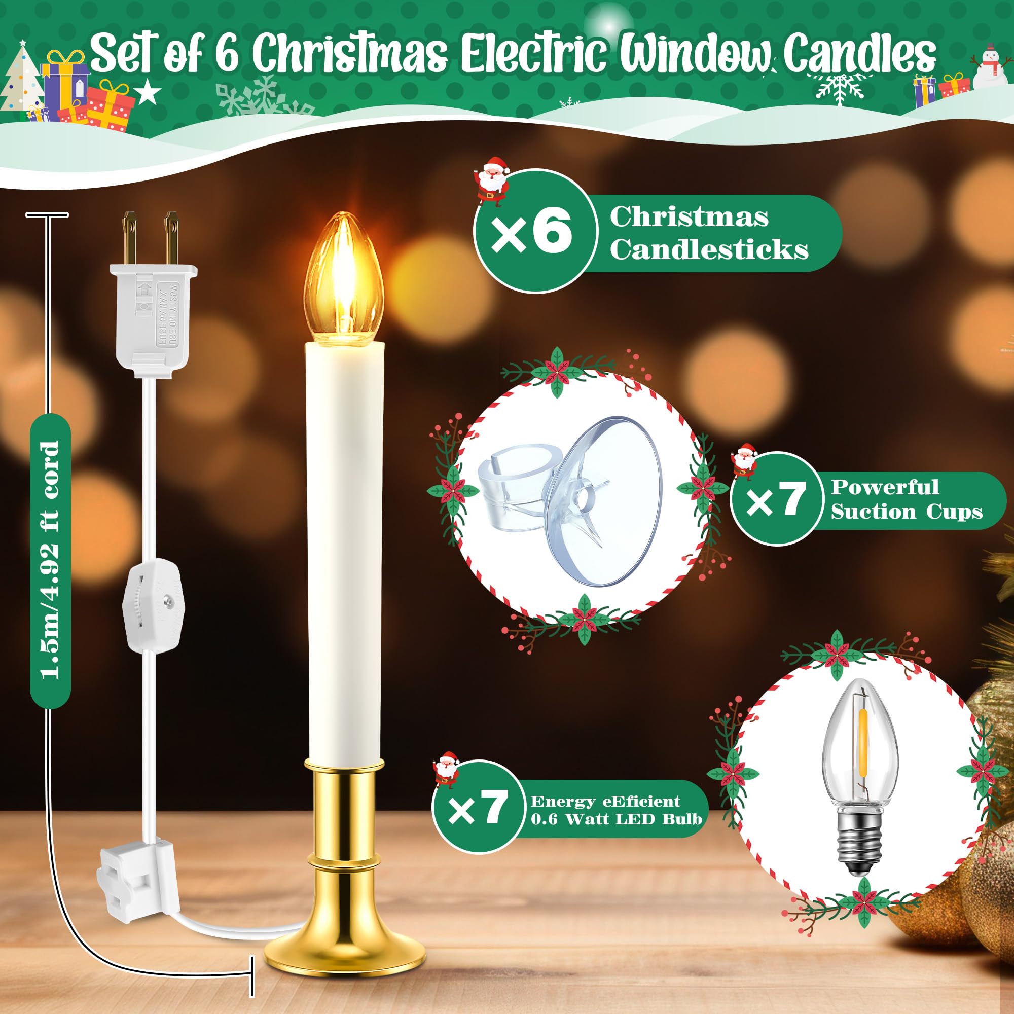 Meonum Set of 6 Christmas Electric Window Candles with Stability Gold Plated Base, 0.6 Watt LED Bulb, Suction Cups, and Plug in Design with On/off Switch Suitable for Home, Xmas, and Holiday Parties