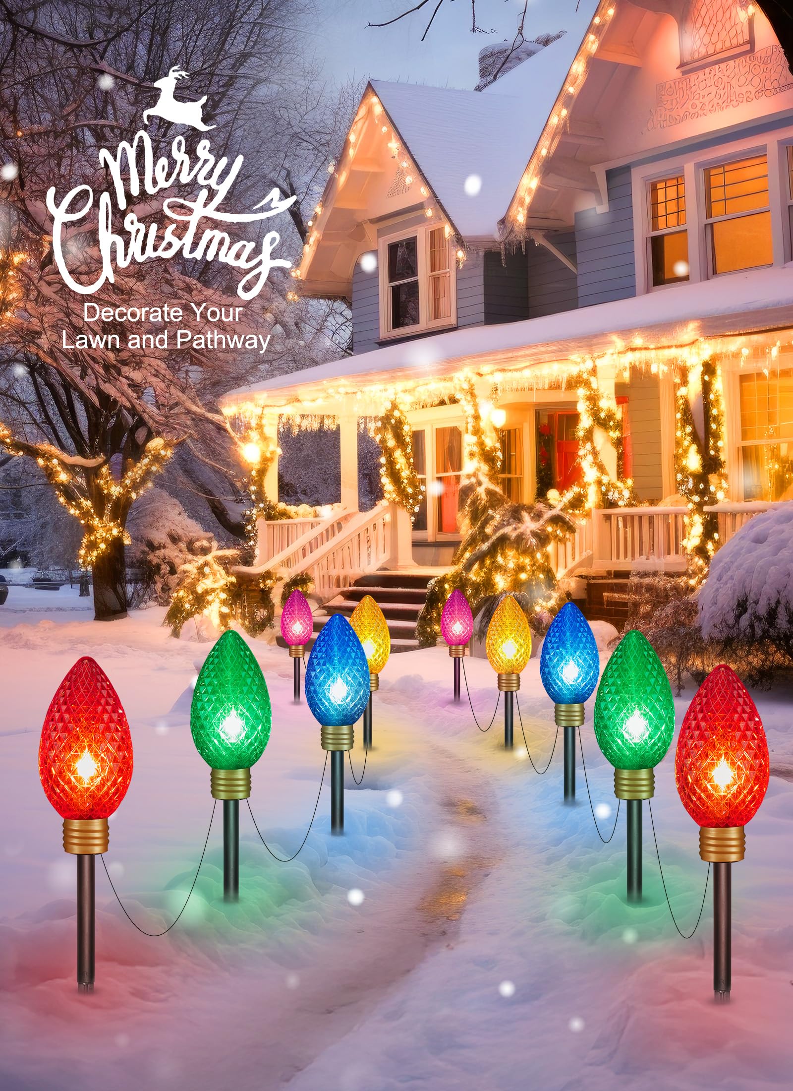 Strawberry Super Jumbo C9 Pathway Lights Christmas Outdoor: Enhance your outdoor space with these super jumbo C9 bulb-covered Christmas string lights. Featuring external super jumbo C9 bulb size of 9.5 x 4.7 inches and bulbs spaced 30 inches apart, these lights serve as 10.8-inch pathway markers. Compatible with E17 sockets, these lights create a festive atmosphere, ideal for outdoor Christmas decorations Two Installation Ways: These Strawberry Super Jumbo C9 Christmas lights can be used as traditional path lights to decorate your garden, yard, pathway, and walkway, or they can be hung on roofs, windows, and fences using the included hooks. Easily place these Christmas outdoor decoration lights wherever needed to brighten up your outdoor space
