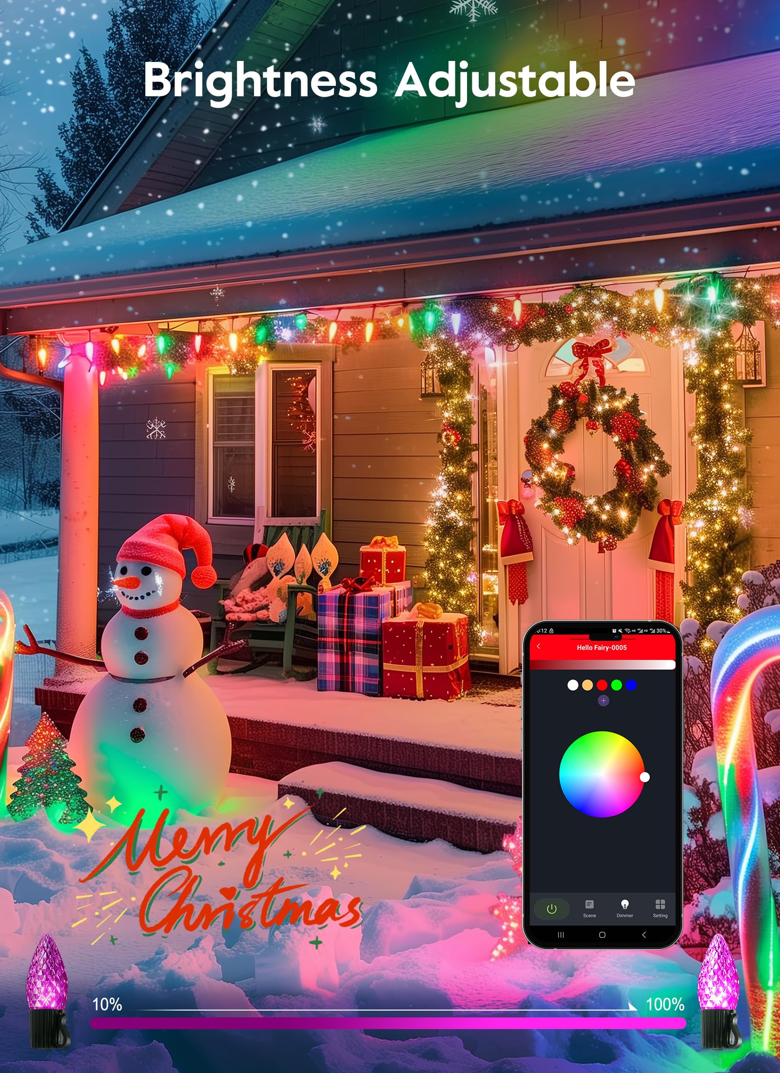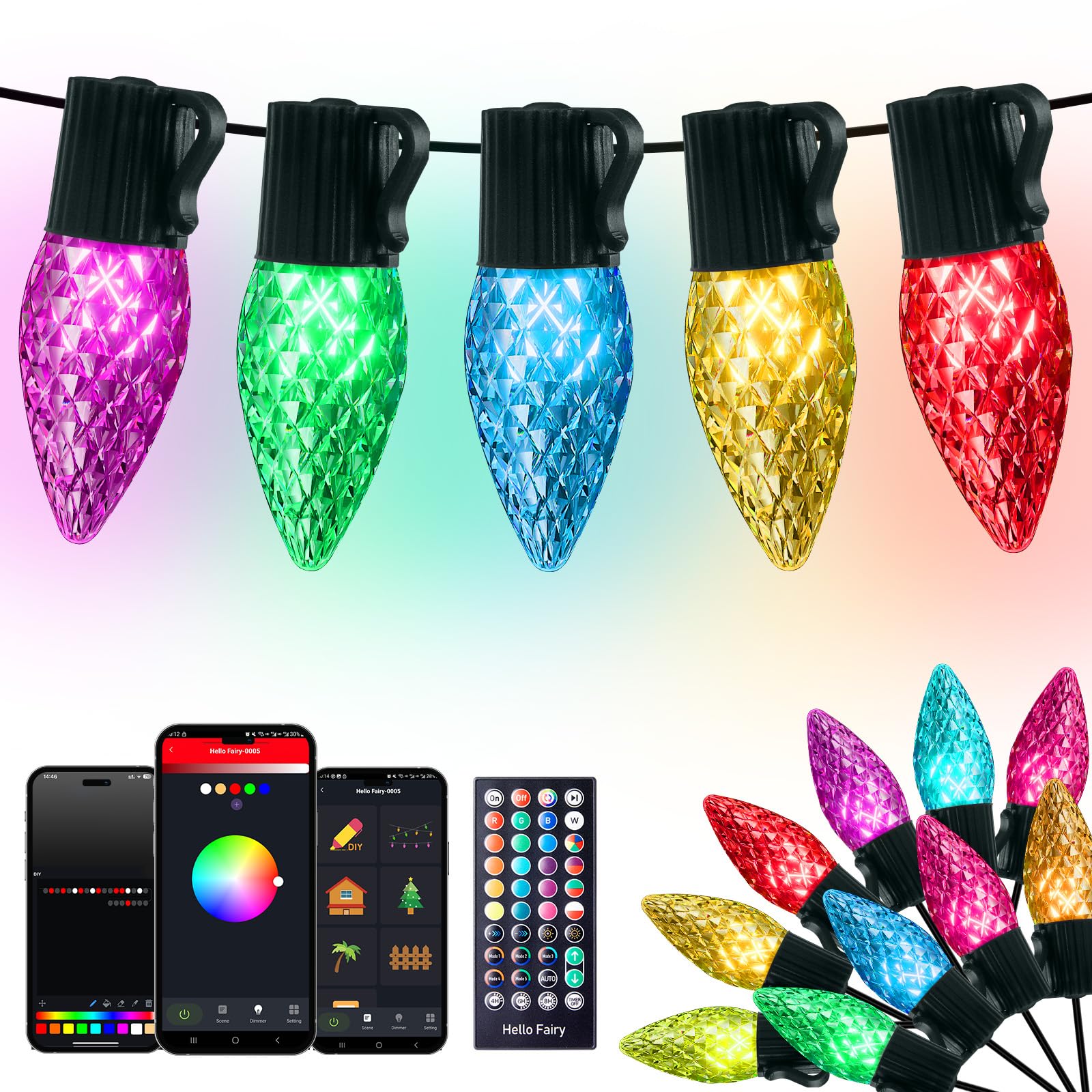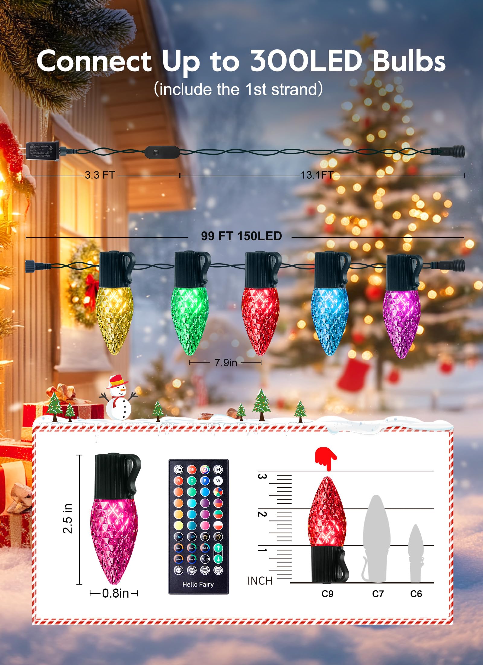 Connectable Smart Christmas Lights Outdoor: The 99ft C9 LED Christmas lights feature 150 retro diamond faceted crack-proof bulbs. It can connect up to 300 bulbs, easily wrapping around trees, hanging from eaves, or placed anywhere. With app, controller, or remote control options, you can effortlessly create stunning atmospheres for parties and holiday celebrations 16 Million Colors and 58 Preset Scenes: The smart C9 Christmas light string 16 million colors, 16 single colors and 58 preset modes, unlocking a level of cool decorative fun. Perfect for enhancing Christmas, Halloween, July 4th, Easter, Valentine's Day, St. Patrick's Day, Thanksgiving, Year, weddings, and birthdays