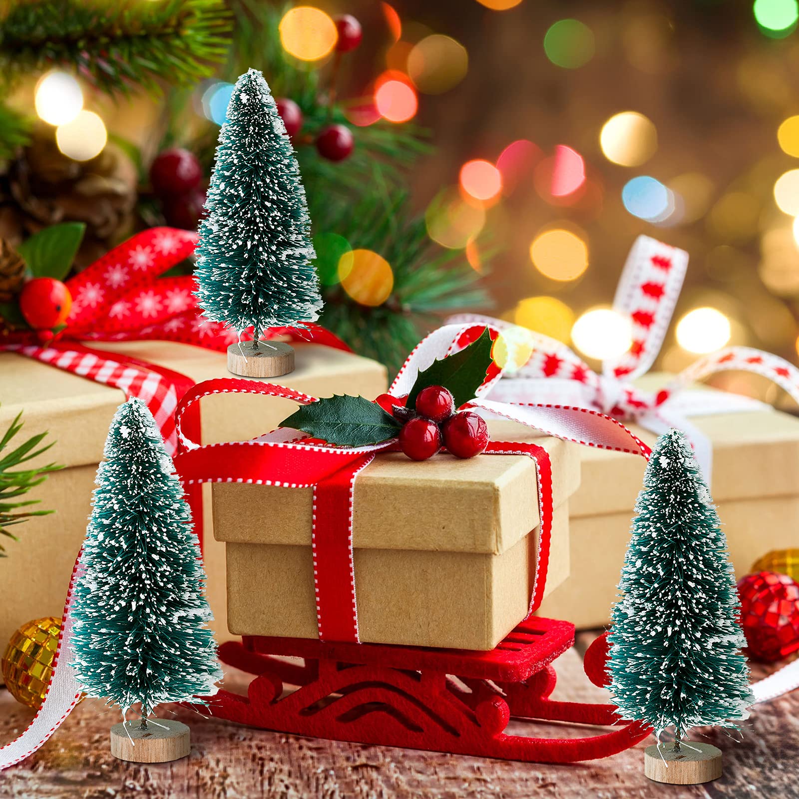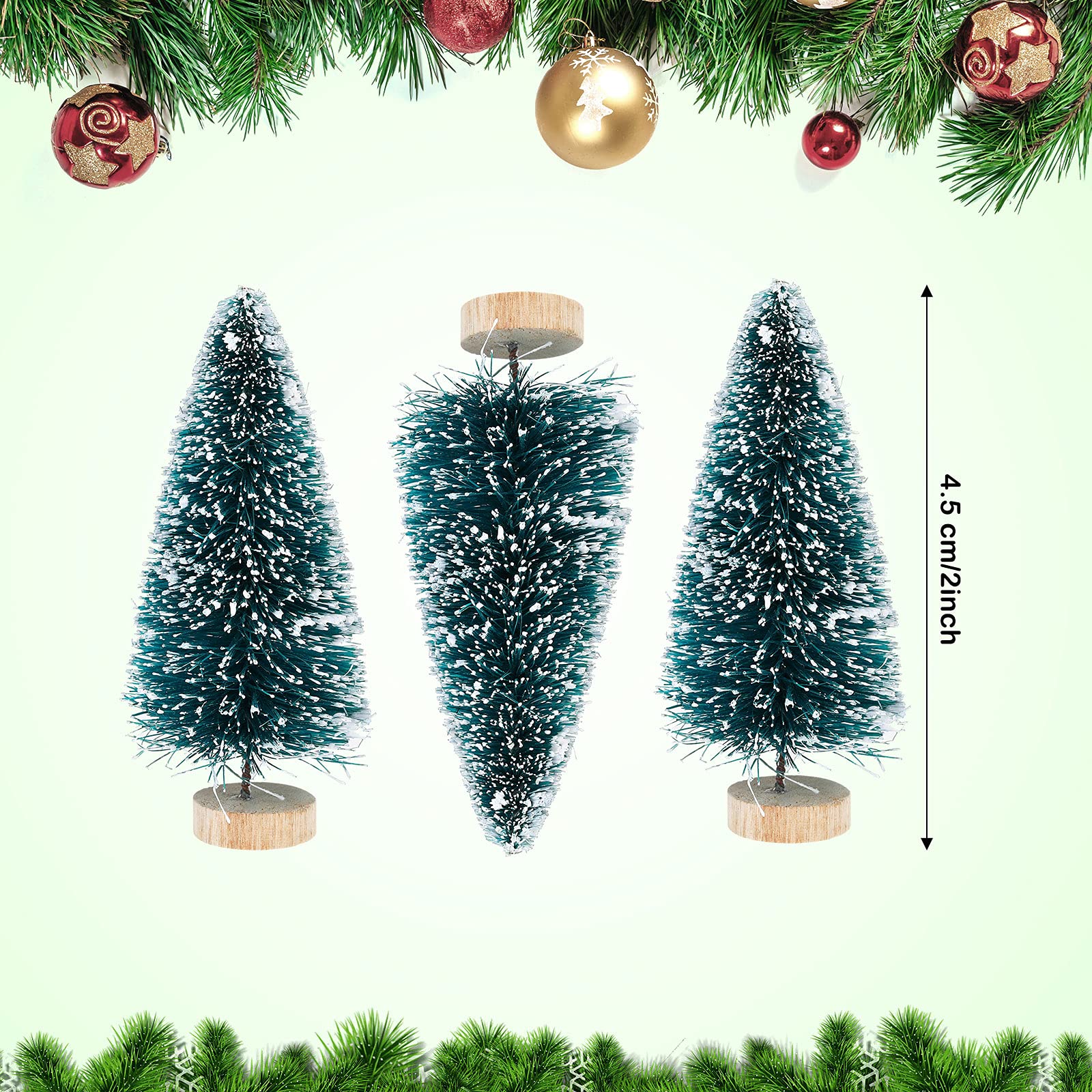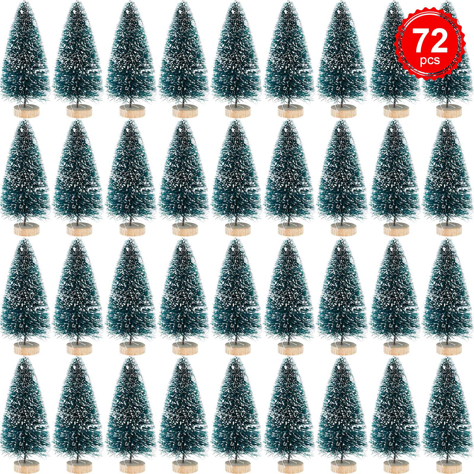Mini Bottle Brush Pine Trees with Wood Base - Winter Snow Frost Decor and Ornaments, 72 Pieces