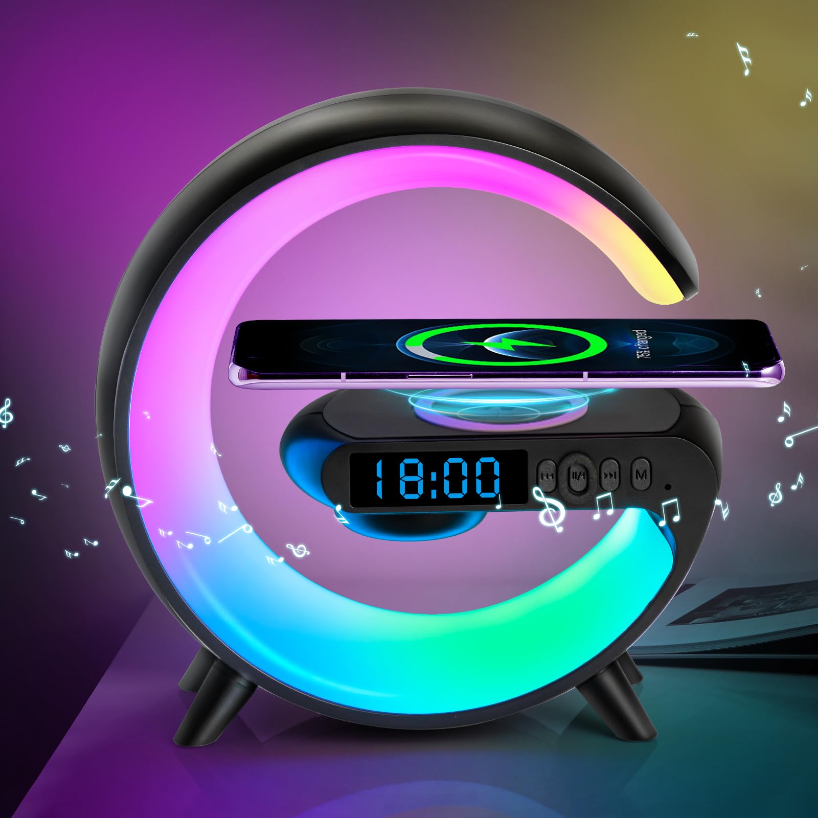 Mini G Type Wireless Charging Atmosphere Lamp with Bluetooth Speaker Alarm Clock Night Light 15W Wireless Charger Speaker for Bedside Lamp Ambient Lighting for Christmas (Black)