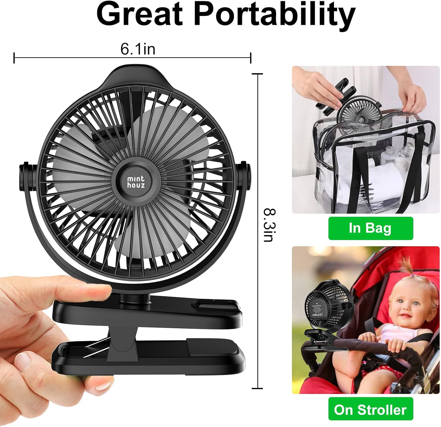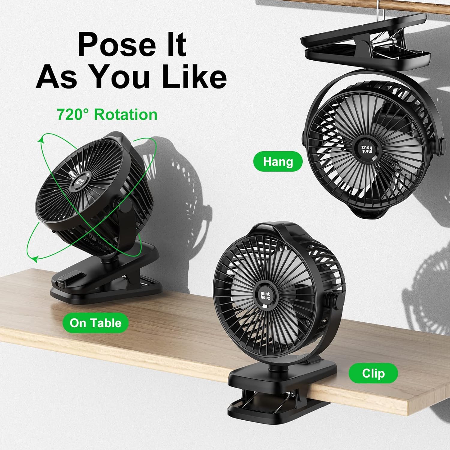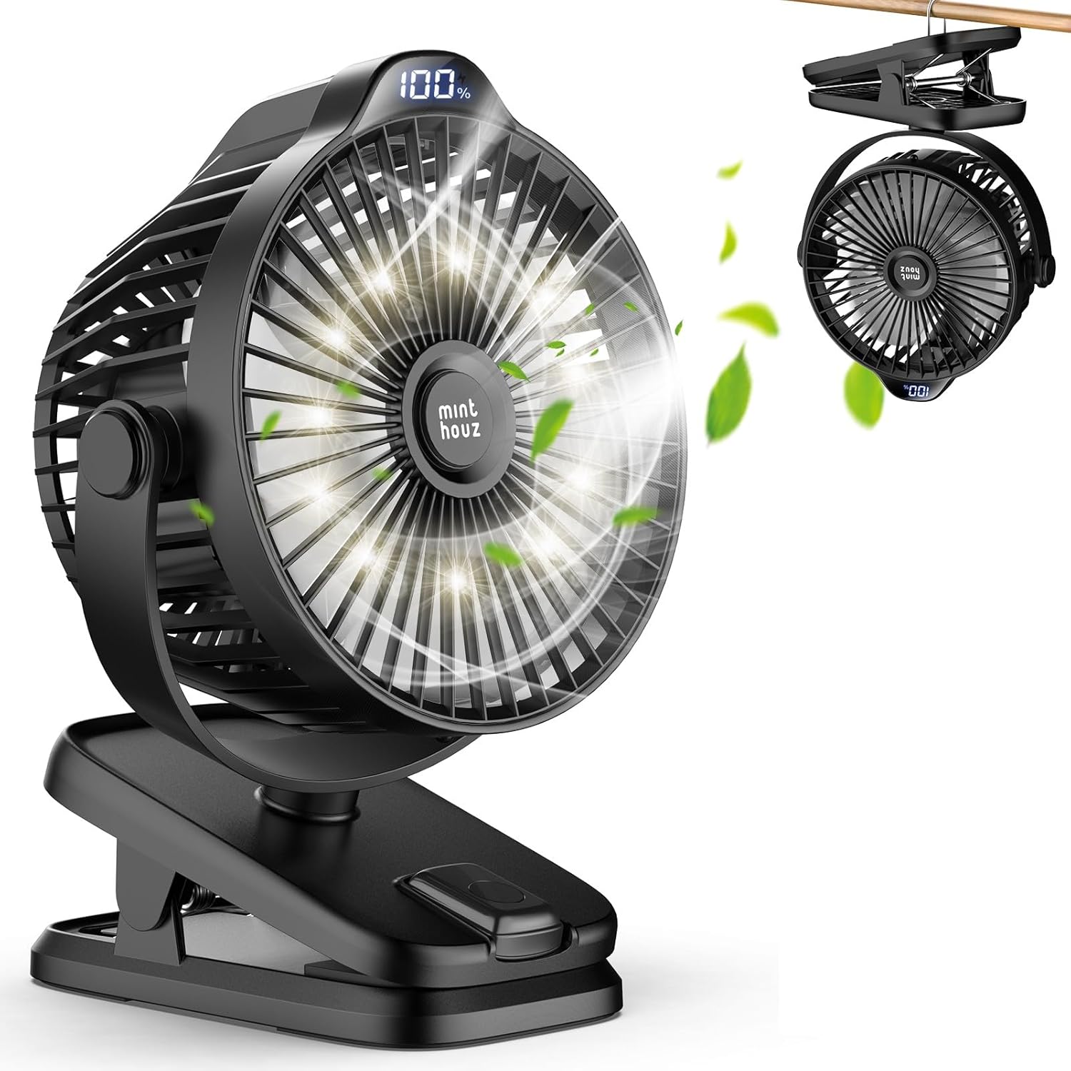 Minthouz Battery Operated Clip On Fan 8000Mah Rechargeable Portable Fan With Led Digital Display, 720° Rotation Small Desk Fan