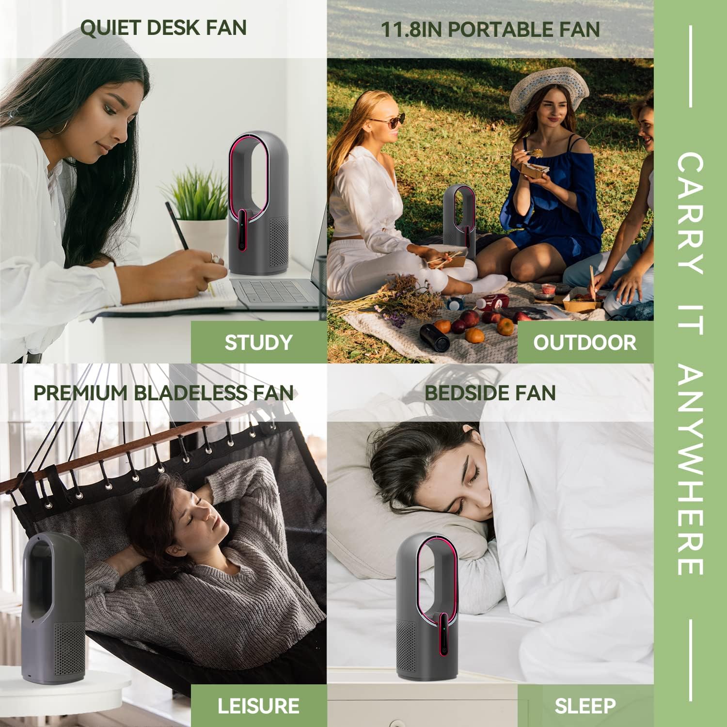 • ★【Portable Convenience Fan】Its 11.8 height and USB powered design allows for use on the go and is compatible with computers, laptops, portable chargers and other devices with a USB input, Equipped with a 3.3ft. USB cable, Builtin 5000mAh rechargeable battery, the portable fan can work continuously for 3:3013 hours when fully charged. After use the Bladeless Fan for 3 days long you will be surprised at its performance