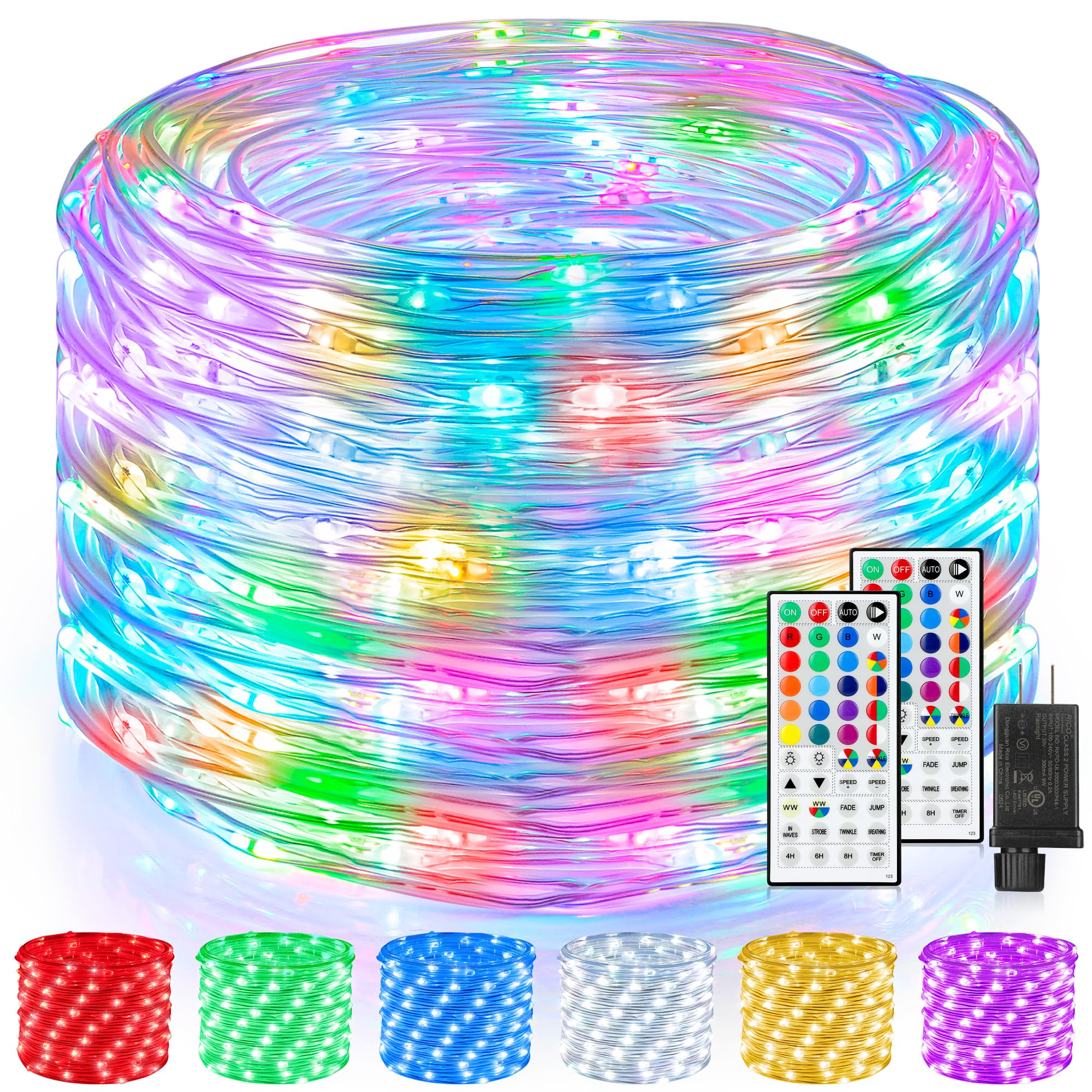 Extra Long 164 FT LED Multicolored Rrope Lights: 164FT/ 50m, 500 Led beads, providing vivid and bright 17 single colors + 8 Multicolor and 8 flexible lighting modes. You can switch 17 colors (warm white, red, yellow, blue, green, purple, pink, etc.) and 8 dynamic modes (FADE/ JUMP/ BREATHING/ TWINKLE/ STROBE/ IN WAVES) by remote control or buttons on the controller to provide a colorful visual experience and romantic atmosphere for your party, wedding, gathering, gazebo IP68 Waterproof Plug-in RGB Fairy Rope Lights: Brighter than USB powered, 2 strands of silver copper wire wrapped with transparent PVC tube outside show the truest colors, not only safer than bare fairy rope lights and prevent tangling, but also IP68 waterproof rating, can work perfectly in rainy days. They are completely safe to touch even for children and pets. Controller IP44 waterproof, please do not immerse in water