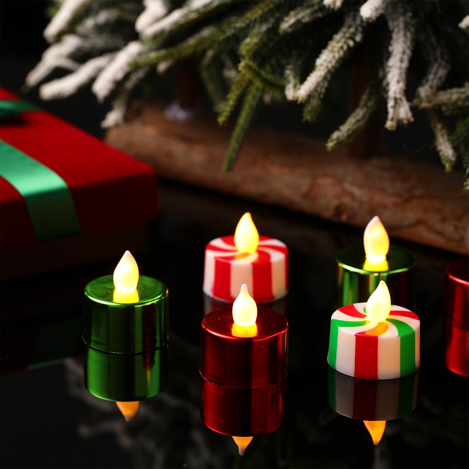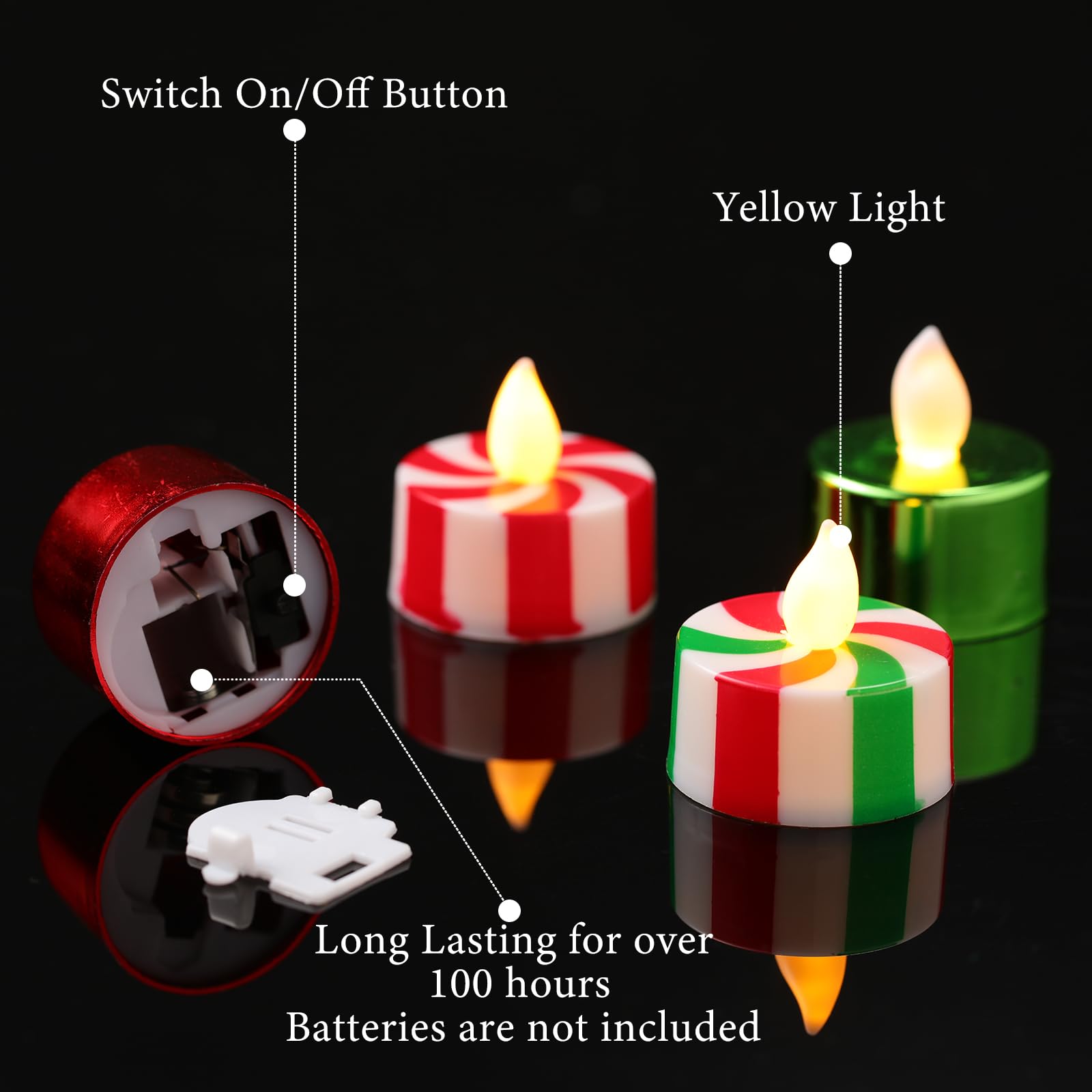 Package Includes: you will get 24 pieces of Christmas tea lights candles in 4 different styles, 6 pieces of each They are creative and interesting, with the adequate quantity and styles, enough to satisfy your Christmas decorative needs Moving Wick: each of the flameless tea lights candles requires 3 pieces of LR1130 electronic batteries, once powered on, the wick light moves as if swaying in the wind, realistically dancing flames under warm light, creating a decorative effect like real candles