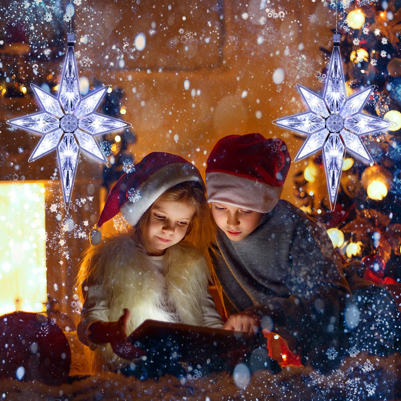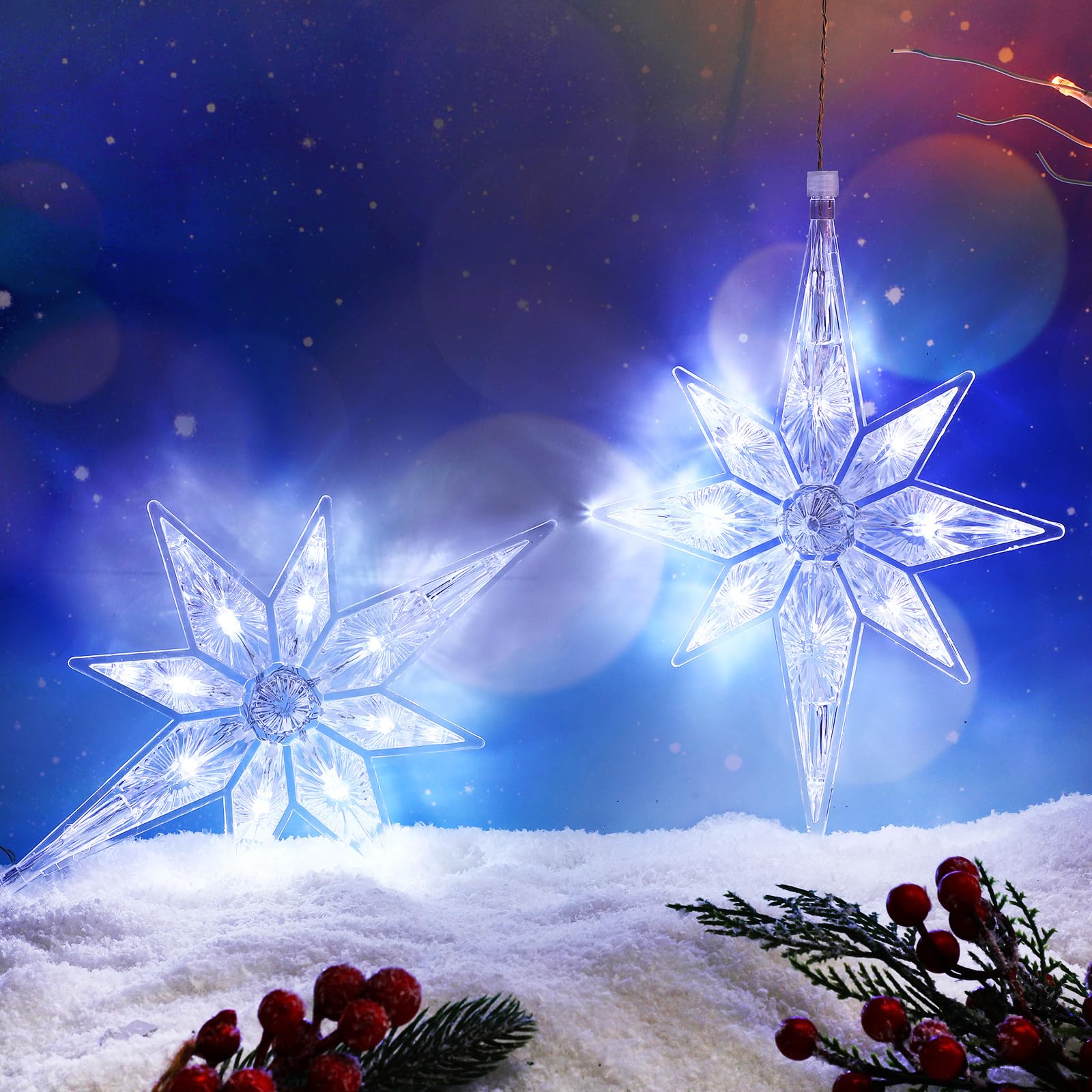 Mudder 10.8 Inch Christmas Window Star Lights Plastic Lighted Star Tree Topper Decoration Large Hanging Stars Christmas Window Lights LED Star Window Silhouette Decoration (Cool White,2 Pieces)