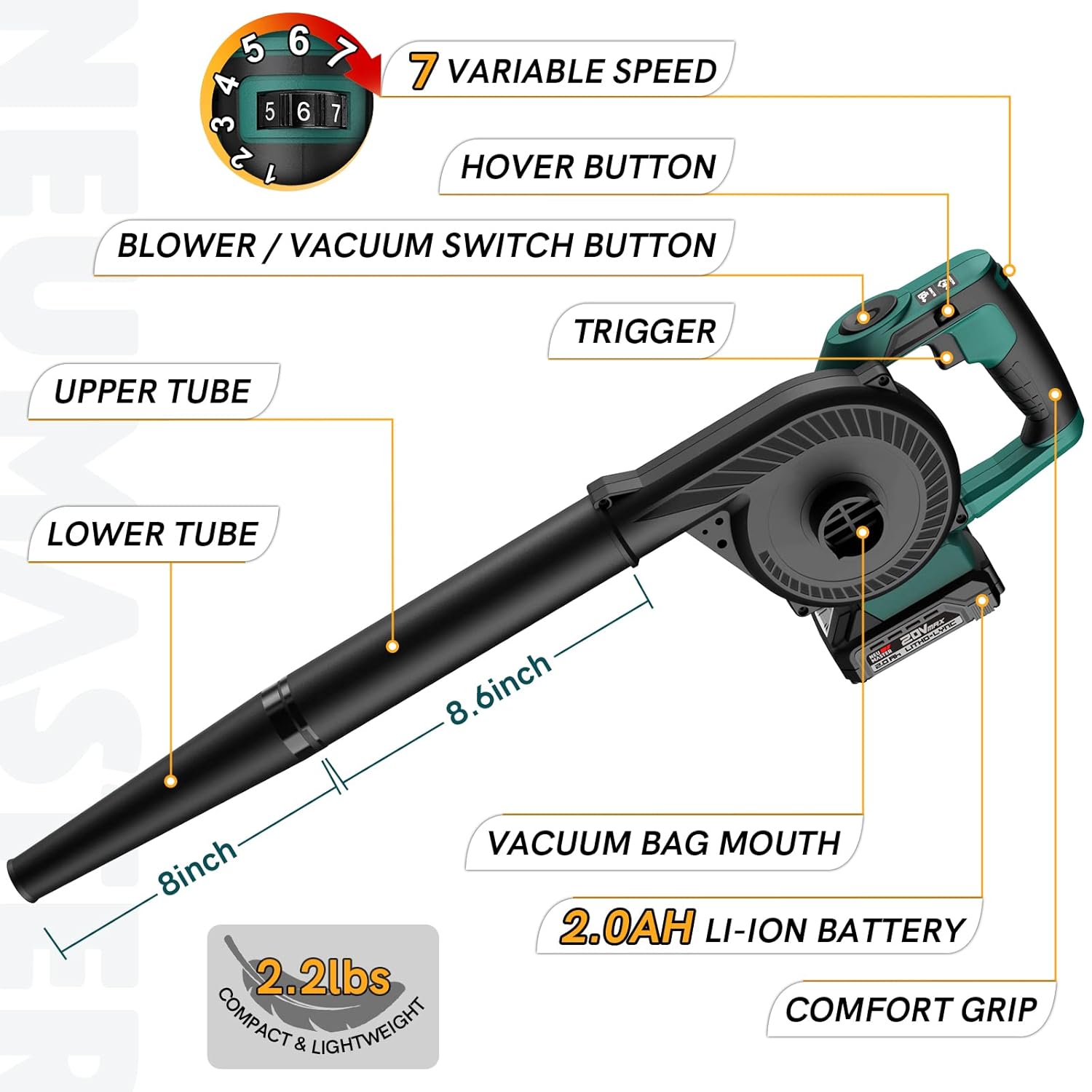 NEU MASTER 20V Leaf Blower Cordless, Mini Electric Leaf Blower Battery Powered, 7 Speed Handheld Leaf Blower and Vacuum with 2.0 Battery & Charger for Lawn Care, Patio, Yard, Jobsite