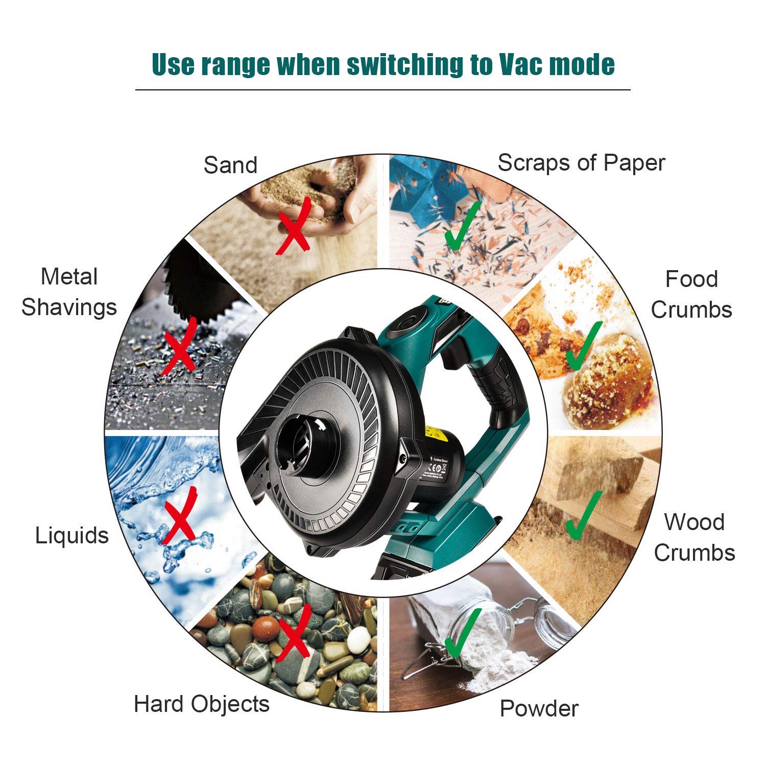 • 🍂【2-IN-1 Blower Cordless & Vacuum】This 2 in 1 leaf blower adopts a unique design, make blowing & vacuuming in one available. Simply have the dust bag (included) at the air outlet & tube at the inlet, sucking up the dirt/pet hair/residues& bread crumbs easily. Keep your home, garden and garage clean by using this electric leaf blowers & leaf vacuums.