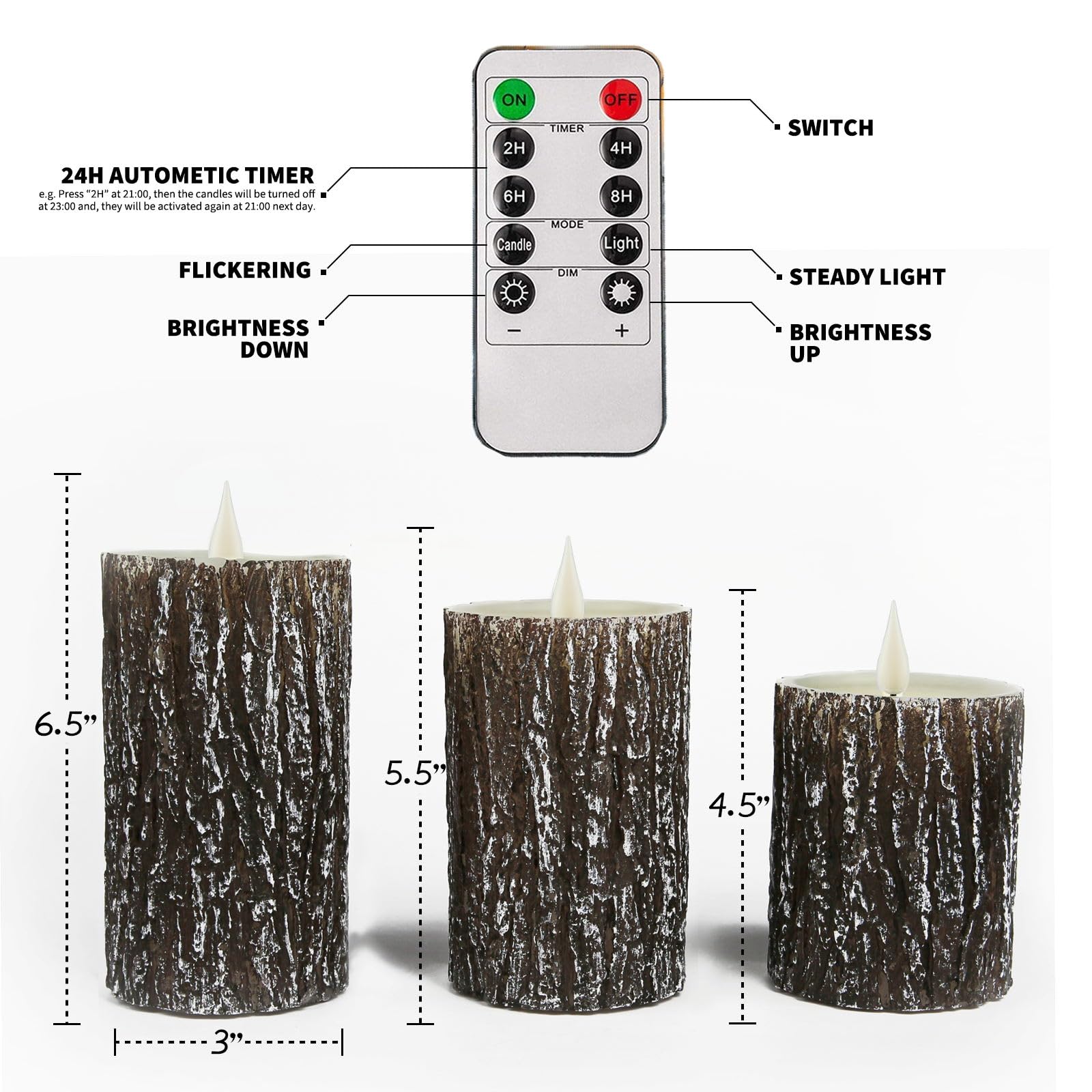 Realistic Electric Led Candle Covered With Pine Bark - What makes our flameless candle look real First, Pine bark cover, which you a real visual sense of real pine tree as much as possible, makes it pretty vintage and ritual and enables you to feel the ambience of nature. Second, it is applied with the flame simulation technology that the LED flameless candles have the flickering mode and moving wick. Safety Matters No Annoying Hassles And Potential Danger - Powered by 2 AA batteries (Not included). No real flame exists, thus no chance of potential threat. Definitely secure for the old, children, pets, plants and furniture. No fire accident, but also no dripping wax to melt, so need not to clean the tablecloth after use. Save your efforts, patience and time, making room for you and your family