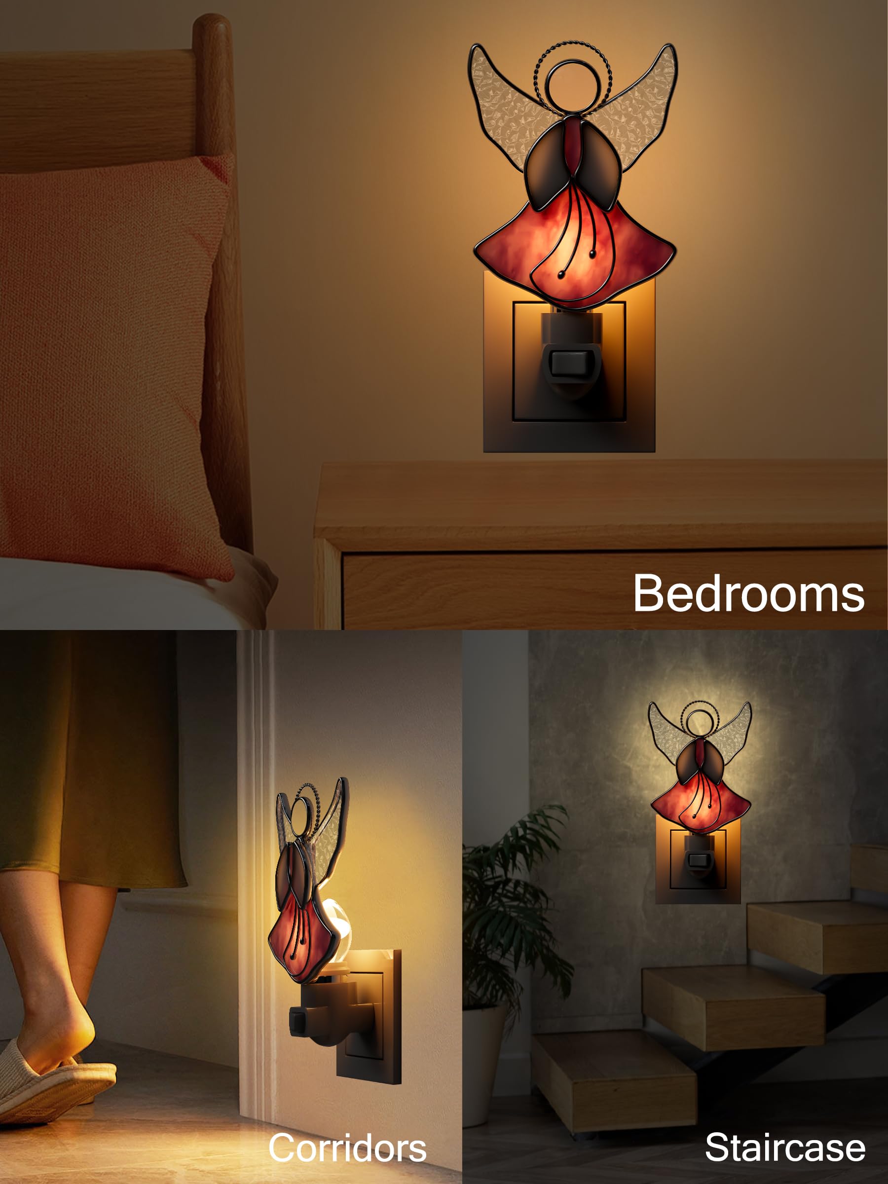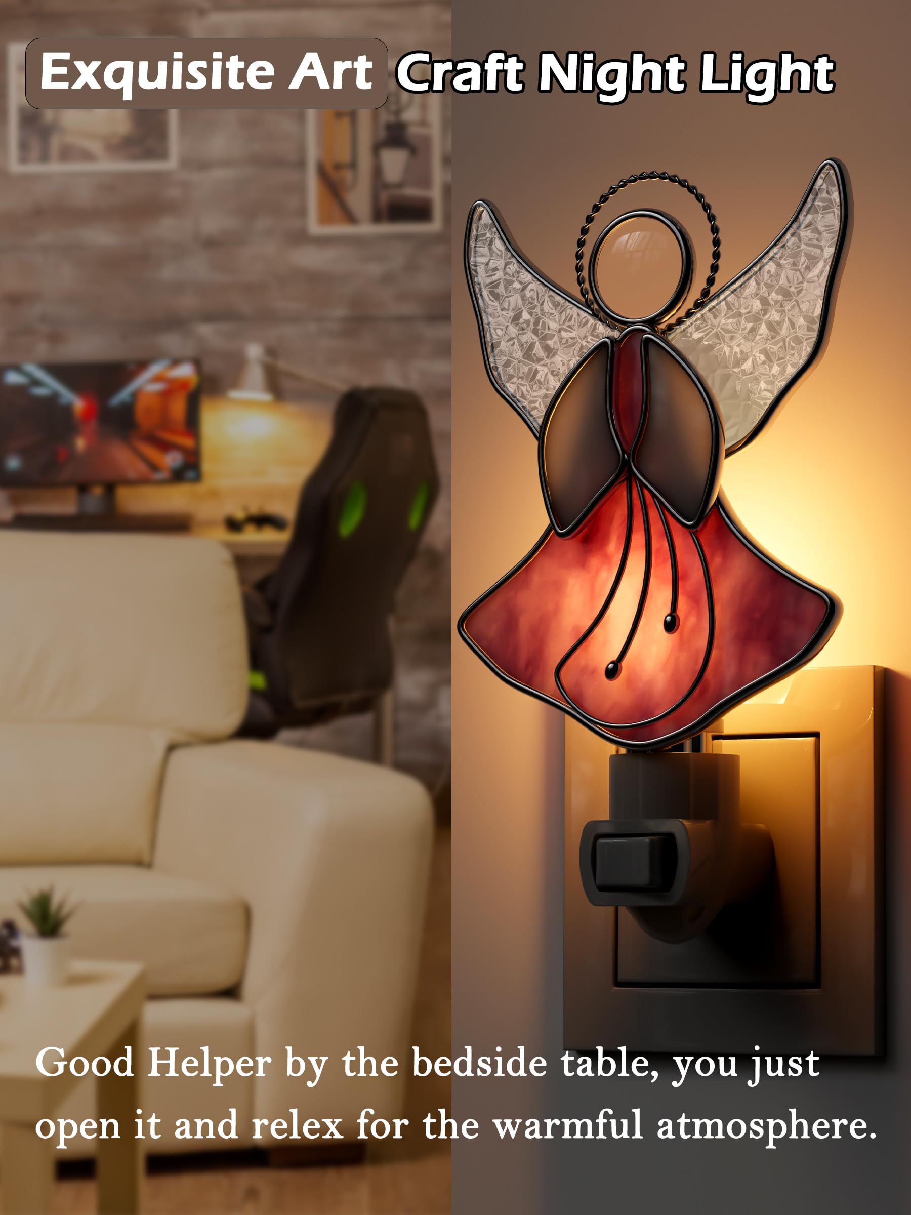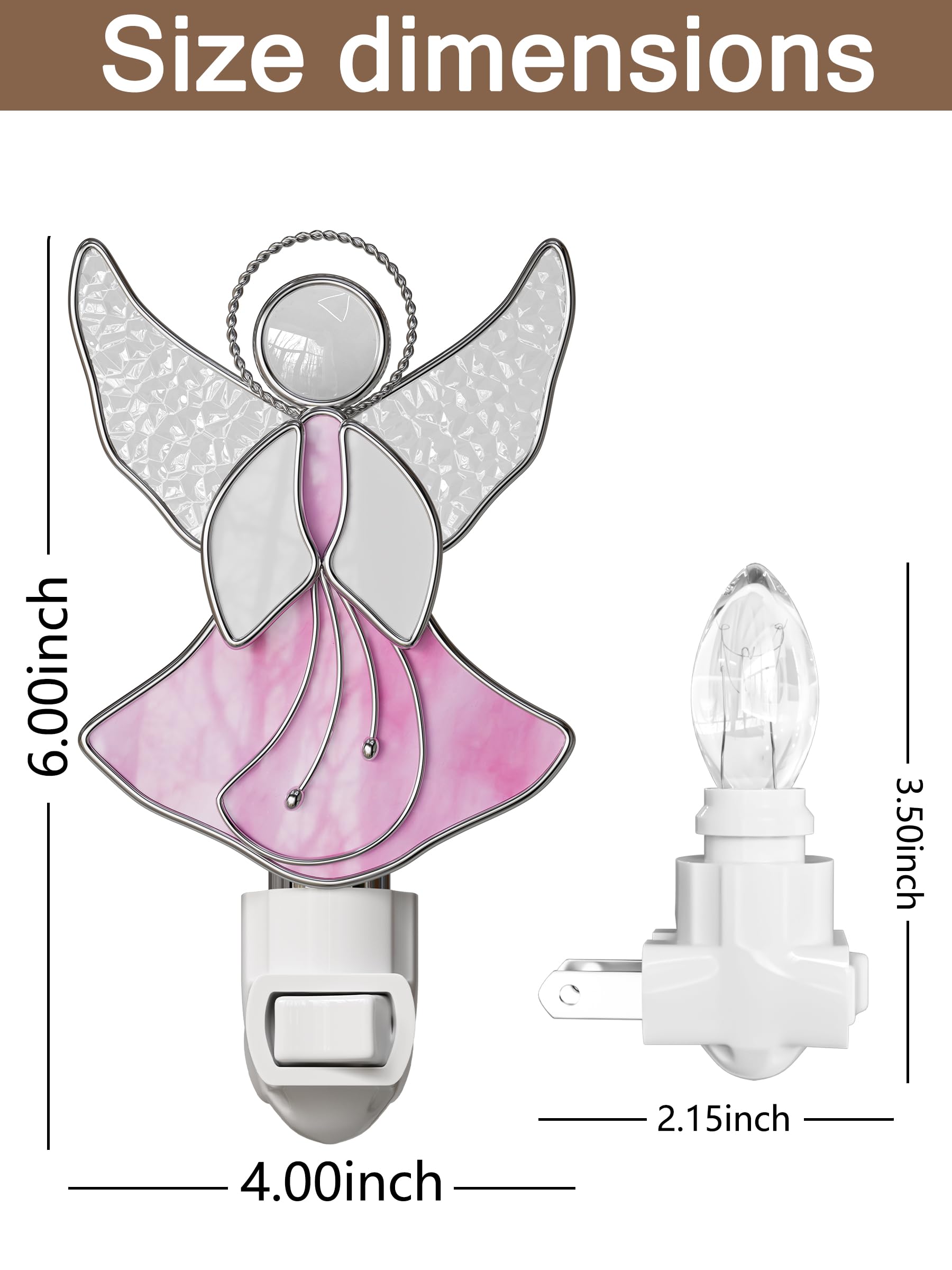 NIGHT LIGHT HANGING PAINTED FLYING ANGEL DESIGN: Angel angel night light plug in with flying wings design, the wings are made of glass polished to give a wavy surface. The head, wings and body are made of glass set by metal edges, the glass color of the body part of the angel's flying wings is calcined at high temperature to never fade, the size is about 7.5 x 10 cm/3 x 4 inches, the full length of the angel's suncatcher is about 14 cm/5 inches. The entire product is hand soldered. WIDELY USED AND TEXT DECORATION: "Pink Angel "christian night light plug in is suitable for bedroom, bathroom, hallway, kid’s room, kitchen, stairway, etc, staircase and so on, which is just the perfect night light to illuminate the place, the pendant with text is also made of metal, reasonably designed to be placed in the middle of the angel nightlight, durable and beautiful. The meaning of the text is a constant reminder of your emotions and a way for others to feel the love you bring.