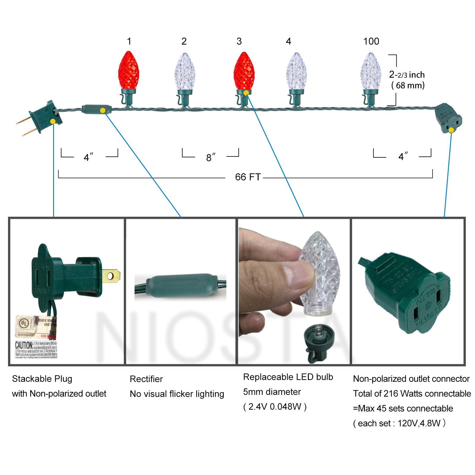 NIOSTA 66Ft LED Christmas roofline String Lights, C9 Outdoor roof String Lights with Quick Shingle & Gutter Clips,Plug in & connectable,red and White