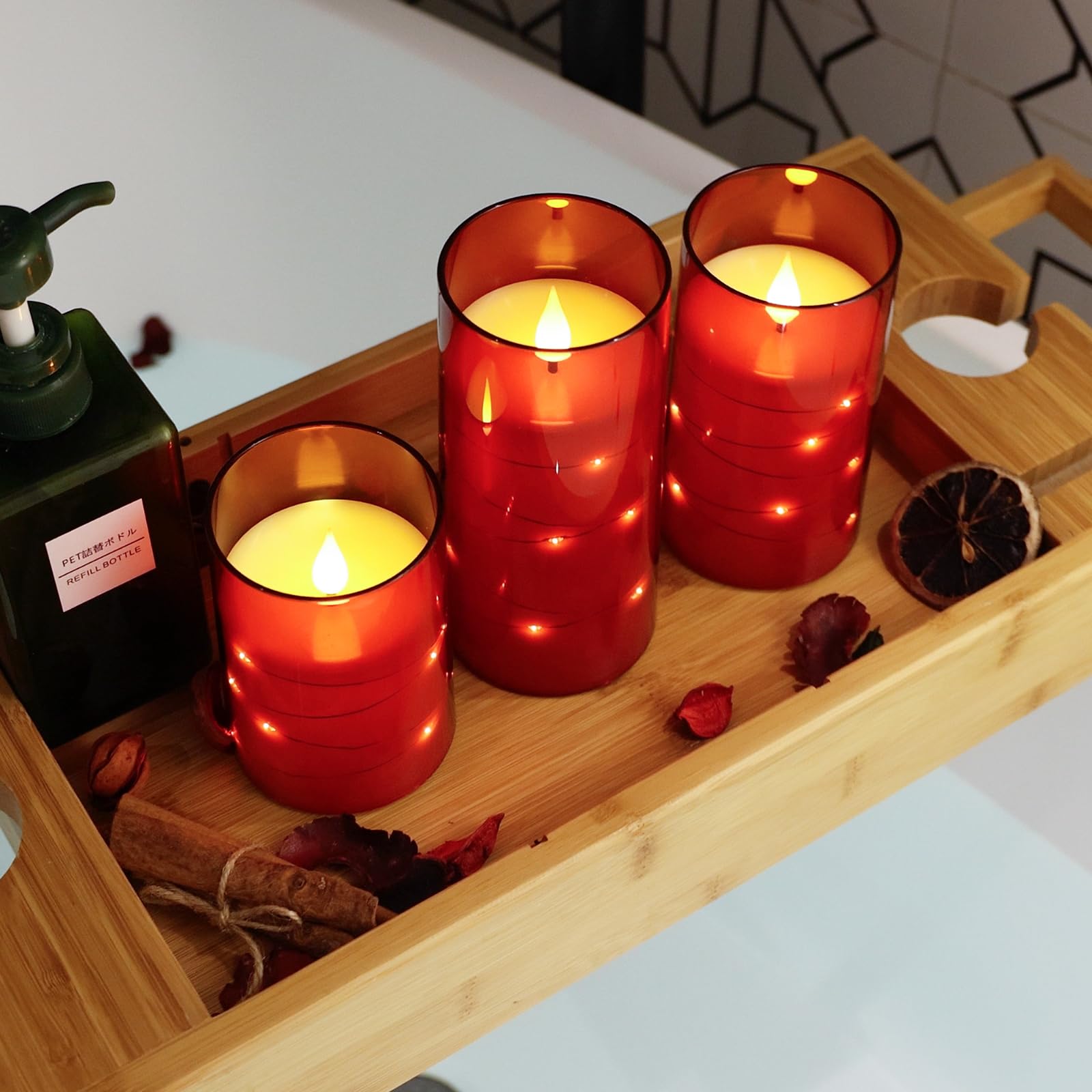 Creative Embedded Starlight String Technology - Silver metal wire strung 16 warm little stars, winding around the middle flameless candle, this unique designed acrylic shell makes the LED pillar candle light shine softer and not dazzling. While the candle bright, the string of 12 to 16 LEDs are also lit. Placed on your bedside or dinner table, the extreme warm and romantic candlelight and starlight are full of classical and noble atmosphere, real and beauty 3D Wick and Realistic Appearance, Unbreakable Design - Made of premium acrylic, 3D black wick realistic flicker design. Compared with glass radiance candles, premium imitation glass acrylic shells make the battery candles stronger and long-lasting. Through the clear shell, feels and looks like real wax pillar candle flame