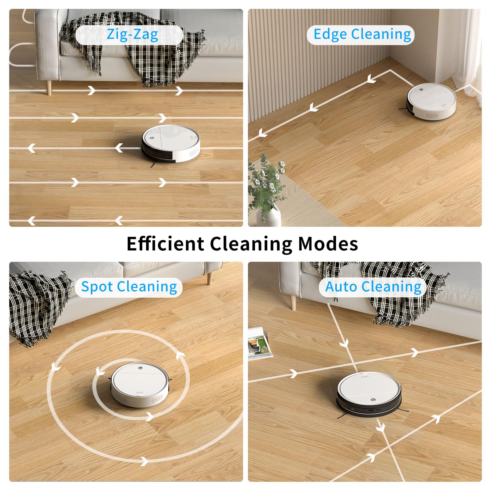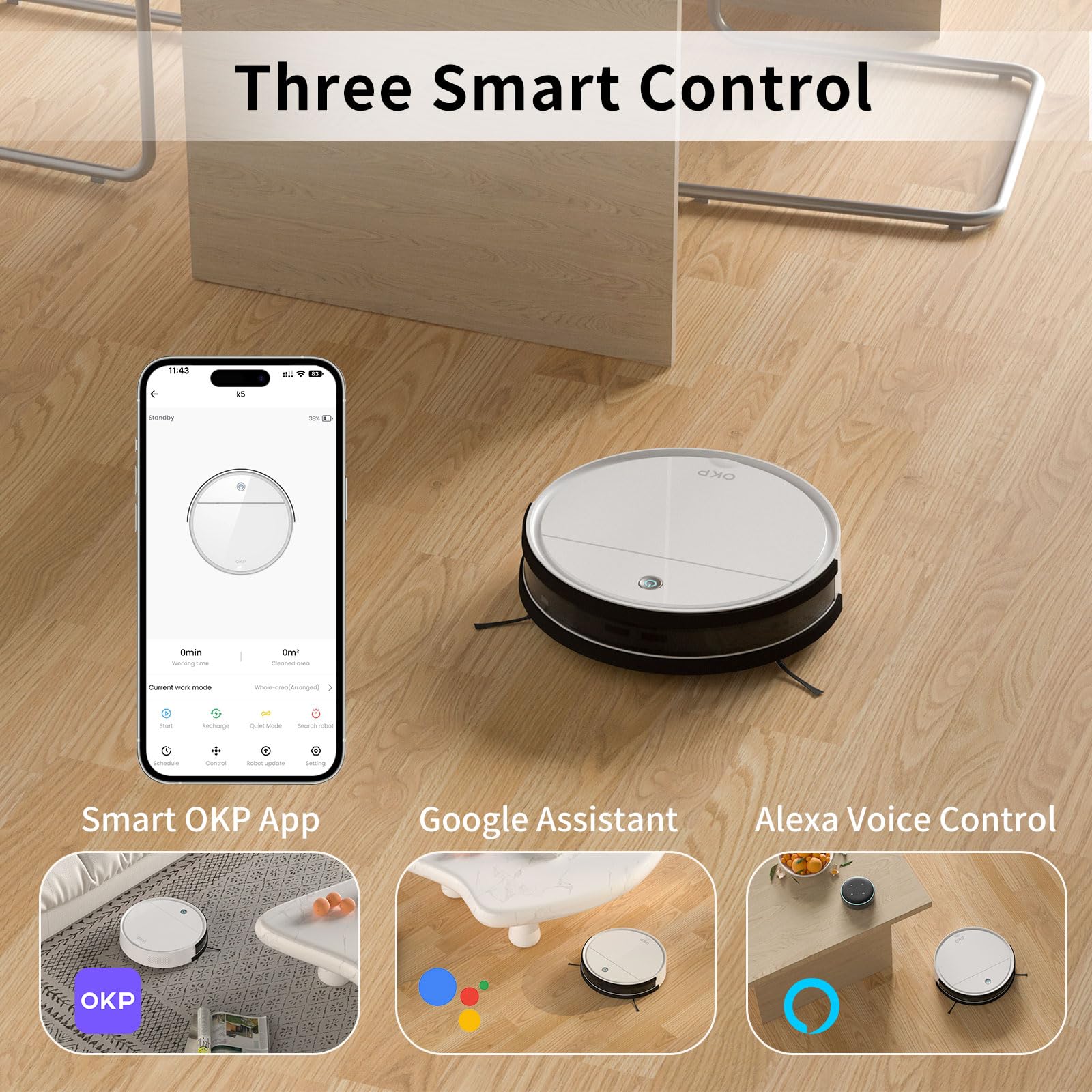 • 【Intelligent App & Voice Control】With the OKP application, you can easily create a cleaning schedule for your home, change cleaning modes, and control the cleaning direction. This automatic vacuum cleaner robot is also compatible with Alexa and Google Assistant, allowing users to start and stop cleaning with voice commands.