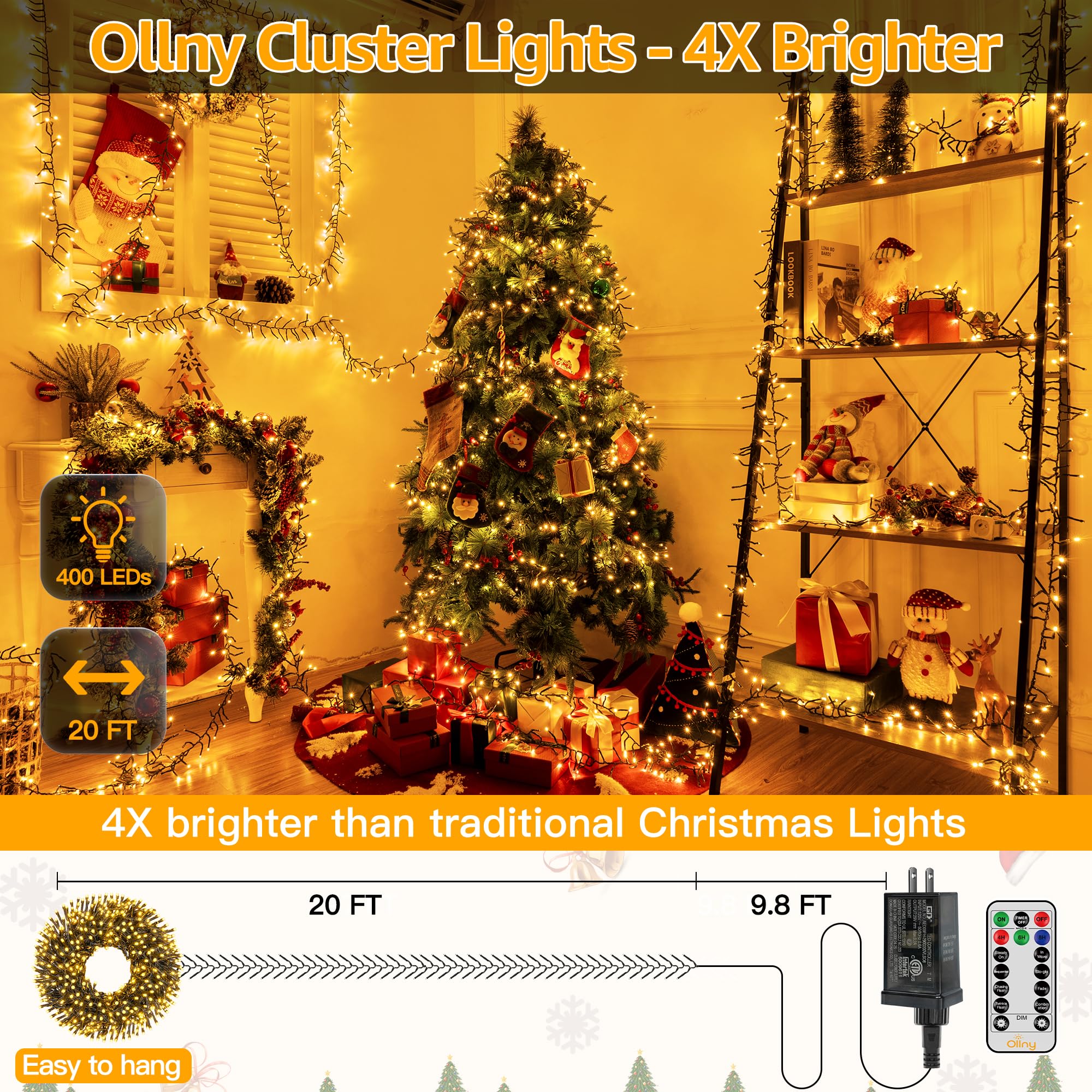 4X Brighter and Connectable: 400LED/20FT, and 9.8ft lead wire, Ollny Cluster lights can end-to-end connect up to 3 sets, almost 1200LED/60FT, which are long and bright enough to illuminate your Christmas trees, wreaths, mantelpieces, fences, house 8 Modes & Easy to Install: Choose from 8 different lighting modes: steady on, slow fade, in waves, slow glow, chasing/flash, sequential, flash, and combination. Easy to string these dark green wire Christmas tree lights blend well into the Christmas tree