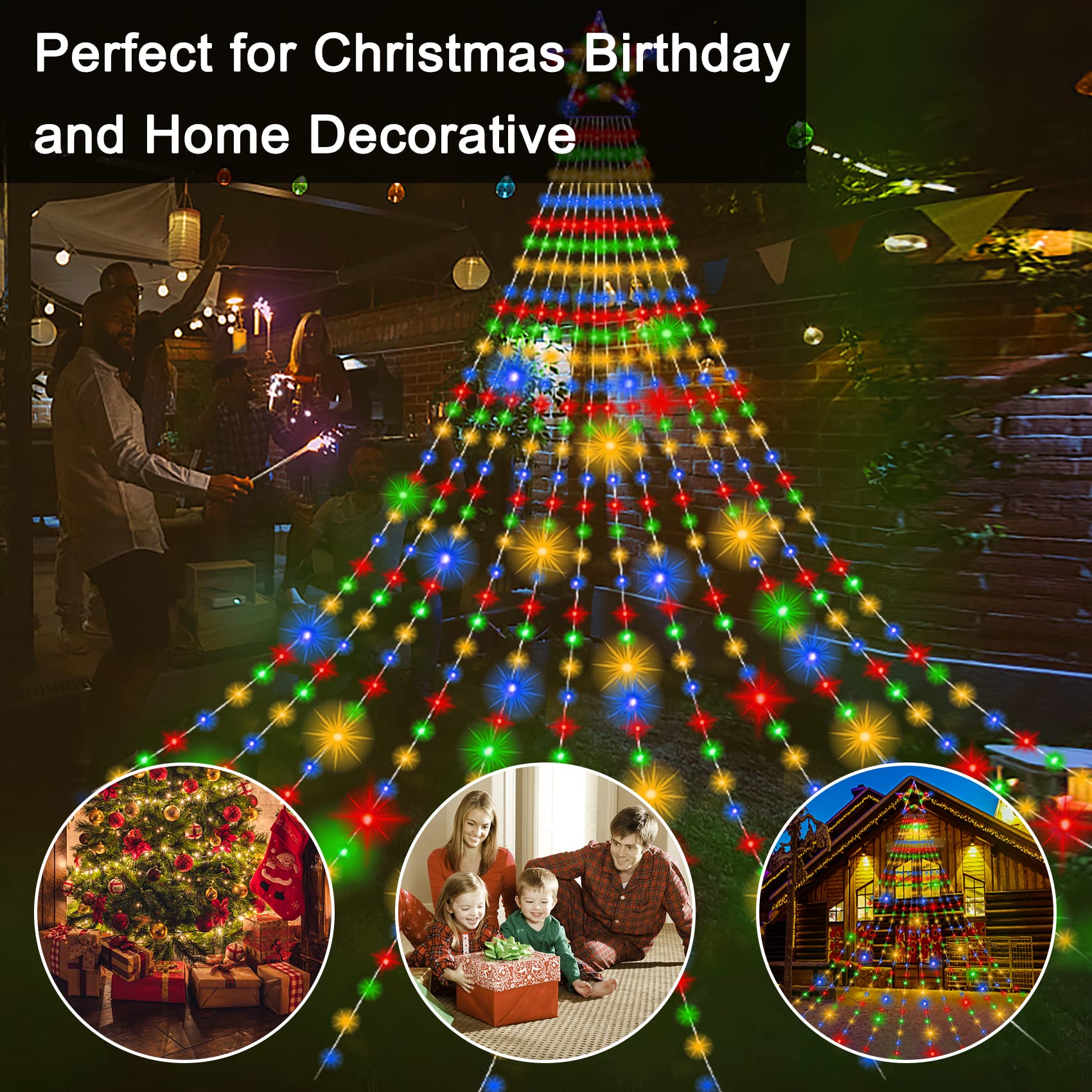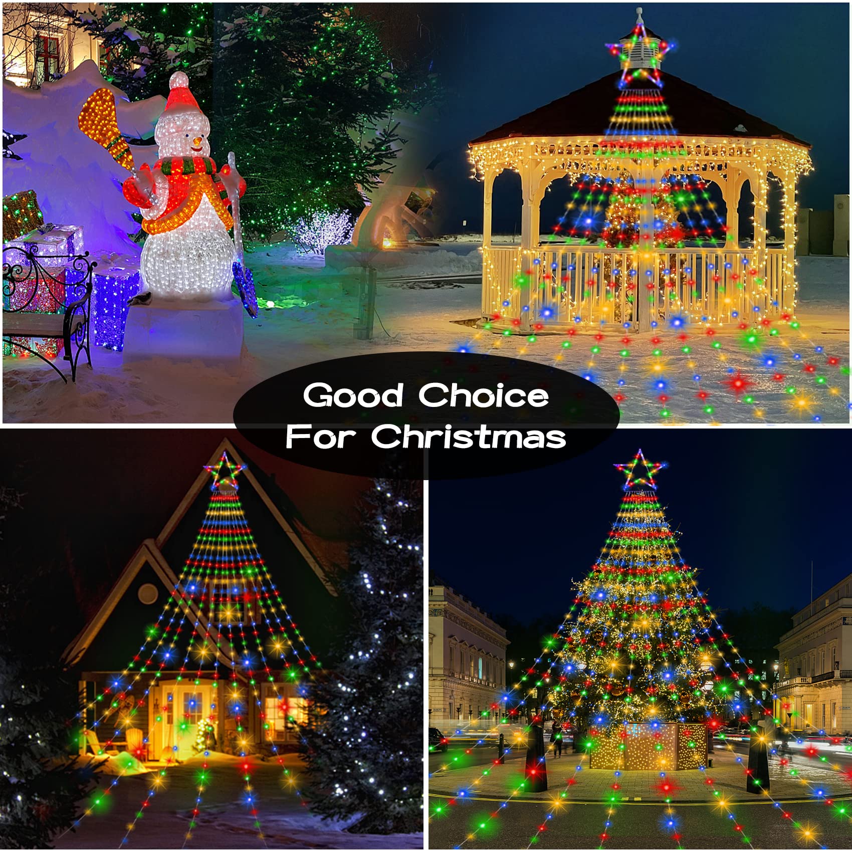 Outdoor Christmas Lights: 860 LED light, 1 top star with 12 strand string lights, the star ornaments diameter is 12 IN Each string lights length: 23ft Plug cable length: 33ft Easy to unfasten and hang Warm and clear lights will bring your good atmosphere IP44 Outdoor Waterproof: Christmas lights are made of high quality copper wire, IP44 waterproof and designed to withstand harsh environmental elements The plug has been by UL to ensure maximize safety But please note that the Plug is not waterproof