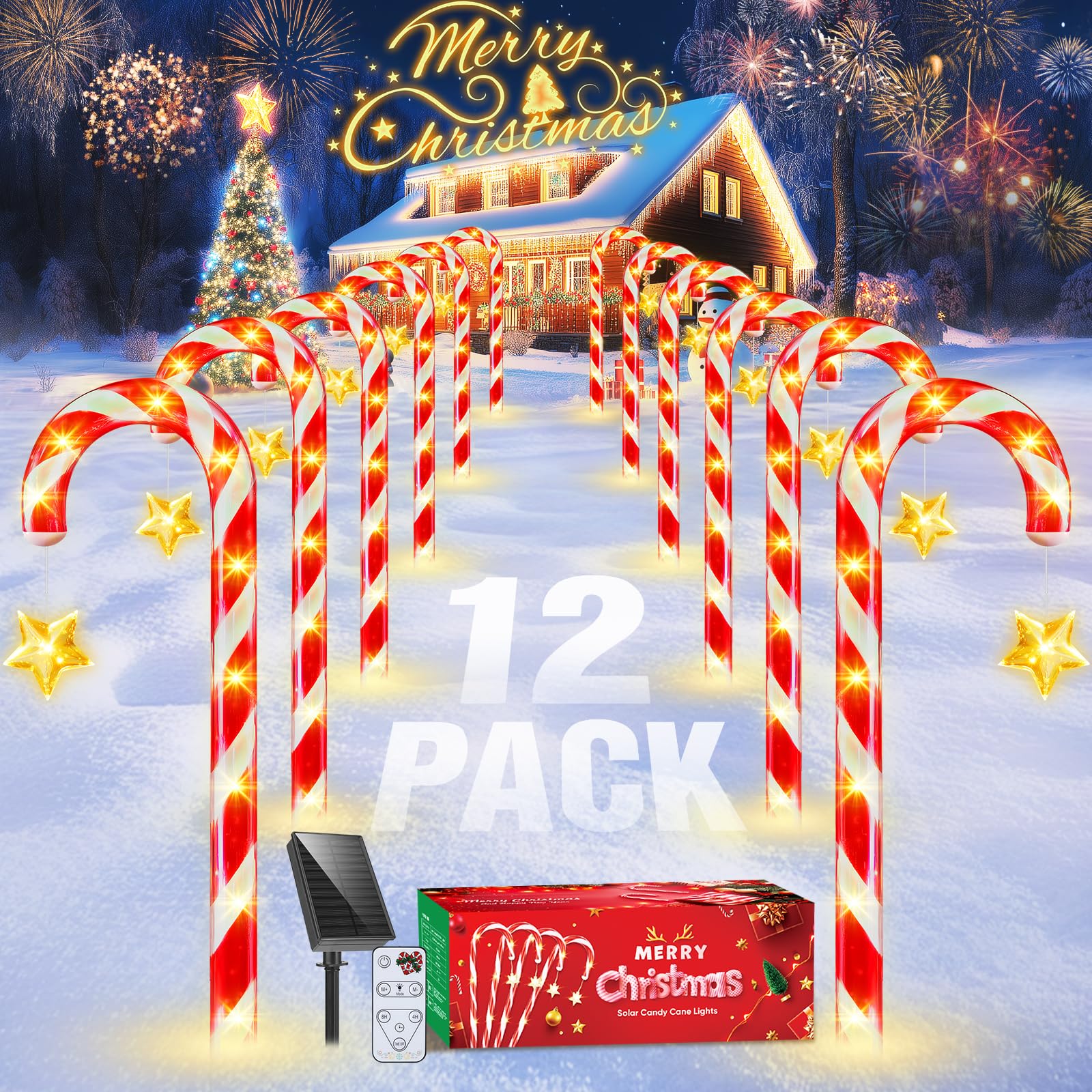 Outdoor Christmas Decorations: 12 Pack Solar Christmas Candy Cane Lights Waterproof, Christmas Pathway Lights with Remote Control & 8 Modes, Christmas Outdoor Decorations for Yard, Walkway Xmas Decor