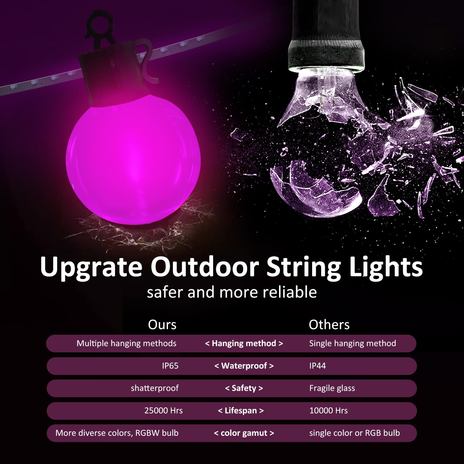 【26 Light Colors】:Our outdoor party lights feature 16 solid colors + 5 multi-colors + 8 flashing modes, making operation simple and convenient. You can easily control the LED color changing string lights through buttons on the power cord or with a remote control, adjusting dynamic modes like fade, jump, auto, and flash. Choose your favorite mode to create a relaxed and romantic atmosphere for holidays and gatherings 【IP65 Waterproof and Shatterproof】:The Lotalot string lights are IP65 waterproof, capable of withstanding rain, snow, and extreme temperatures. Made from durable, impact-resistant plastic, they are superior to 90% of traditional outdoor string lights, being less prone to breakage when dropped. This ensures safety without concerns about glass shards, making them ideal for outdoor use.