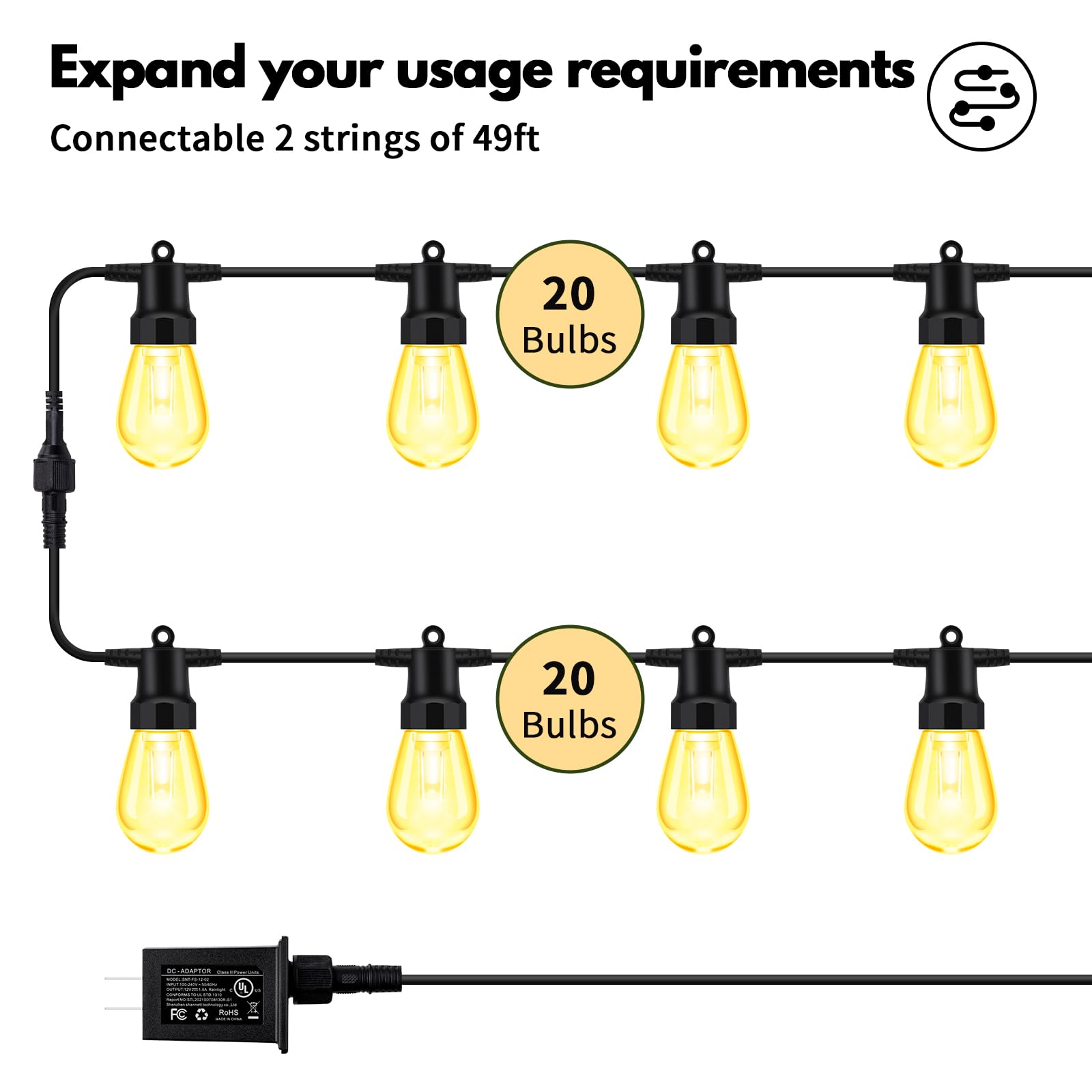 • Connectable Hanging Patio Lights for Effortless Installation: The 49ft patio lights can be linked with up to 2 strings, enabling you to extend these outdoor hanging lights to a remarkable 98ft. With hanging holes ranging 0.39 inches, you can easily suspend the string lights on walls, cafes, gardens, or backyards.