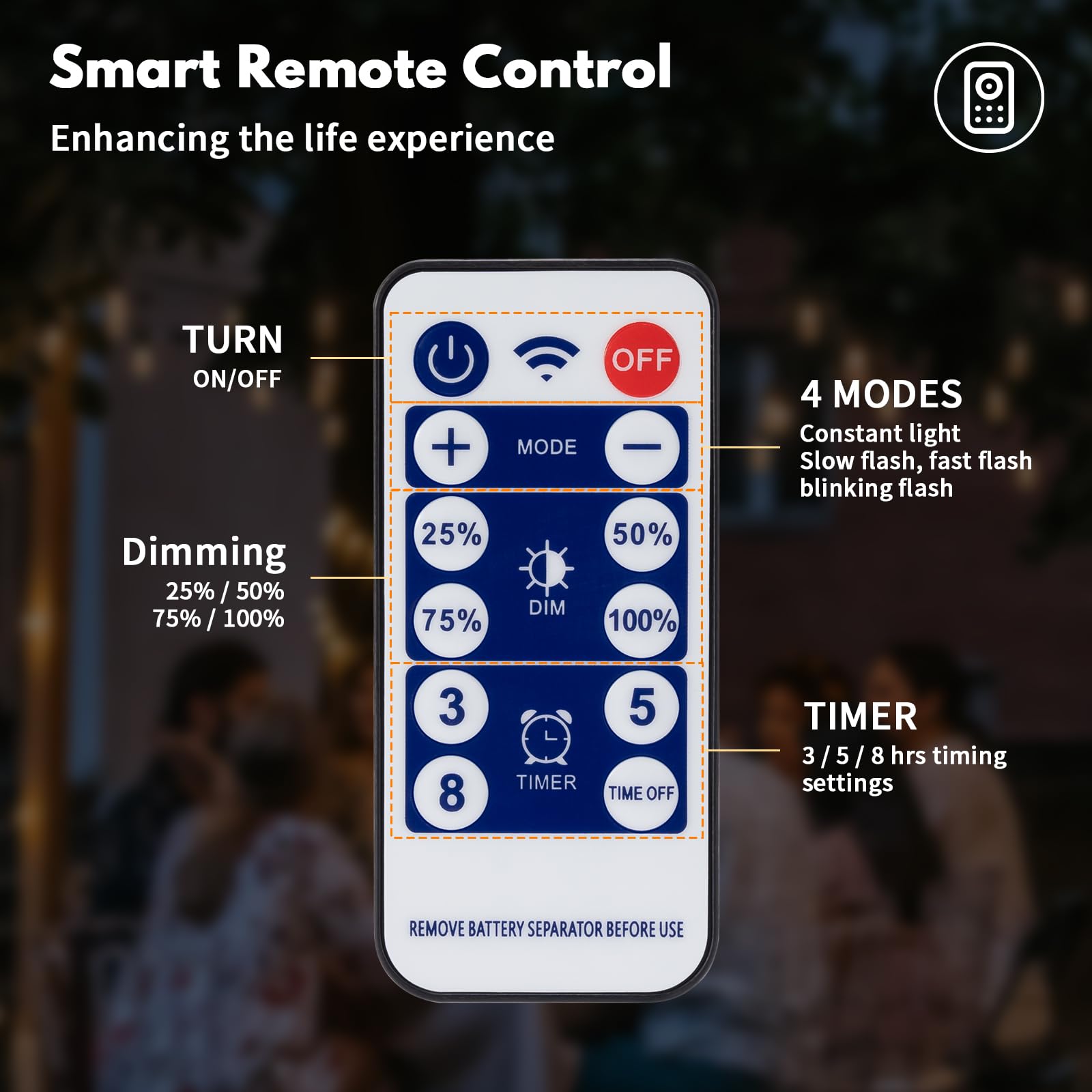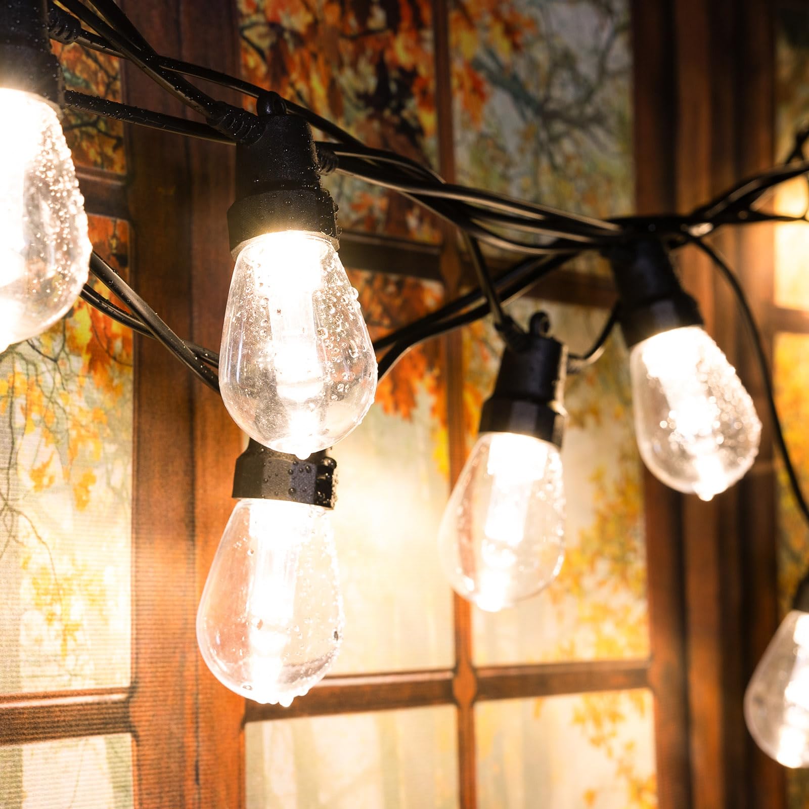 Outdoor String Lights with Remote Control: Say goodbye to outdated dimmers YAIYAN patio lights come with a remote that 4 brightness levels (25%, 50%, 75%, and 100%). You can set them to stay on for 3, 5, or 8 hours. Choose from 4 lighting effects, making them suitable for various scenarios. (You can also adjust the light mode using the button on the socket.) IP65 Waterproof Protection: The outdoor lights are waterproof, sunproof, snowproof, and the spacing between bulbs is about 2.18 ft, making them ideal for outdoor lighting. Experience year-round enjoyment of waterproof patio lights, unaffected by any weather conditions. Please note, the adapter is not waterproof.